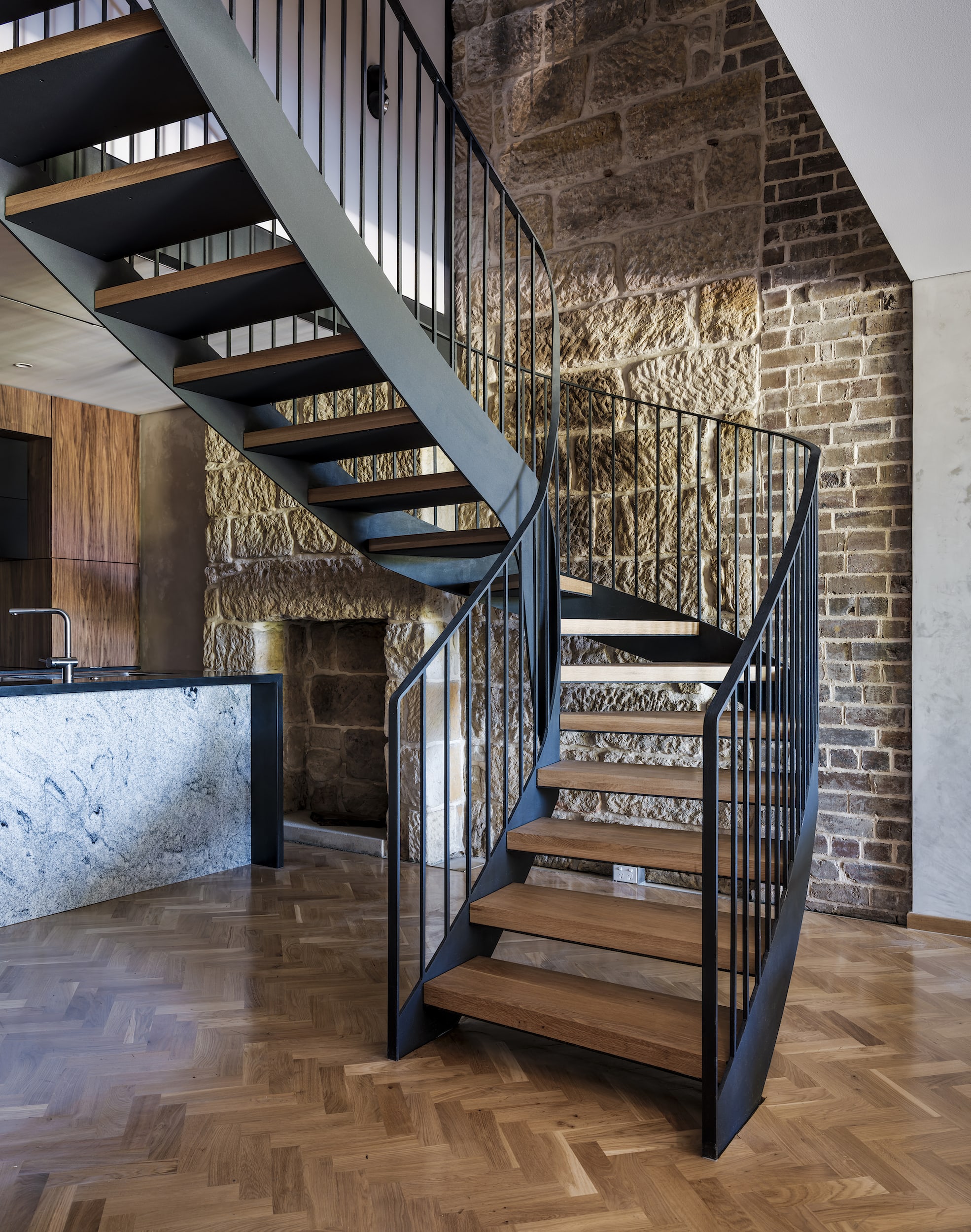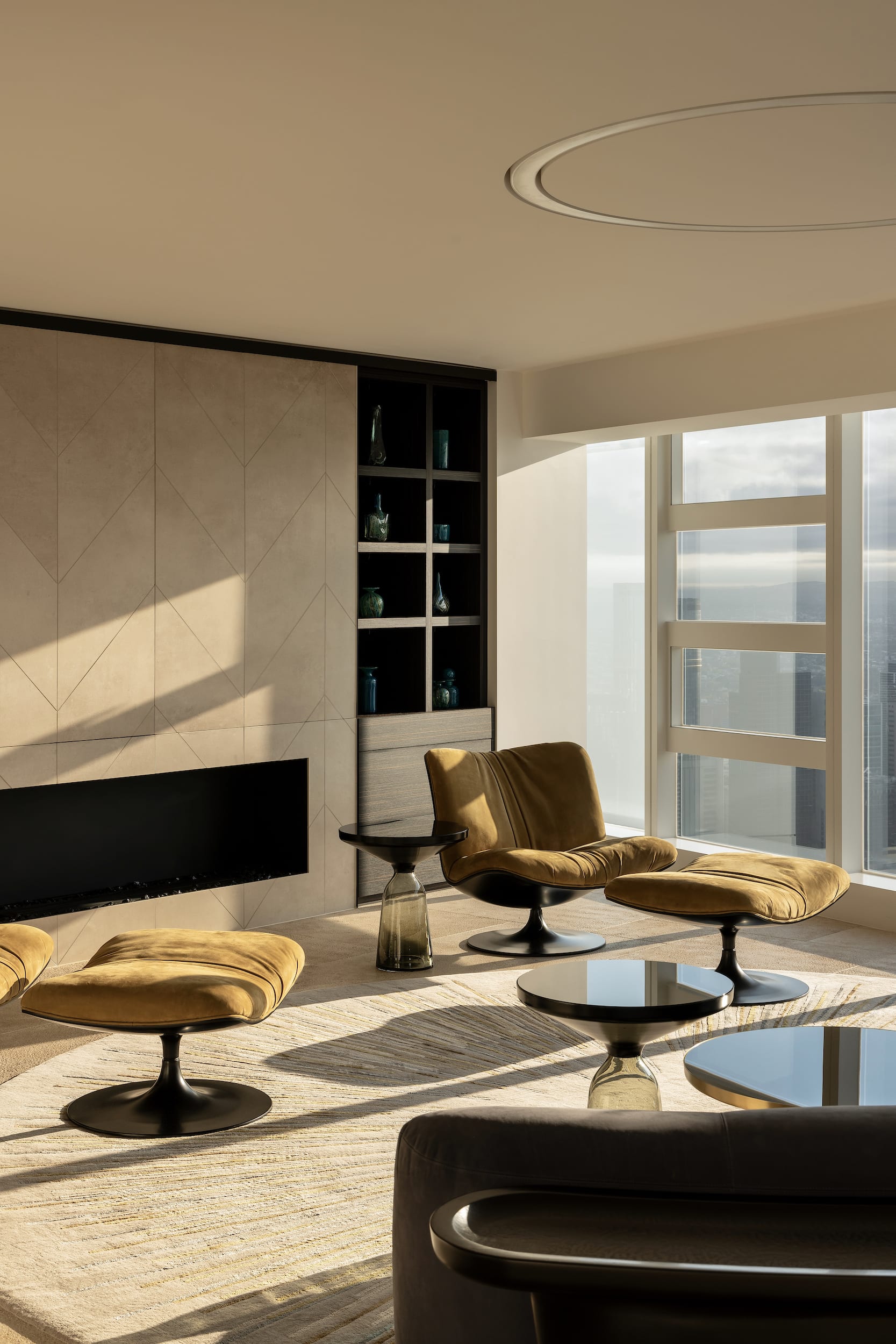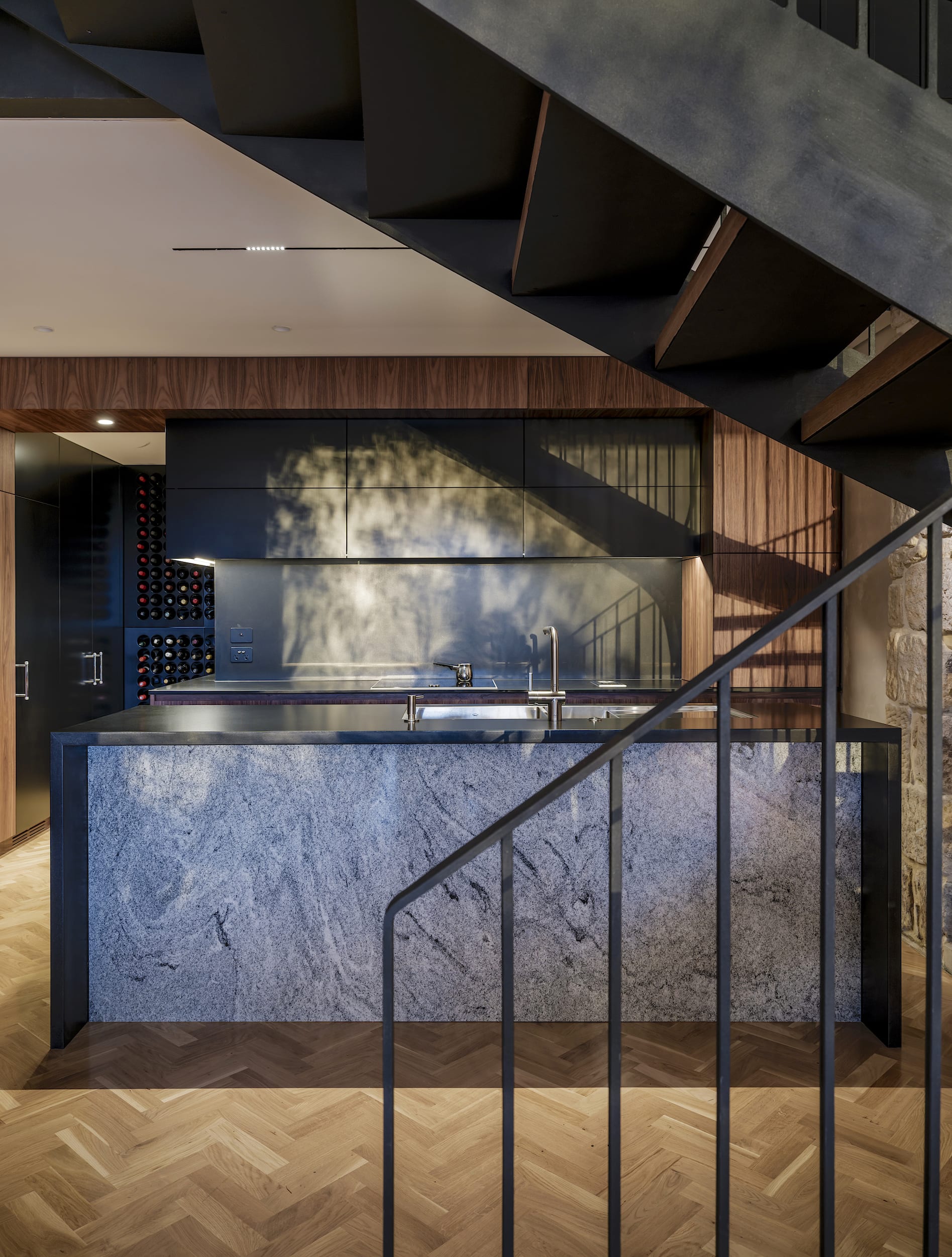 Deep, moody tones and sculptural, textured shapes, punctuated by richly veined marble elements, define the spaces of this Brooklyn, New York townhouse