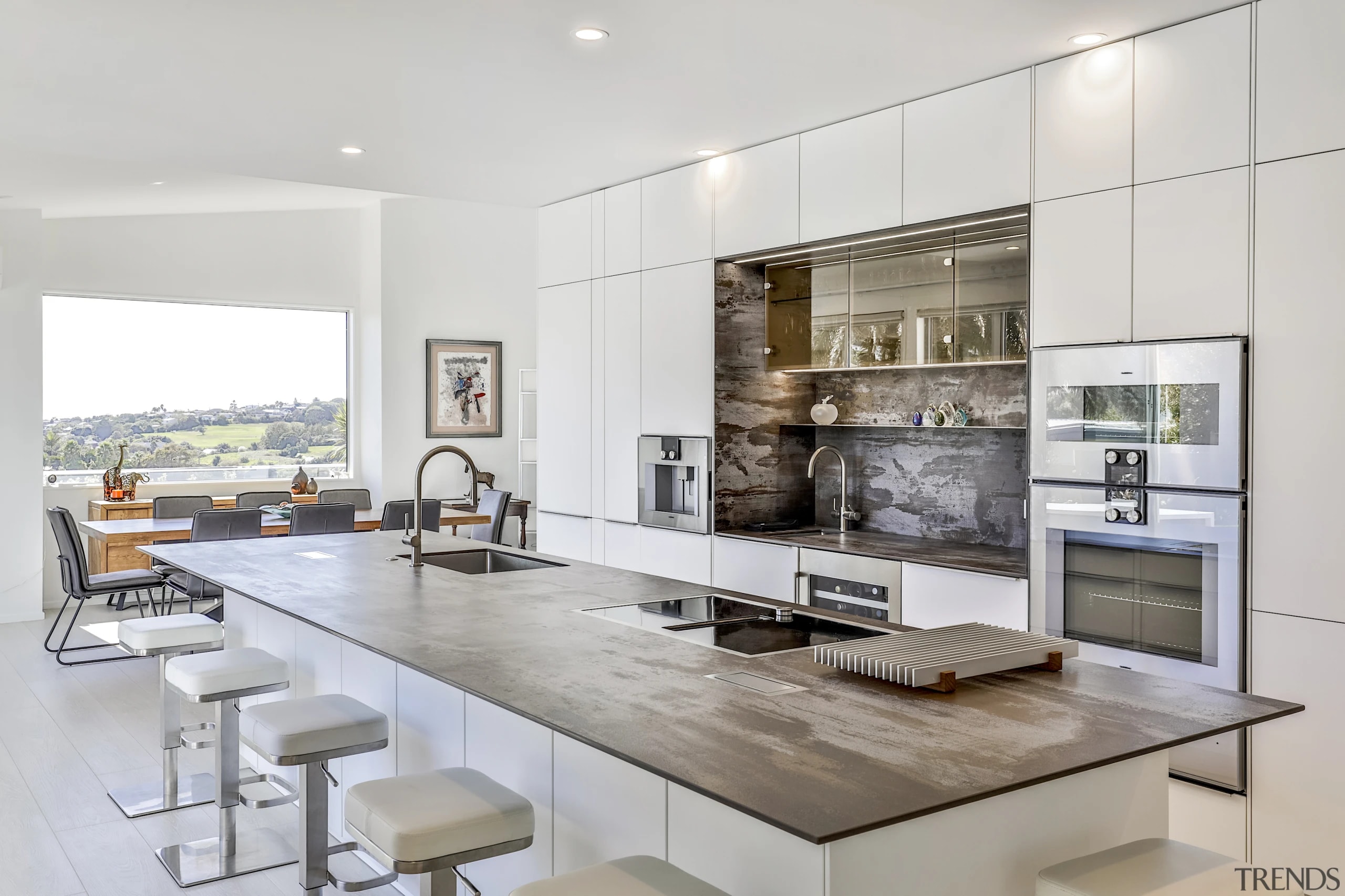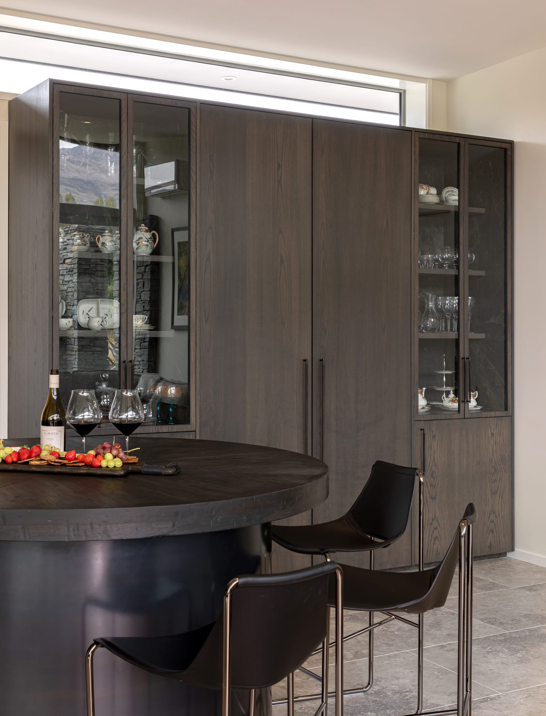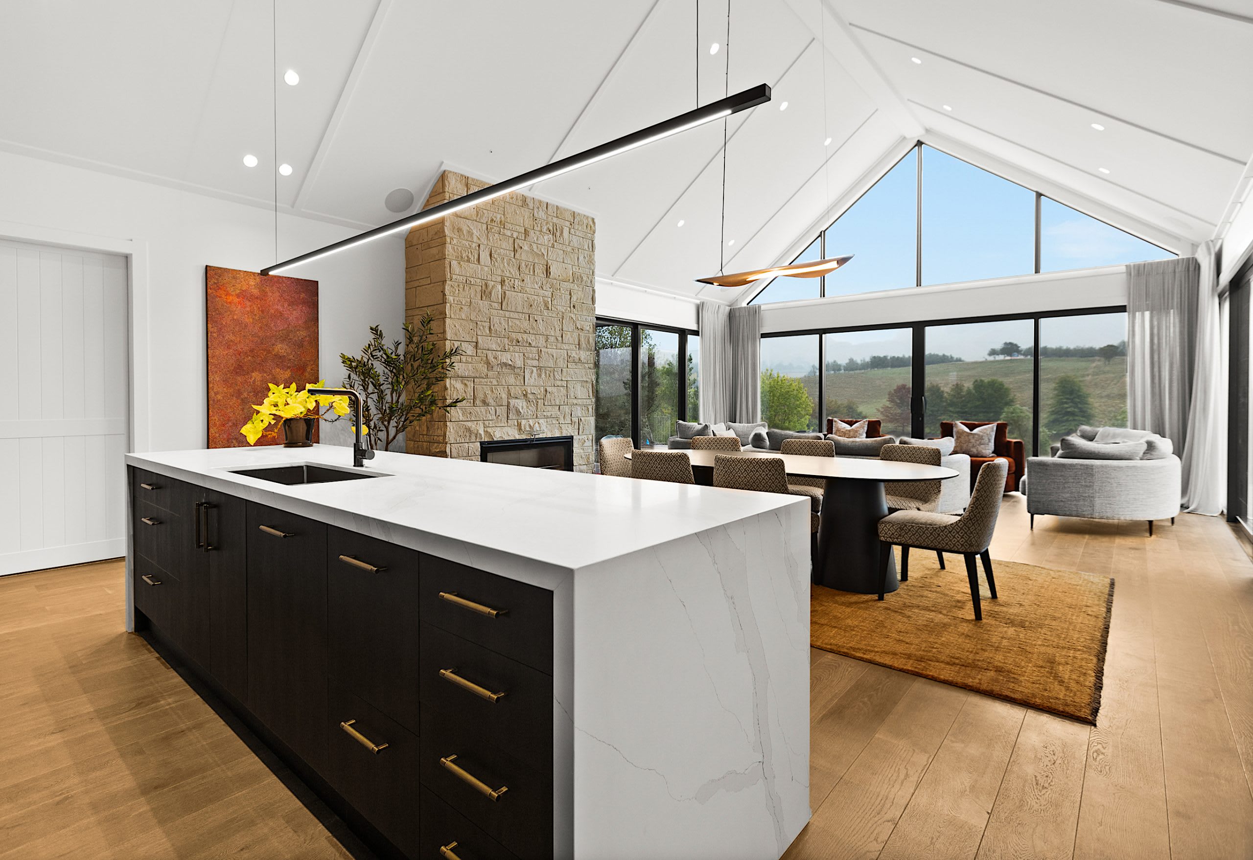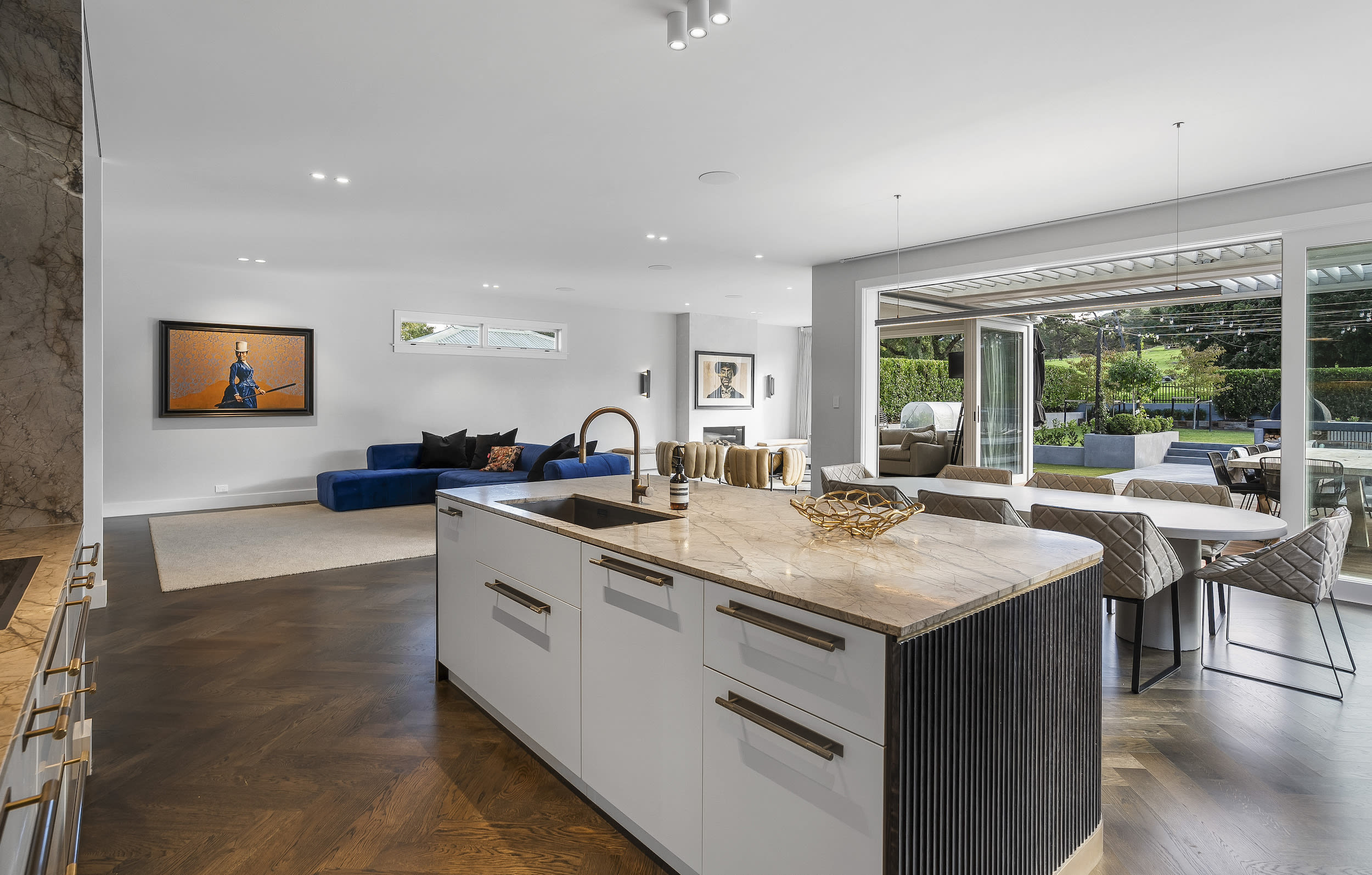 This kitchen is at the centre of the interior – balanced colour and textures set the scene while a stone and wood island is a leading feature – a comprehensive scullery keeps the kitchen proper looking its best
