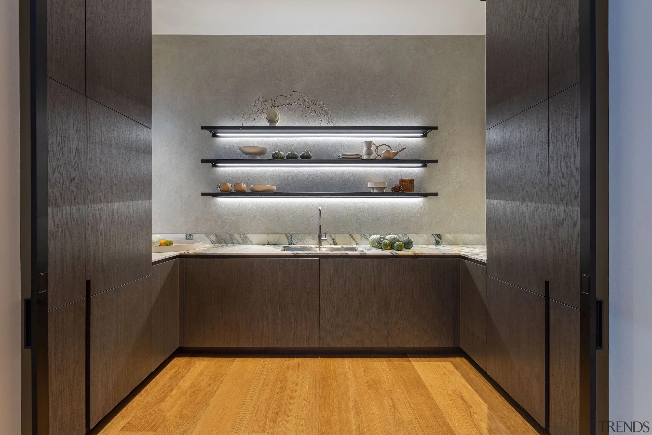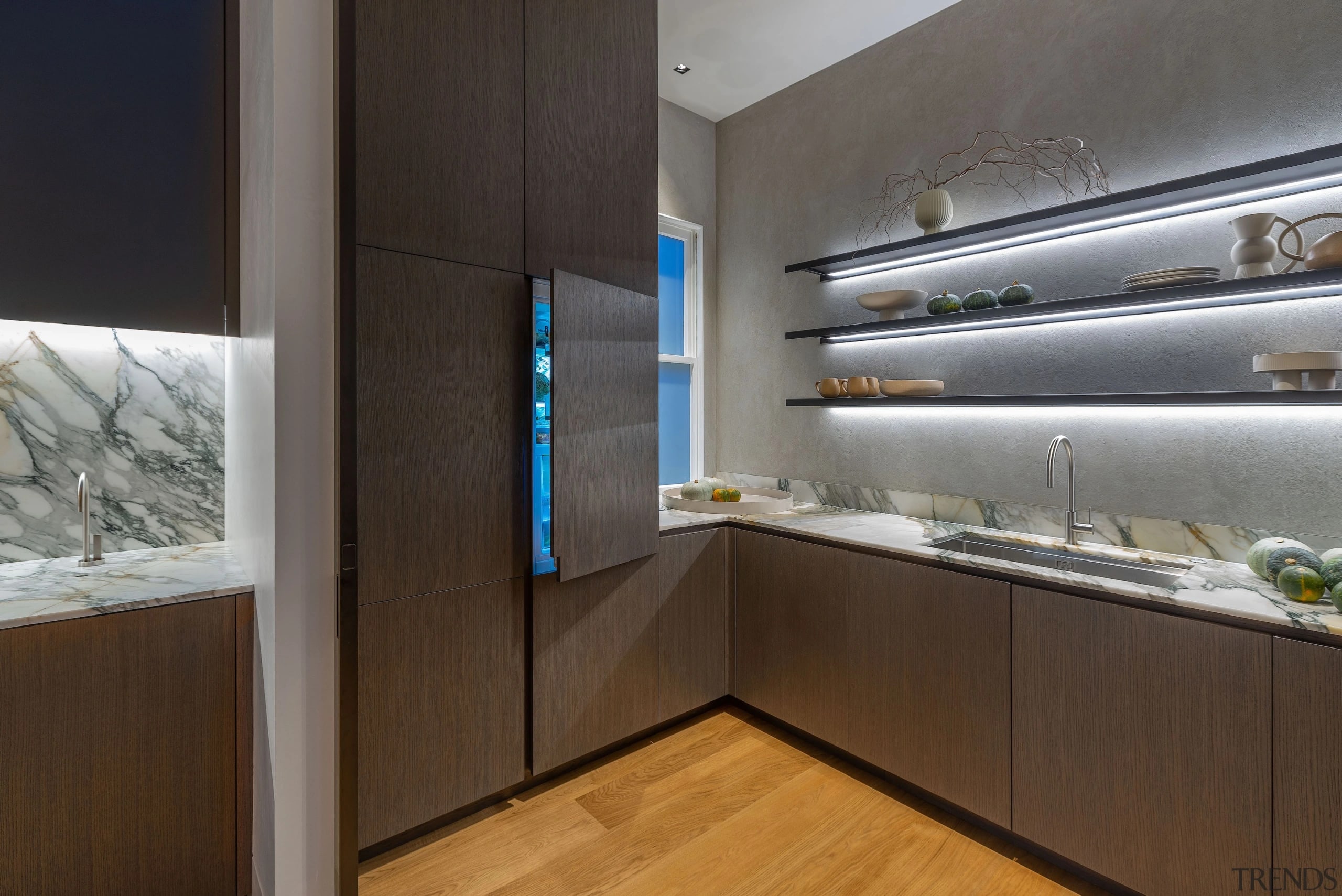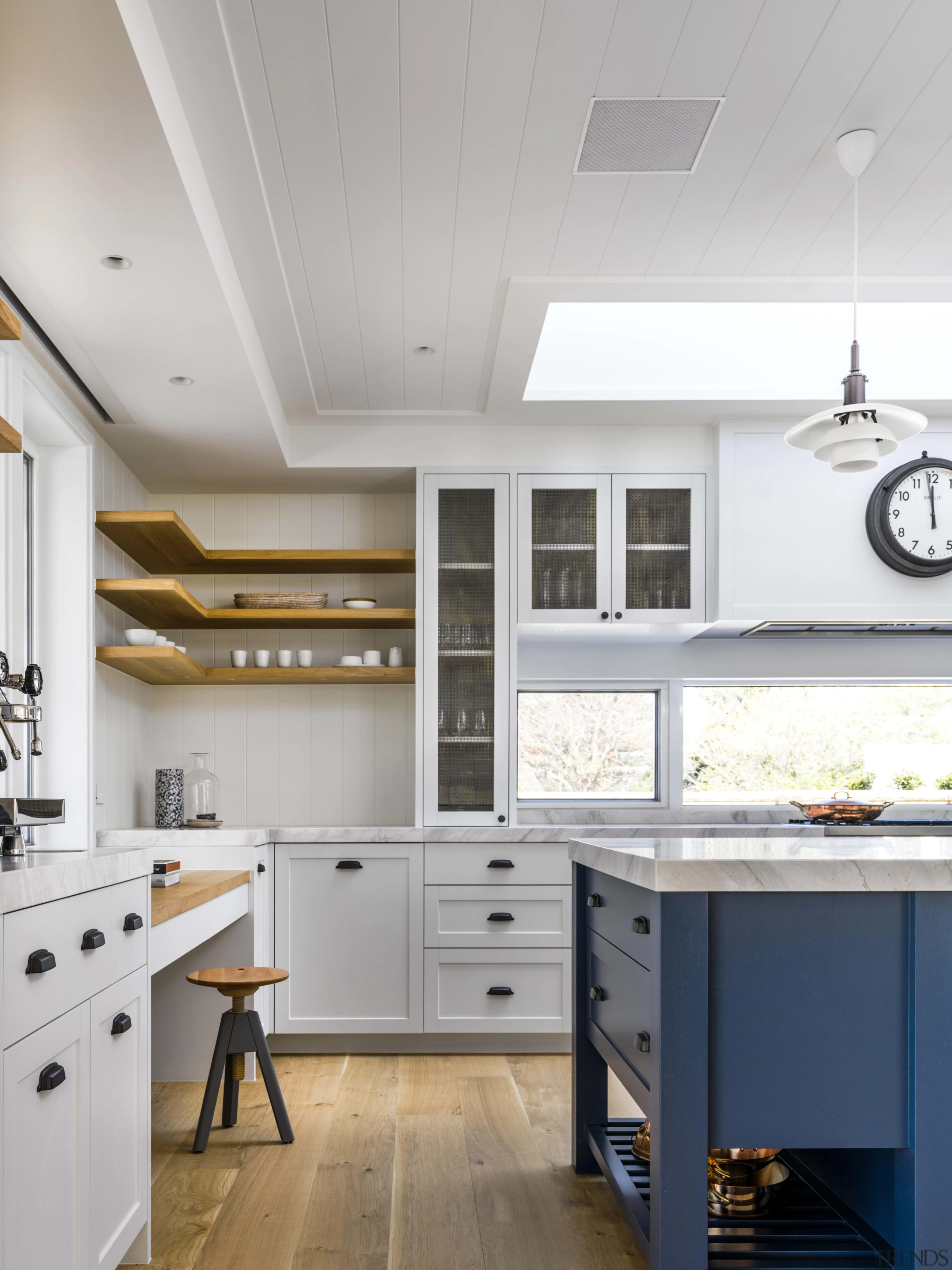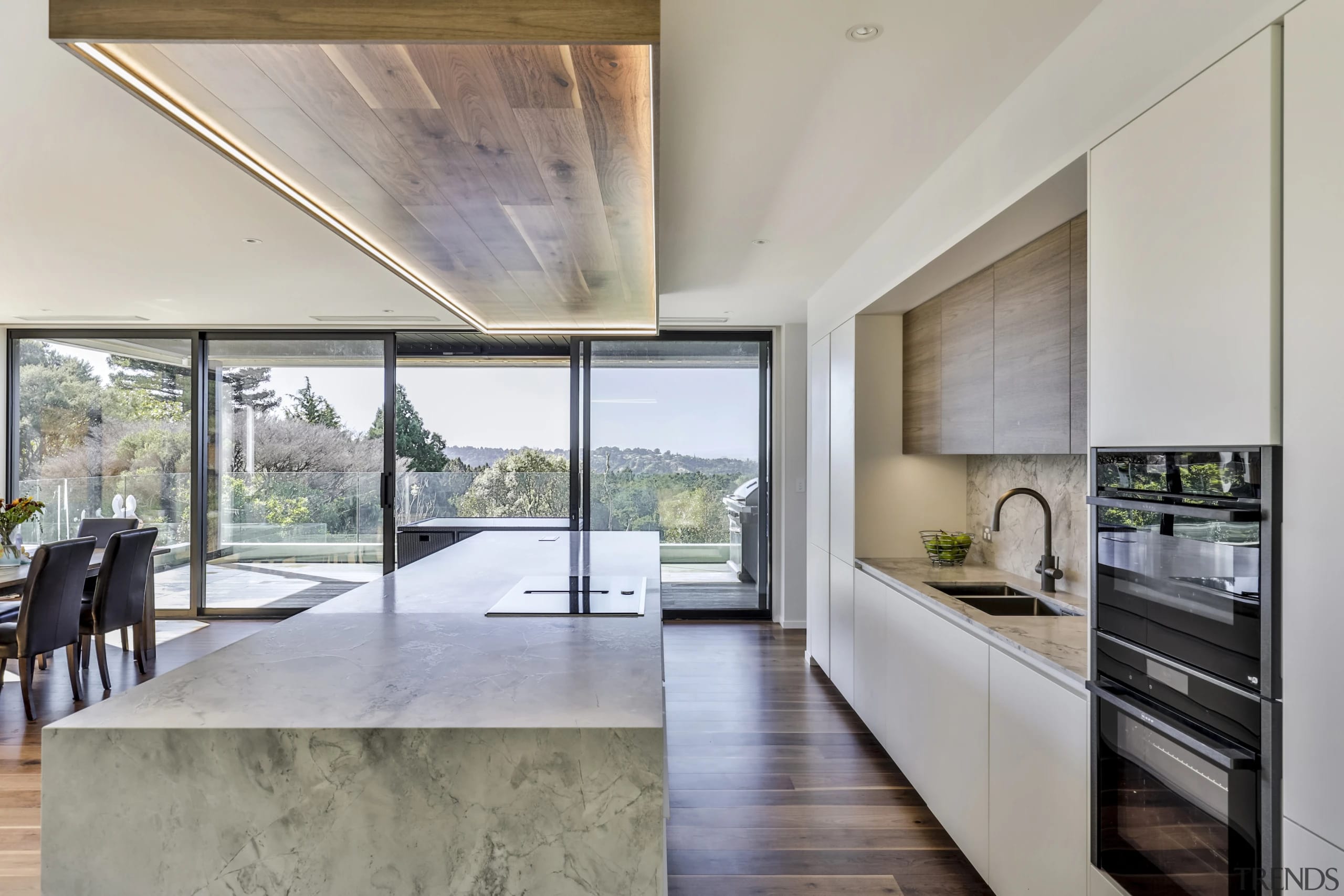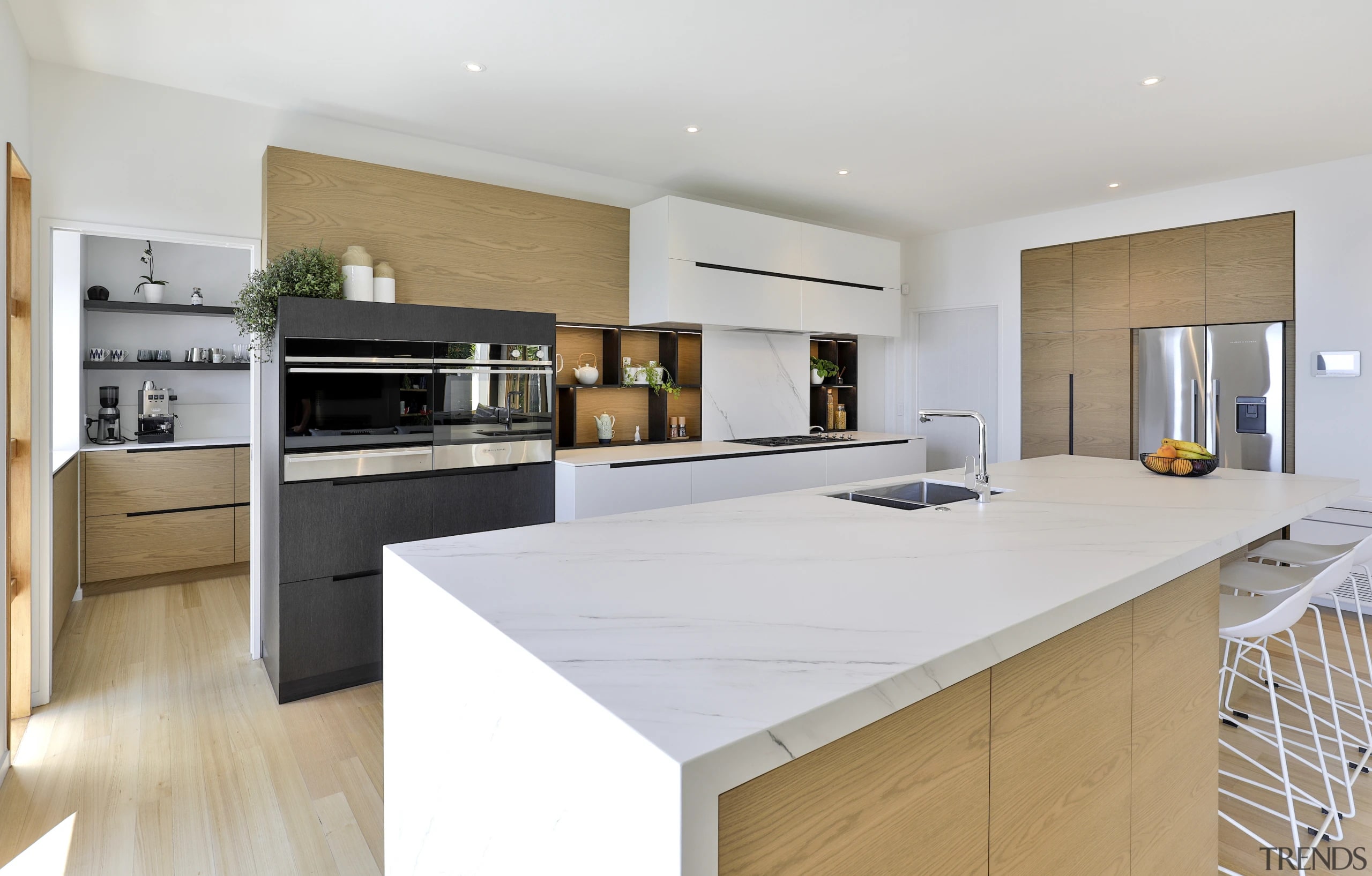 This kitchen is at the centre of the interior – balanced colour and textures set the scene while a stone and wood island is a leading feature – a comprehensive scullery keeps the kitchen proper looking its best