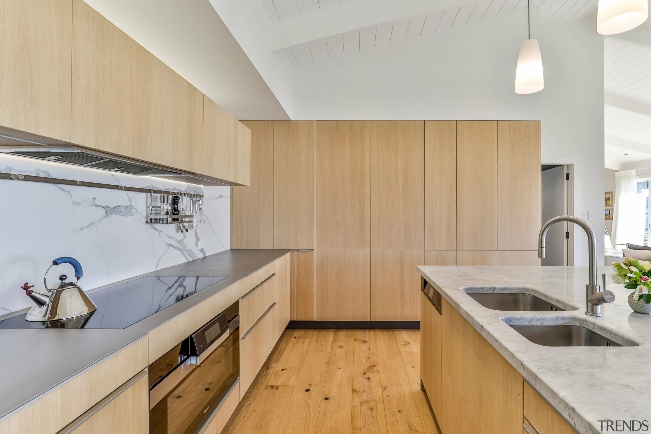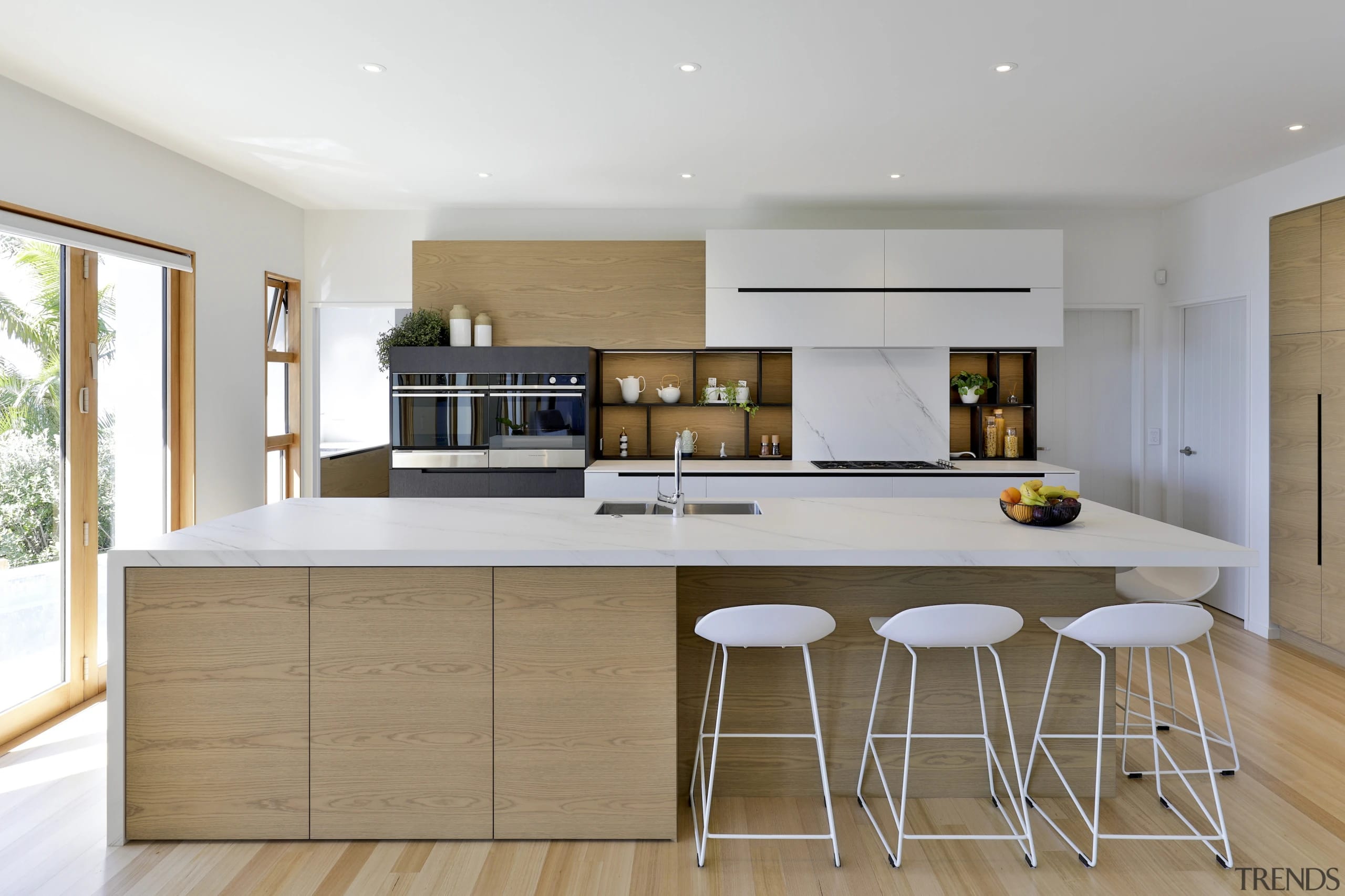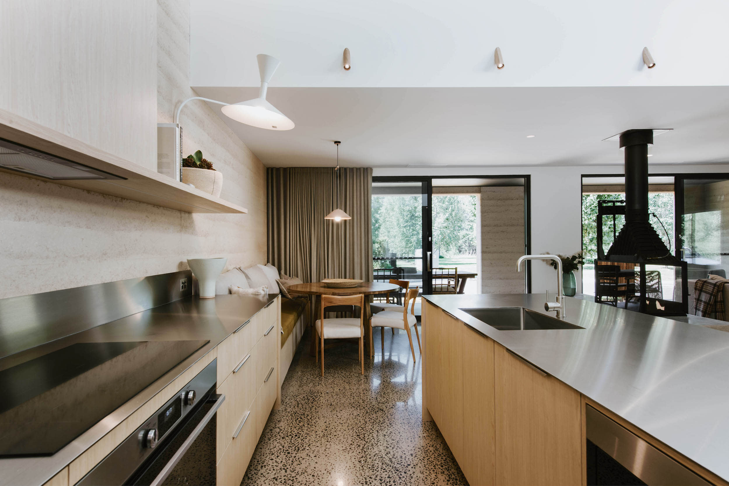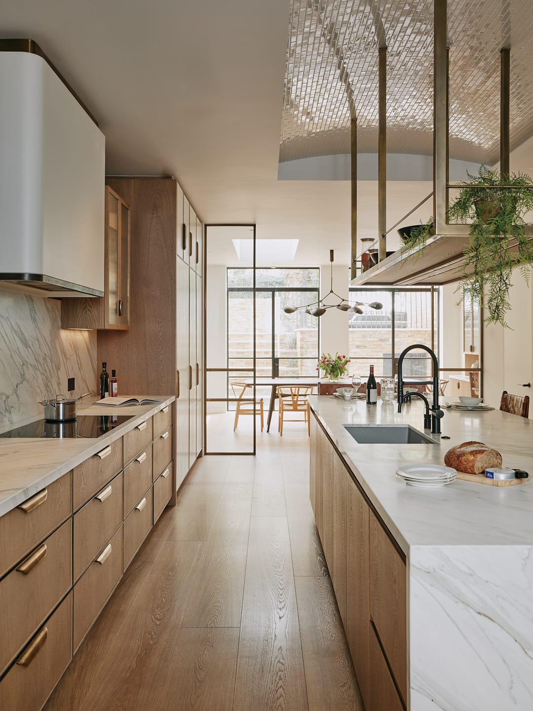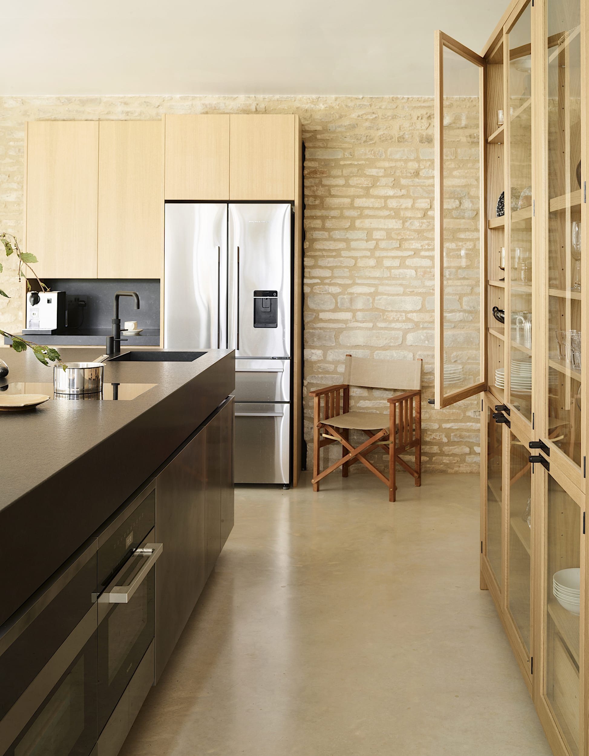 This modern, light-toned kitchen celebrates natural finishes and connects with its surrounding spaces functionally and aesthetically.