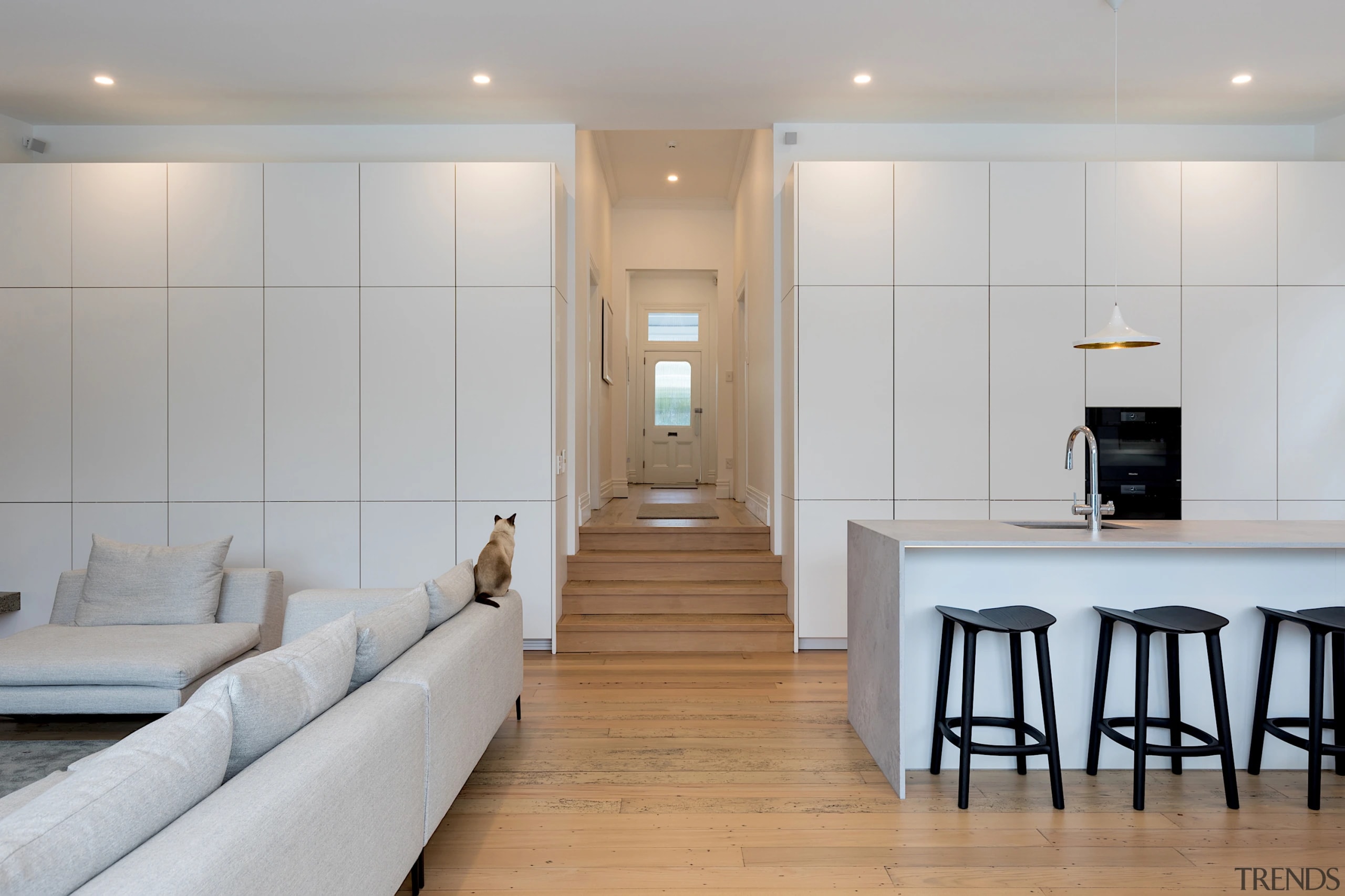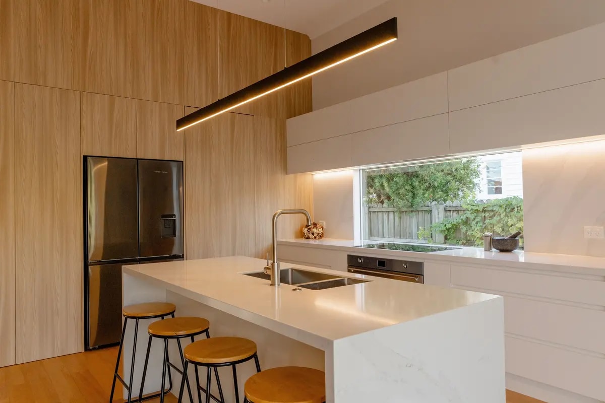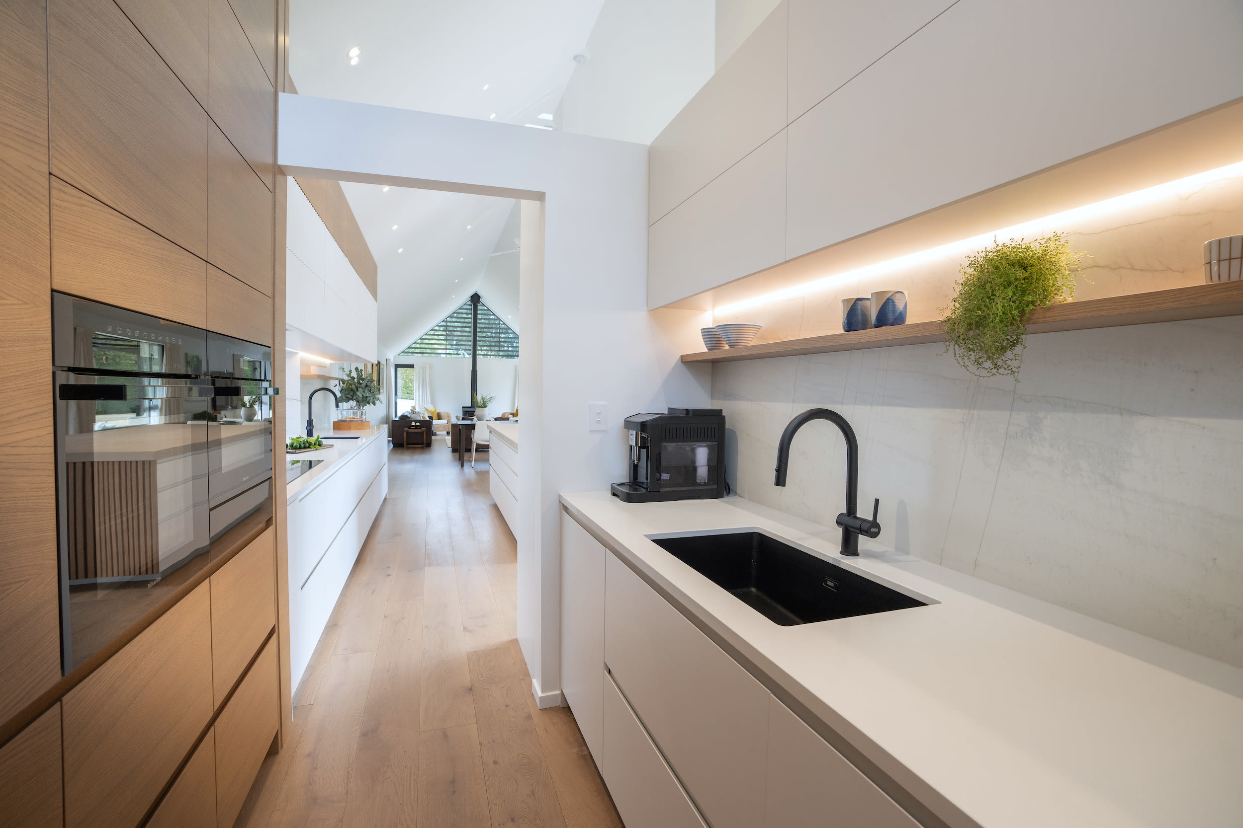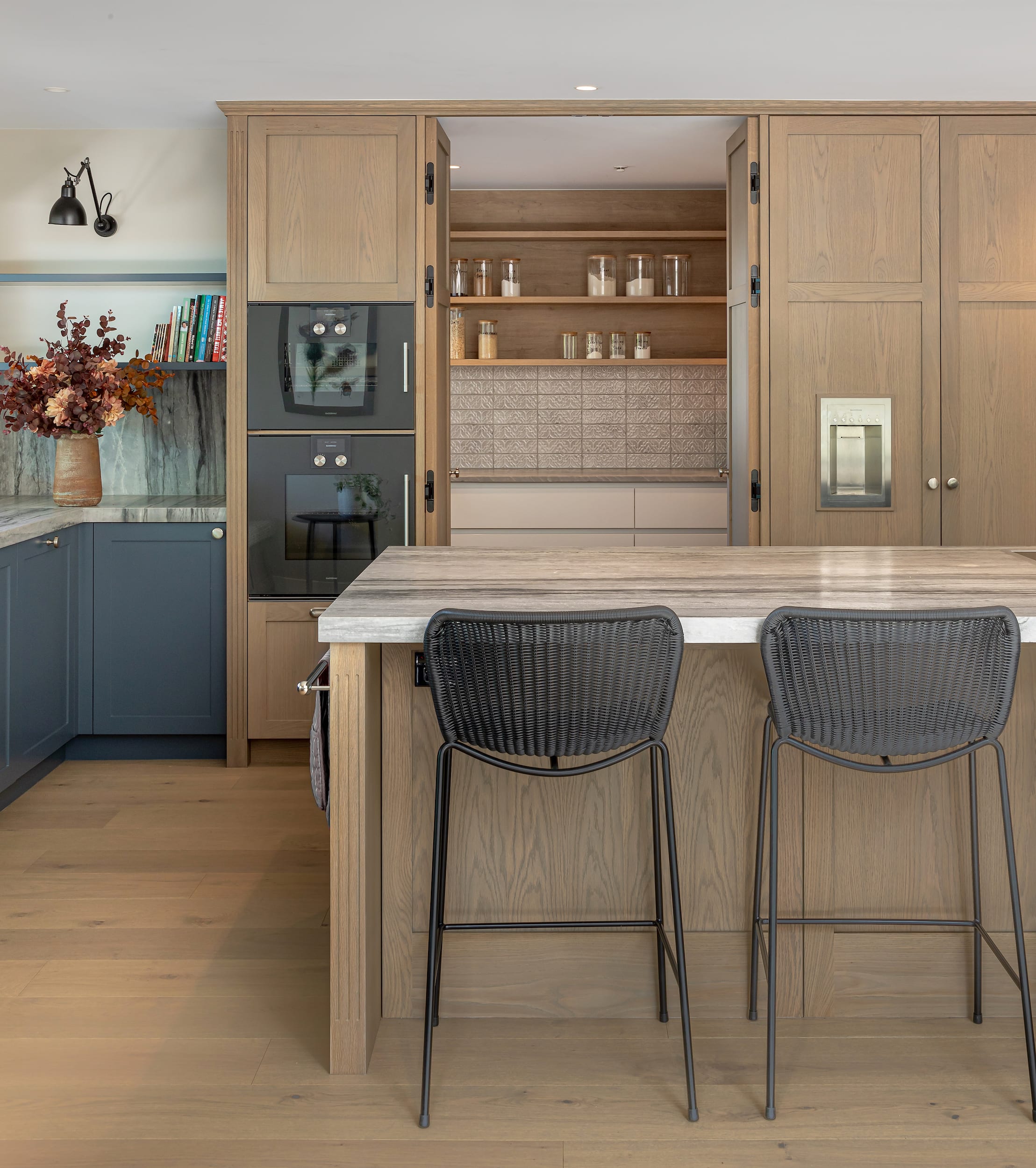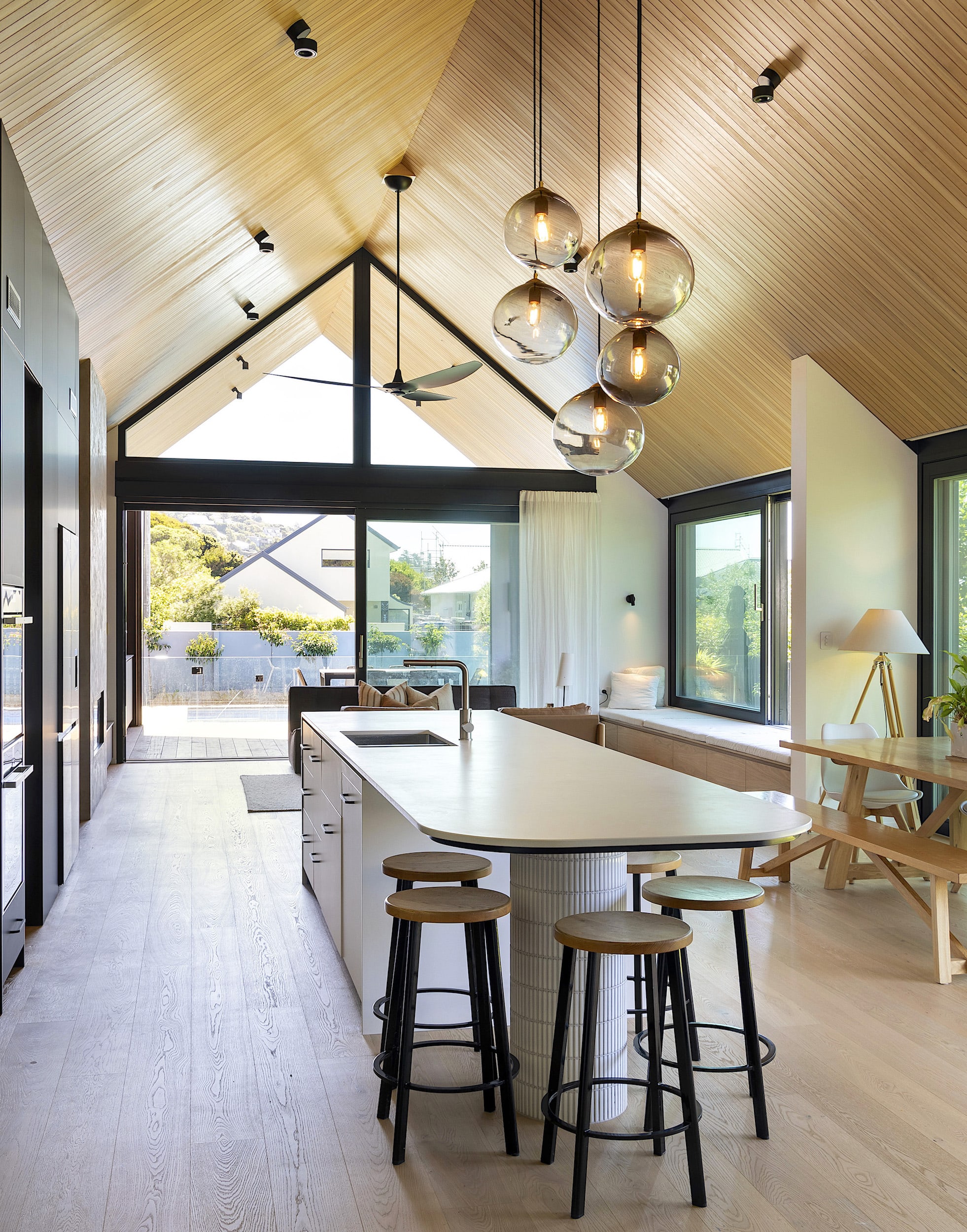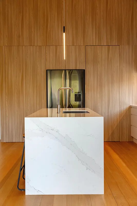 This modern, light-toned kitchen celebrates natural finishes and connects with its surrounding spaces functionally and aesthetically.