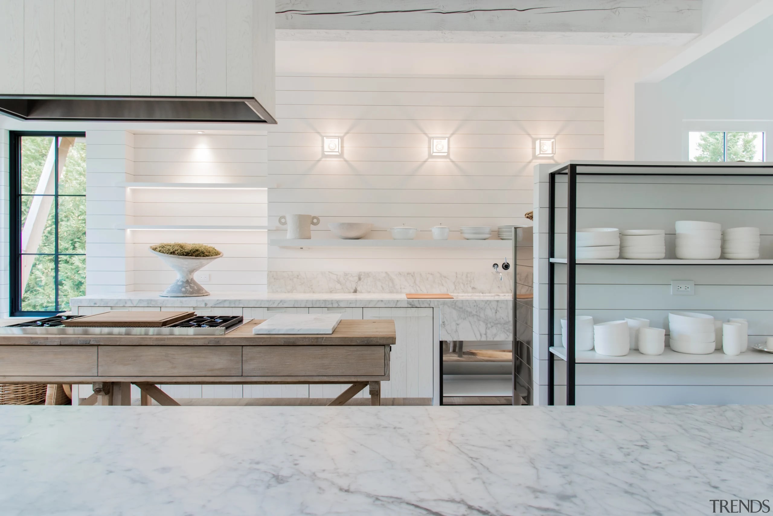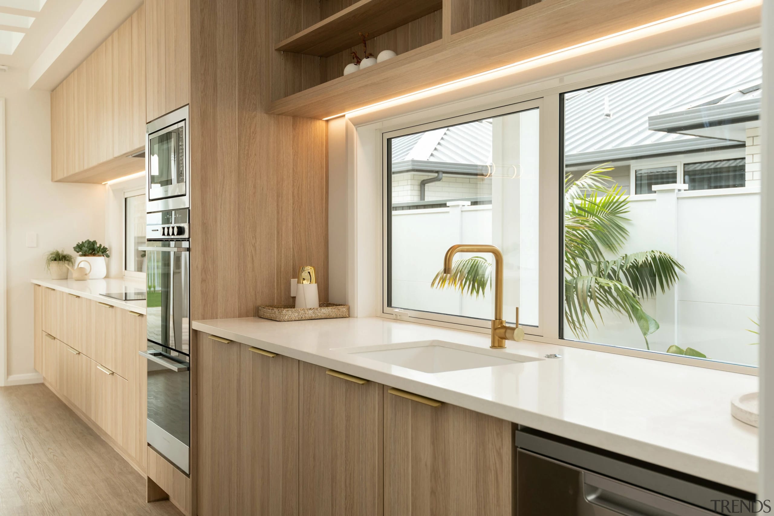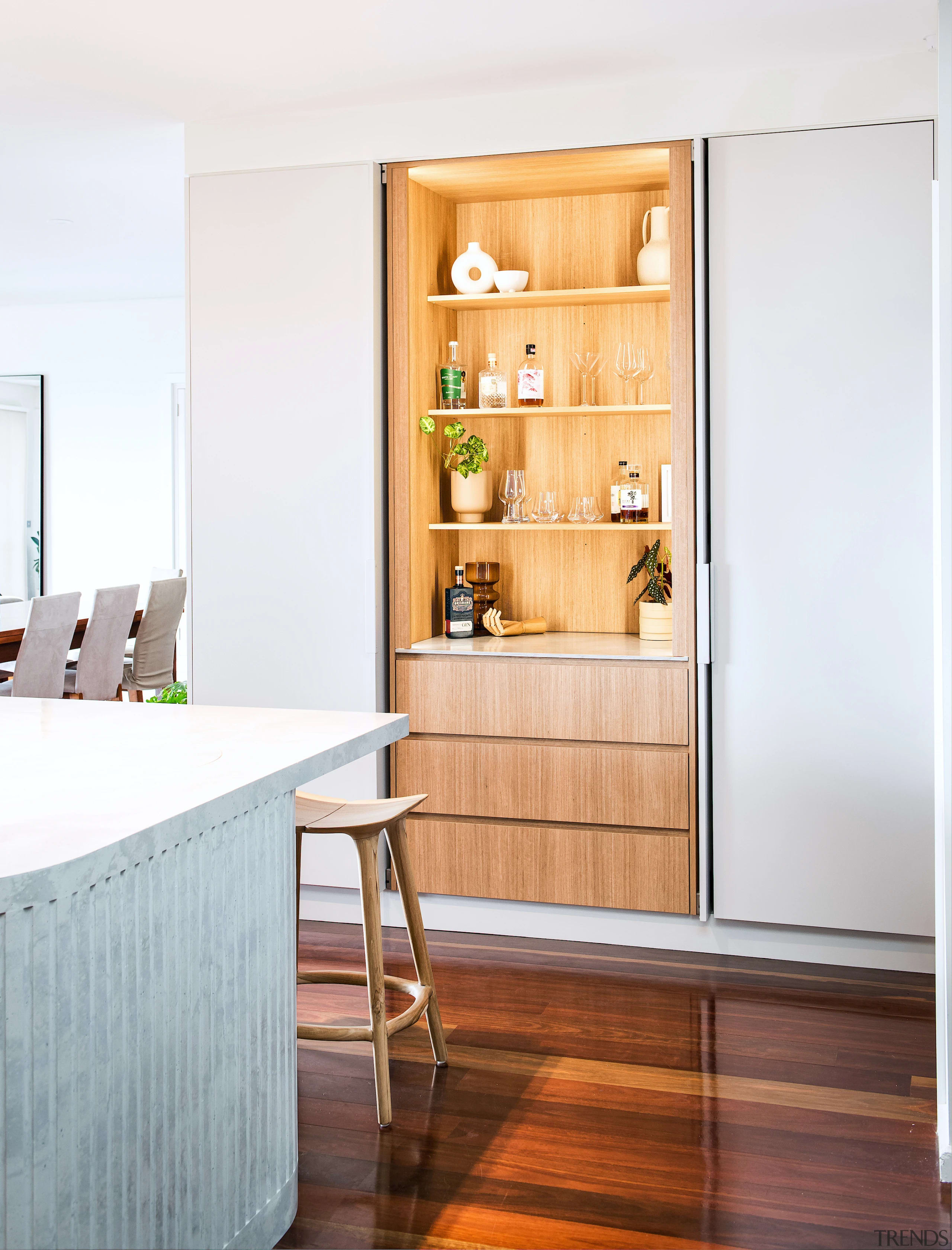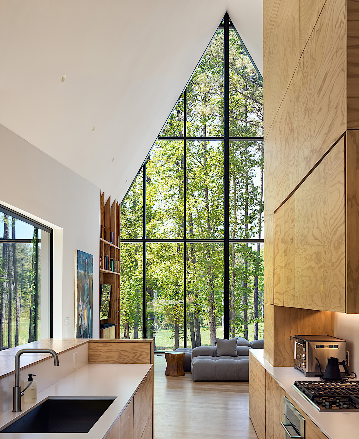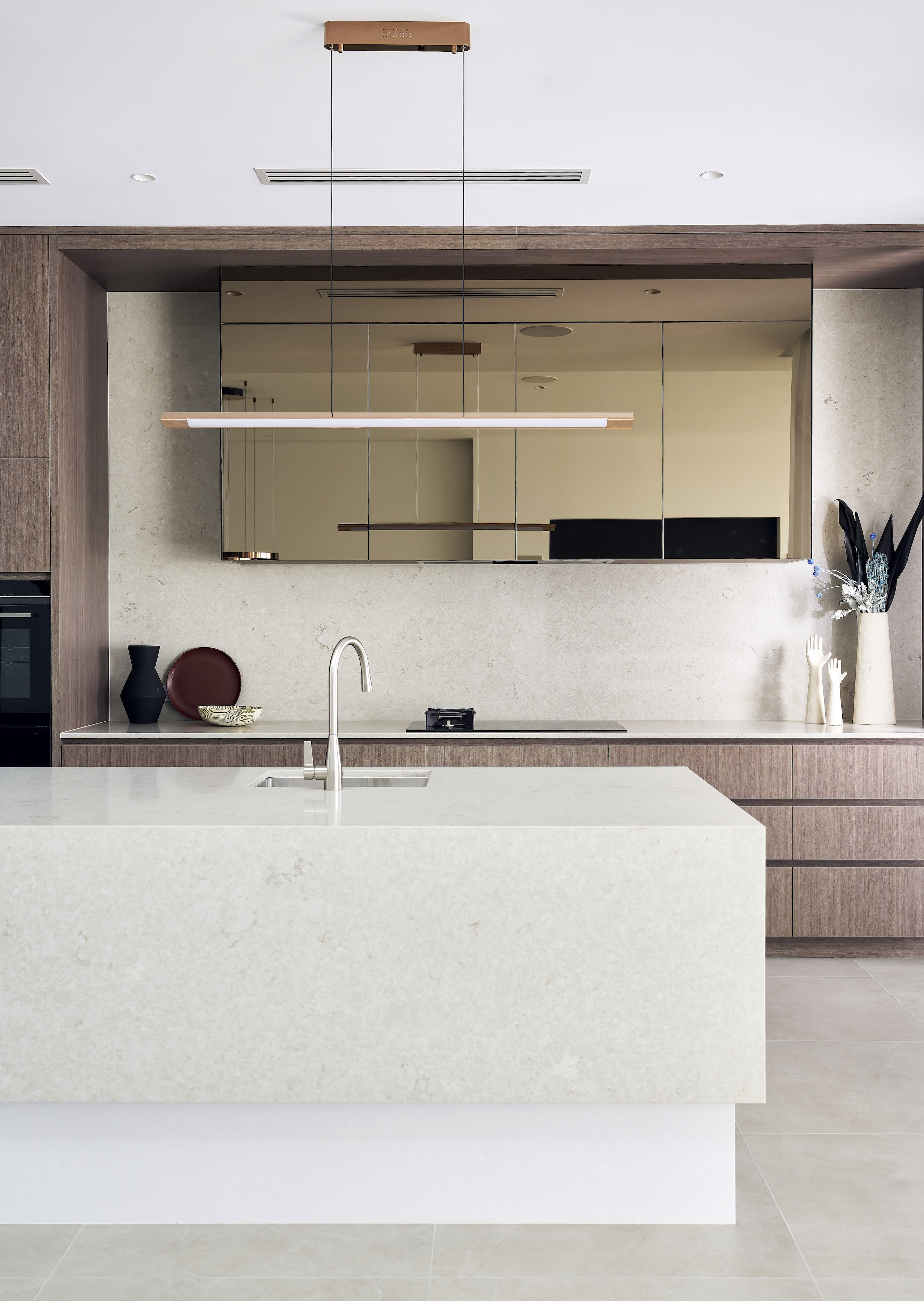 This modern, light-toned kitchen celebrates natural finishes and connects with its surrounding spaces functionally and aesthetically.
