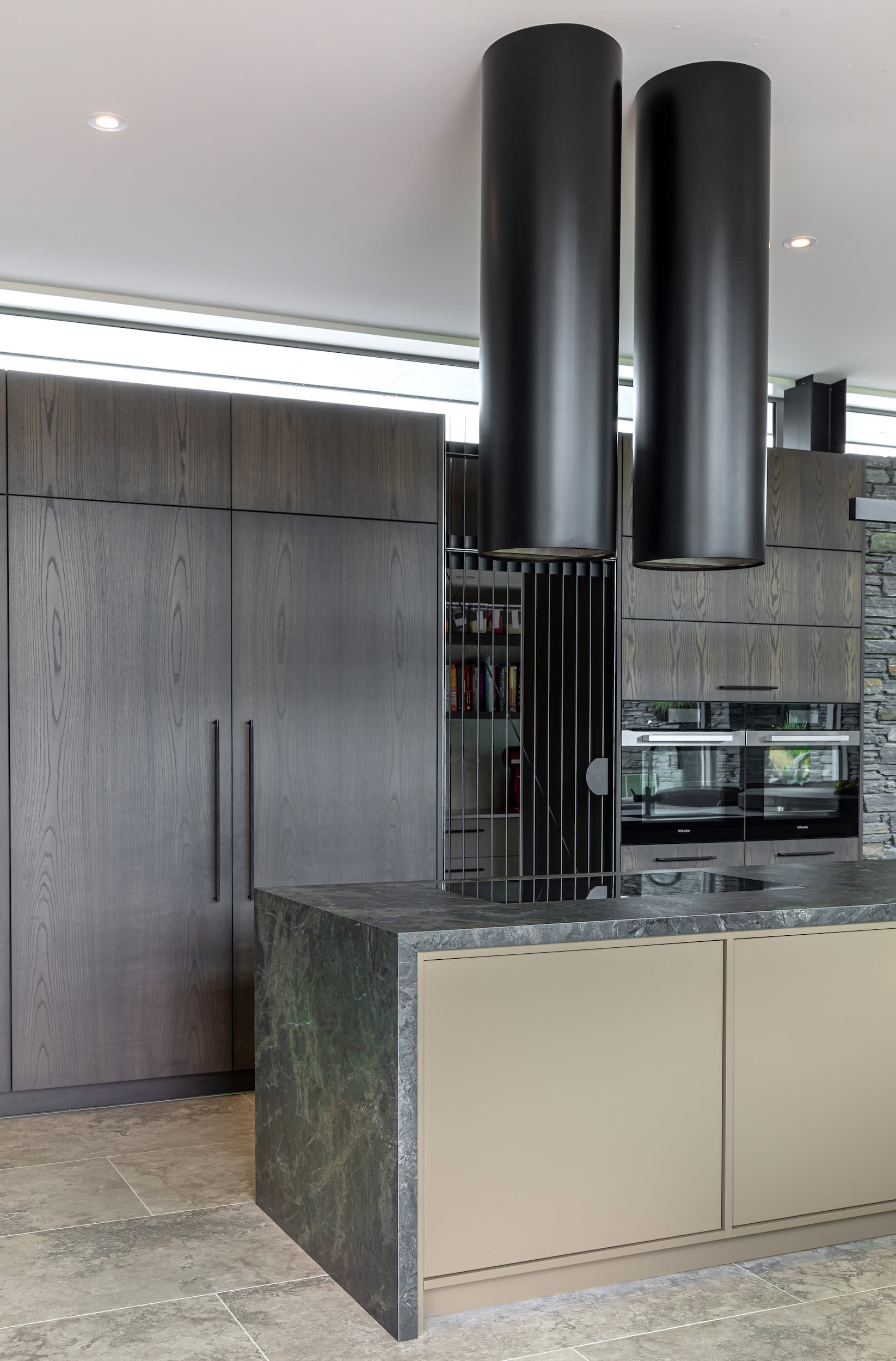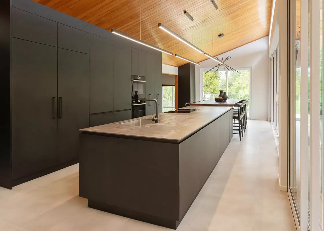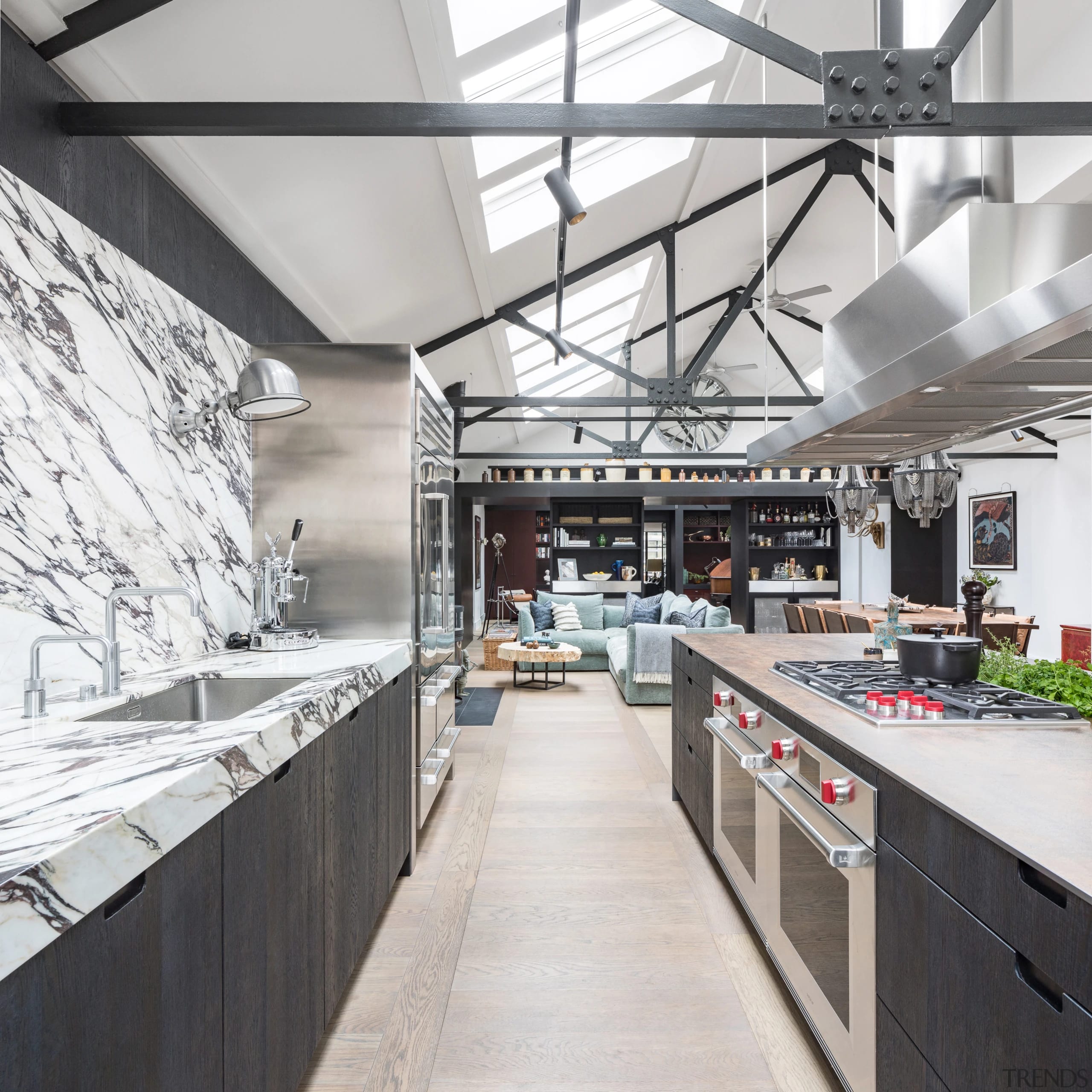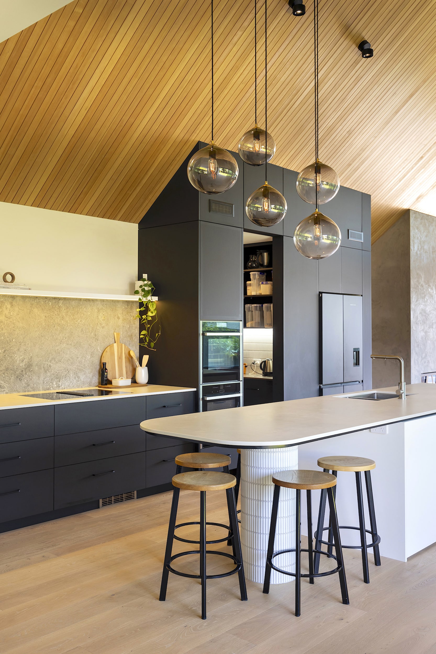 Strong industrial look materials seen in the home's architecture are picked up and run with in this bold yet harmonious and ergonomic kitchen