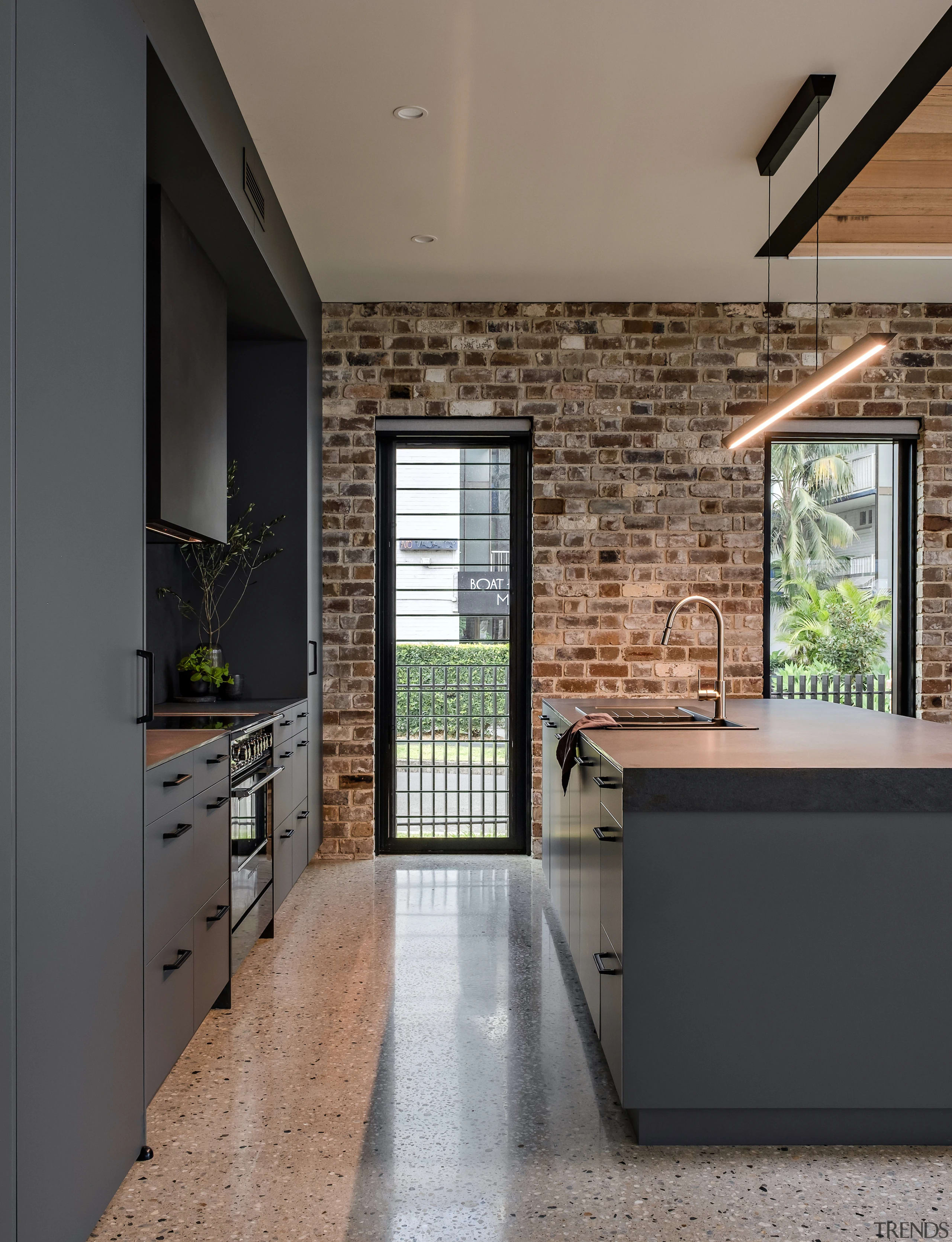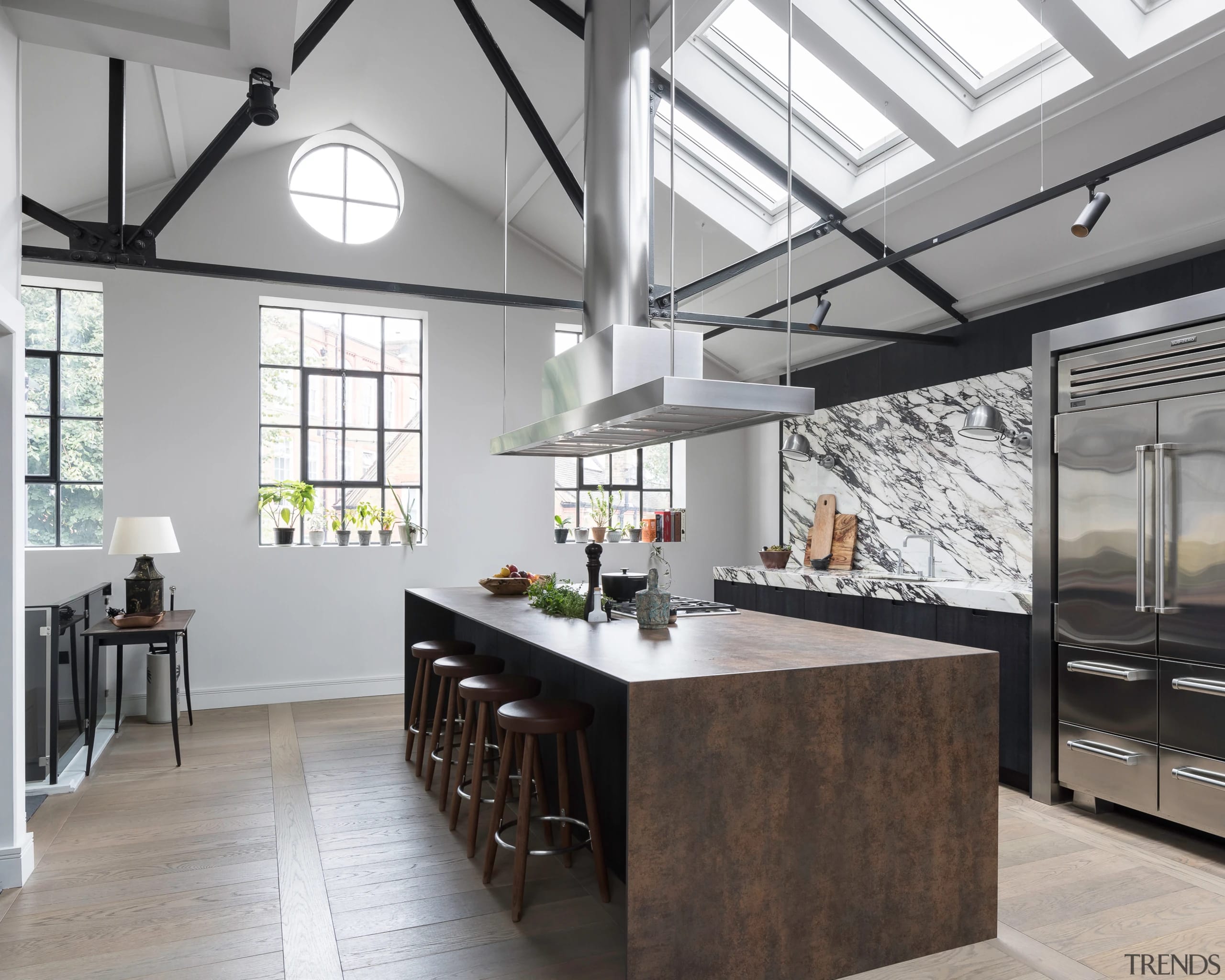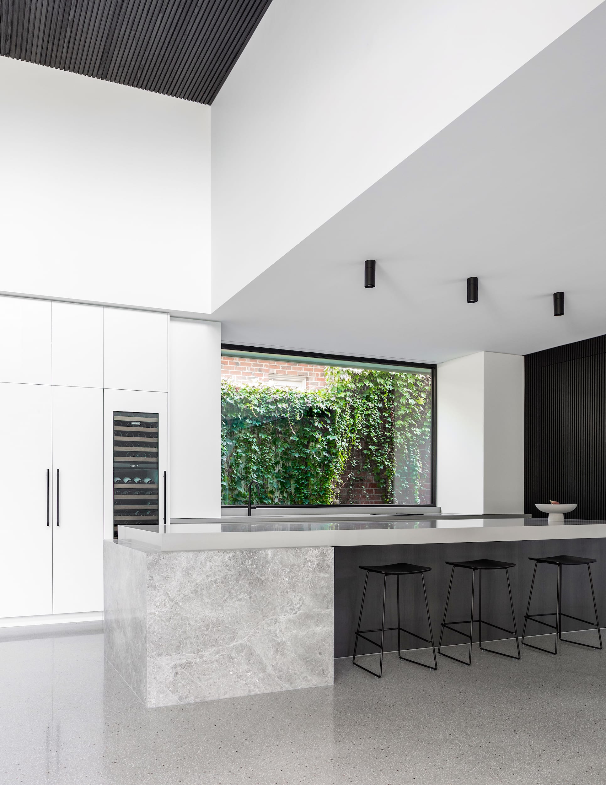 Strong industrial look materials seen in the home's architecture are picked up and run with in this bold yet harmonious and ergonomic kitchen