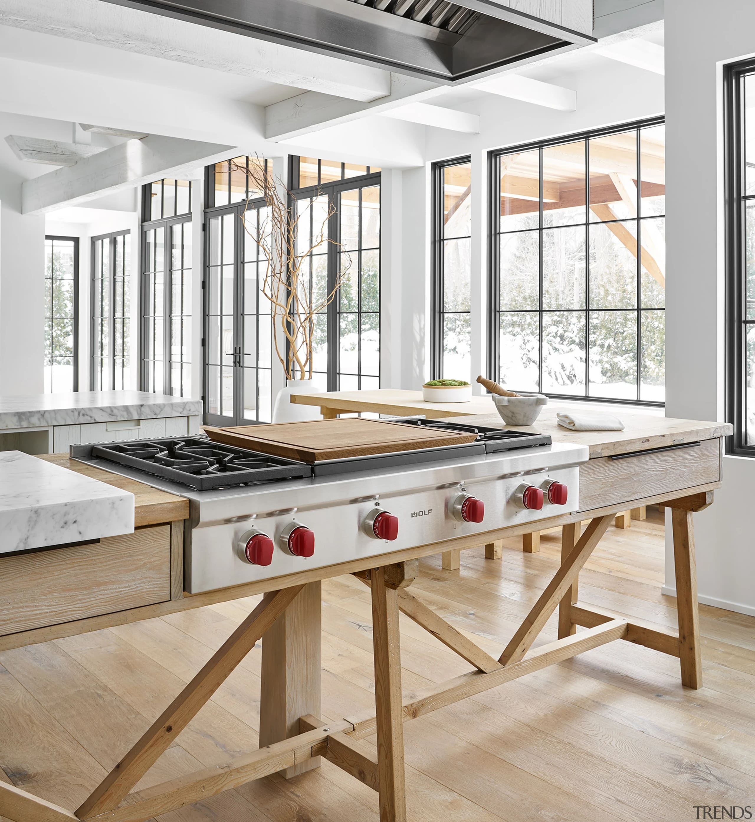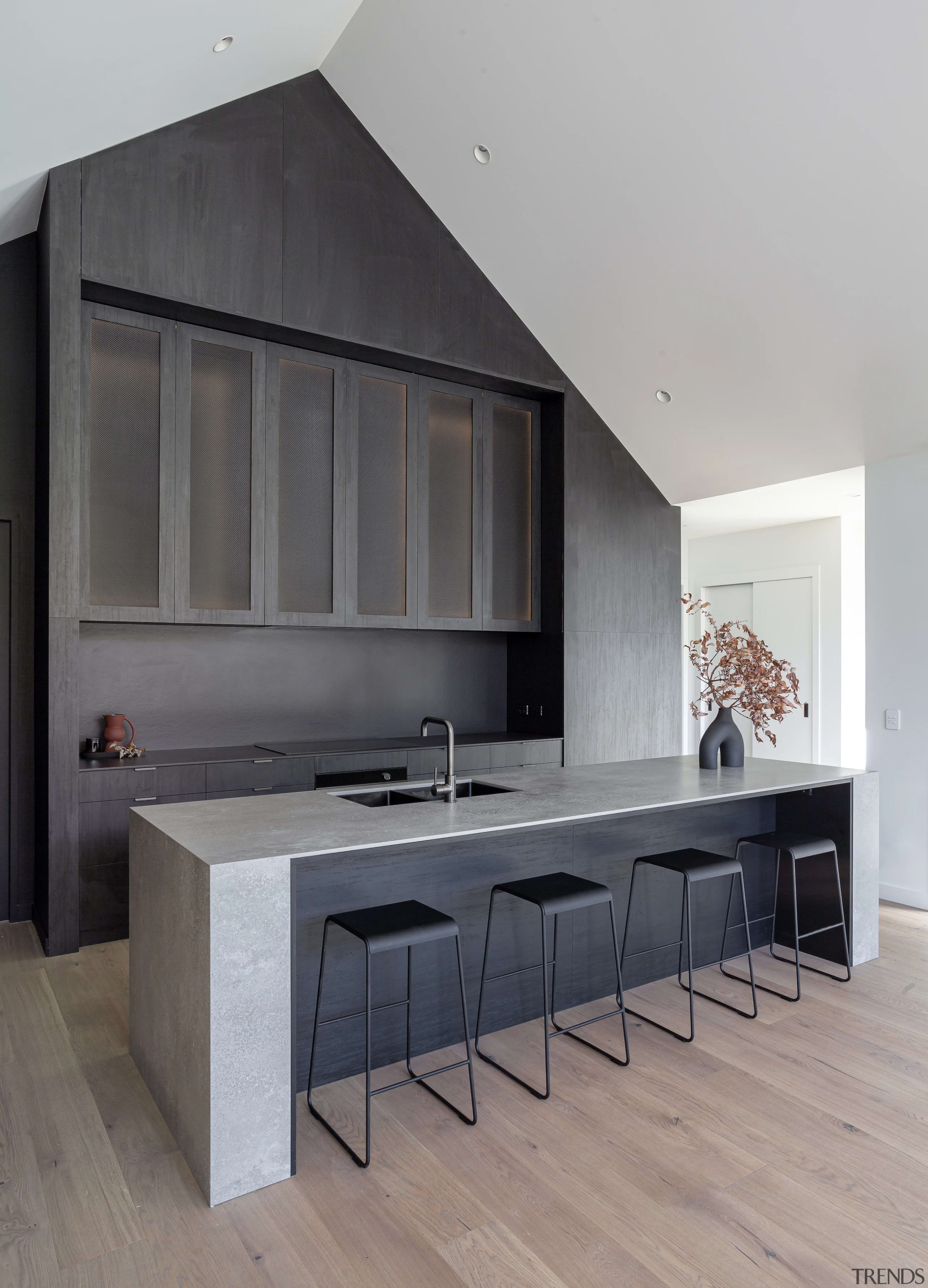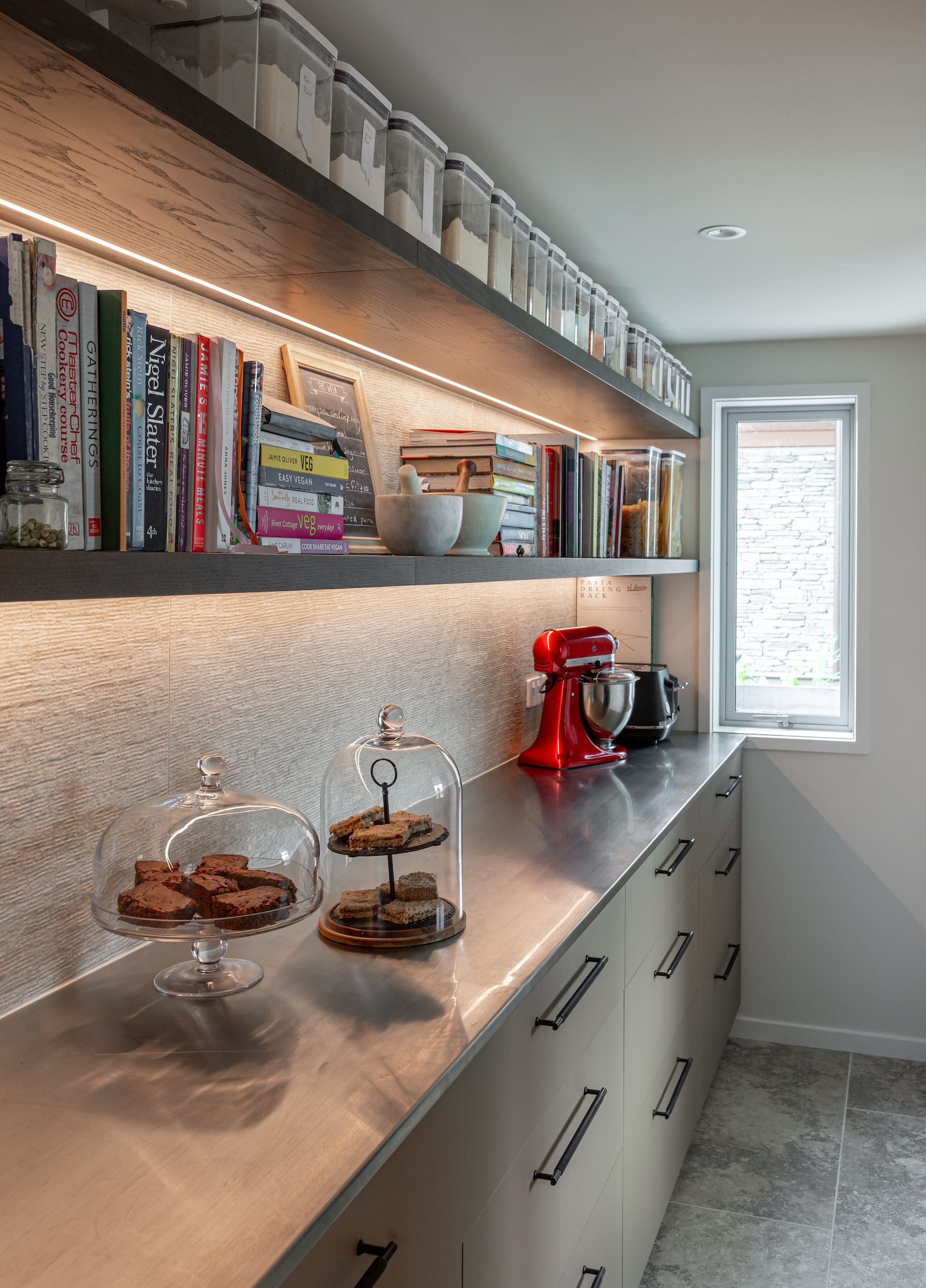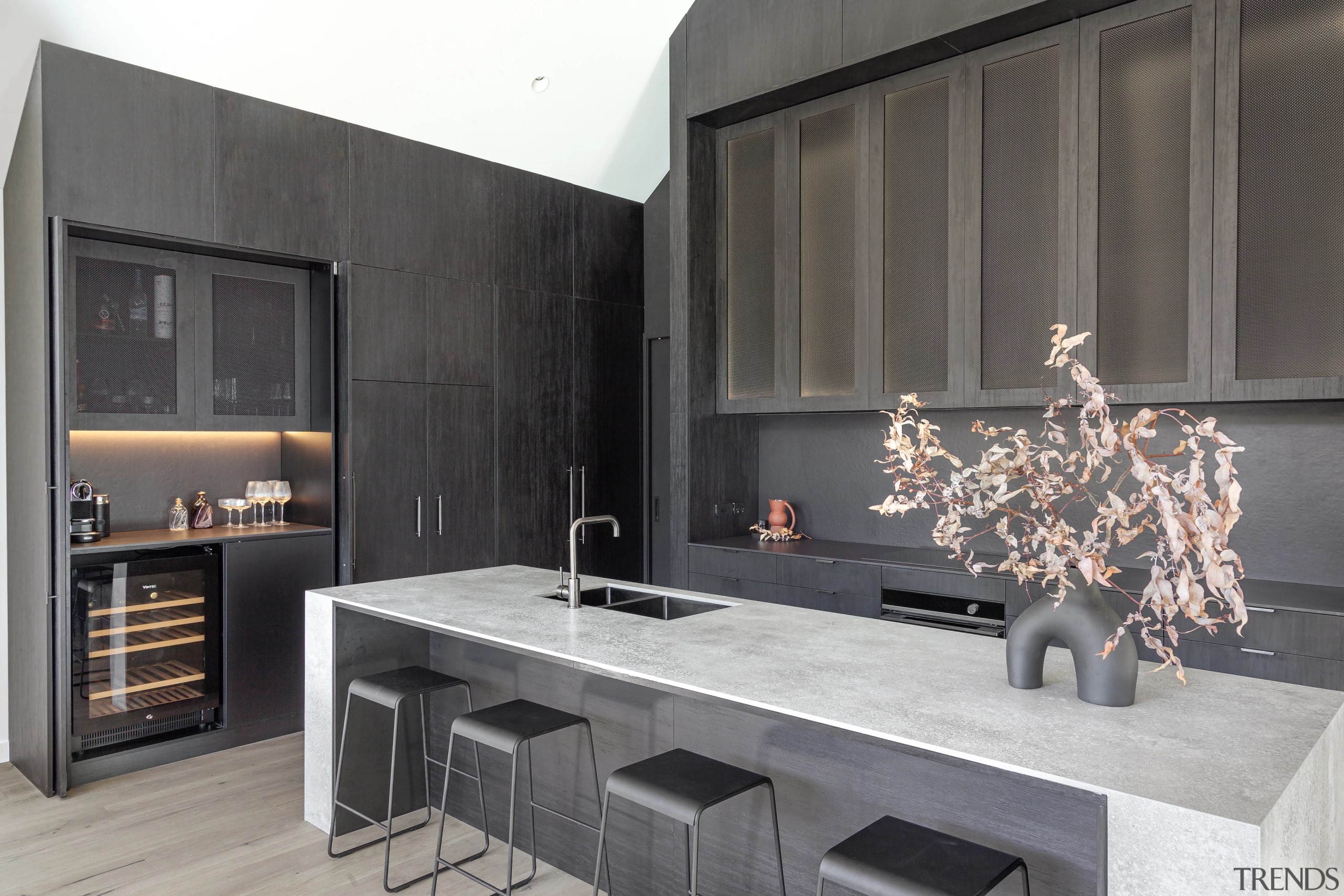Strong industrial look materials seen in the home's architecture are picked up and run with in this bold yet harmonious and ergonomic kitchen