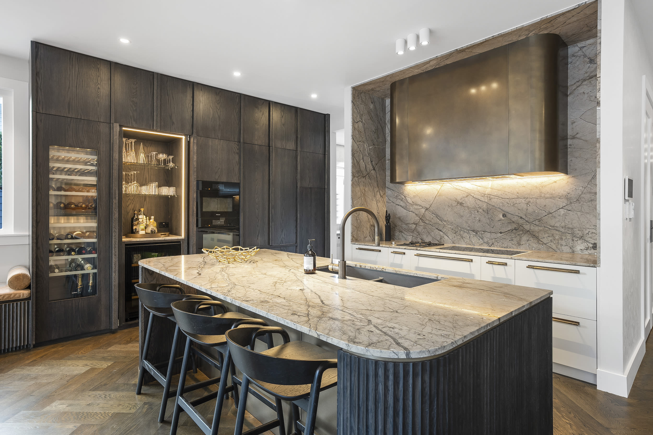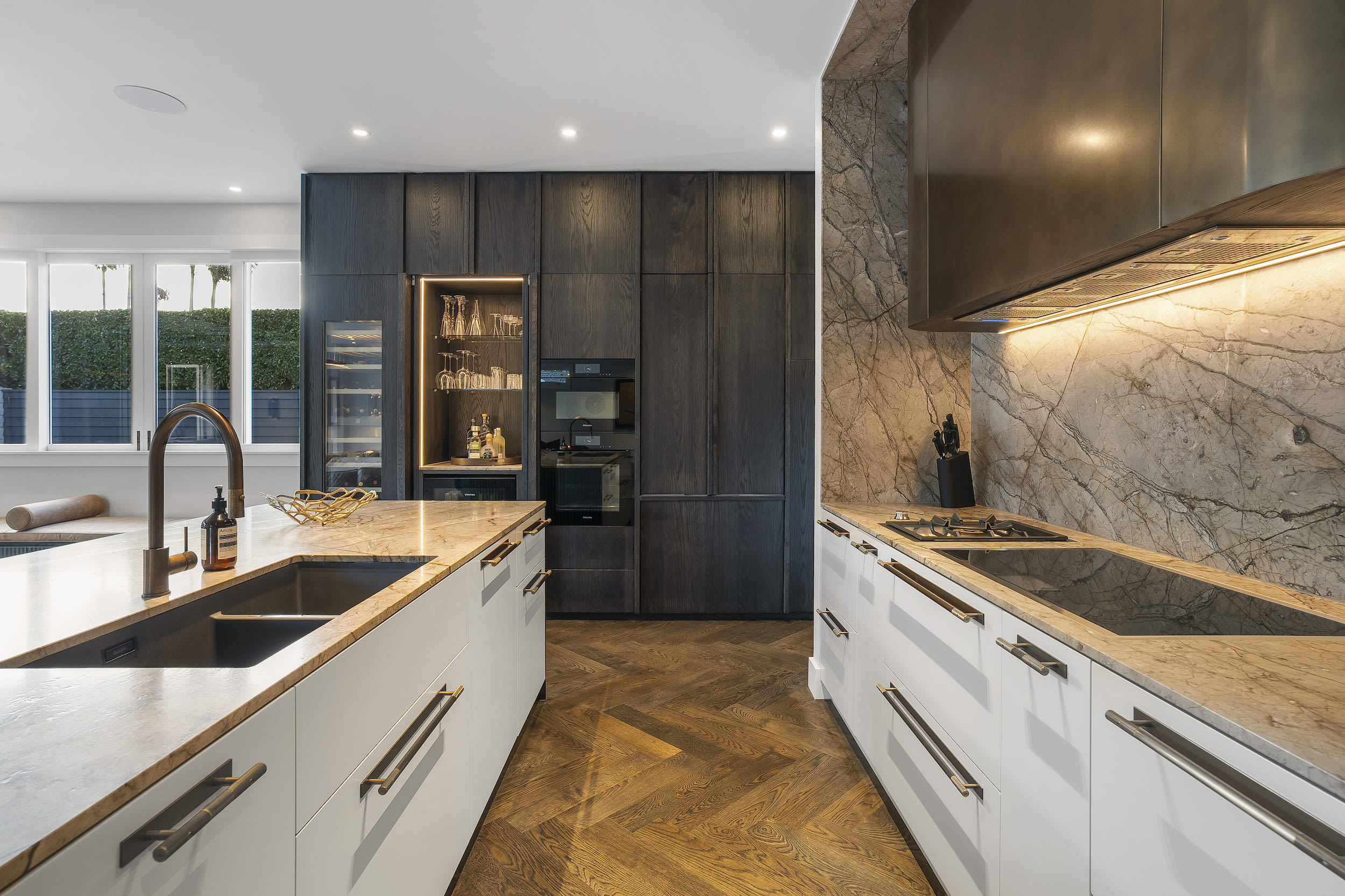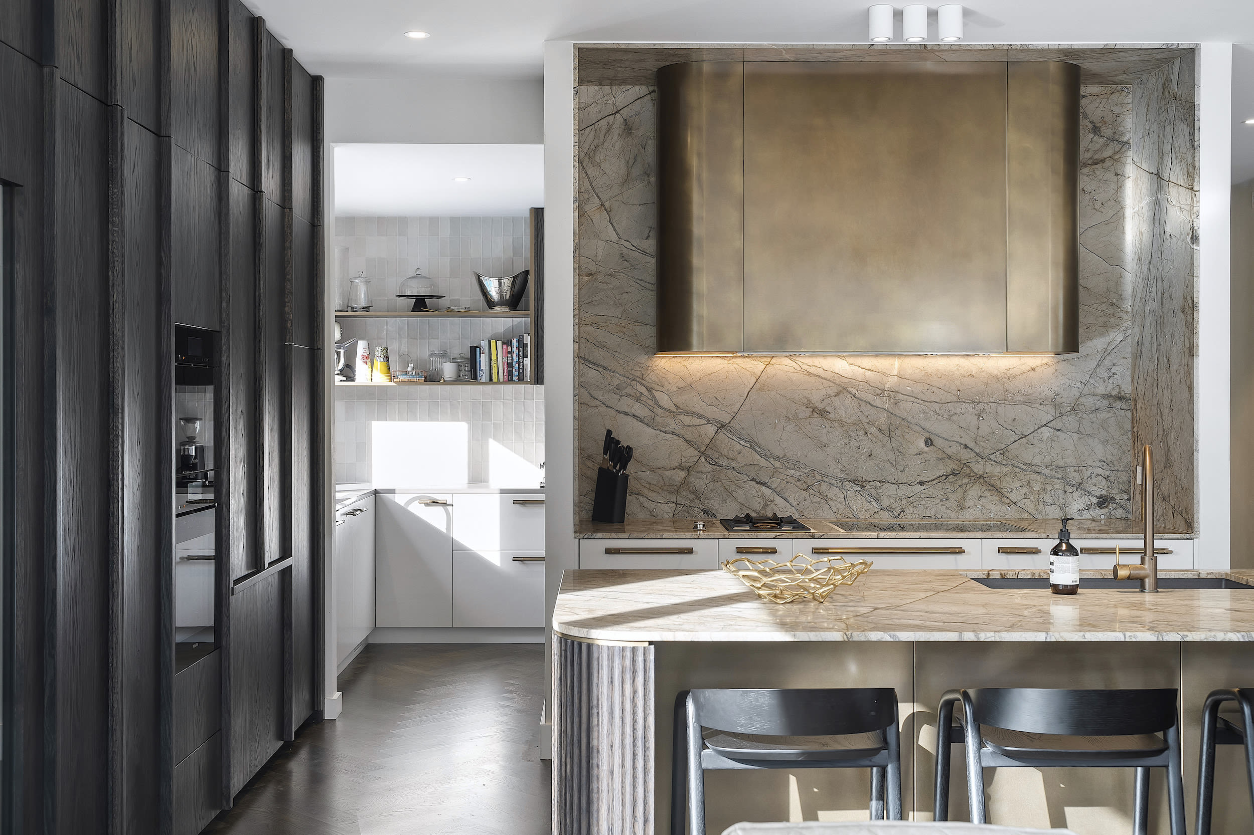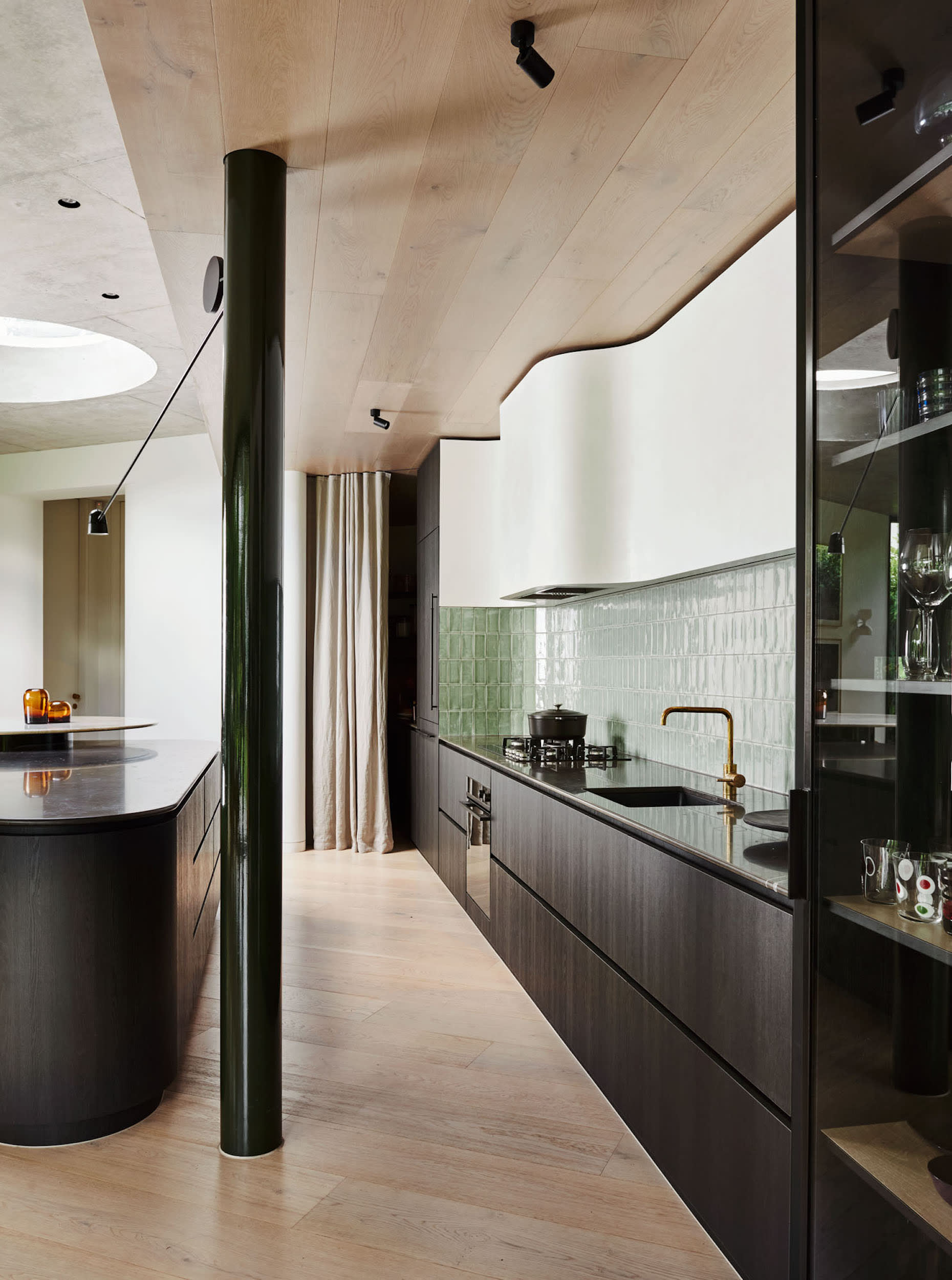 An innovative positioning of wood-crafted cabinetry and islands optimises flow, preserves existing elements and creates kitchen privacy