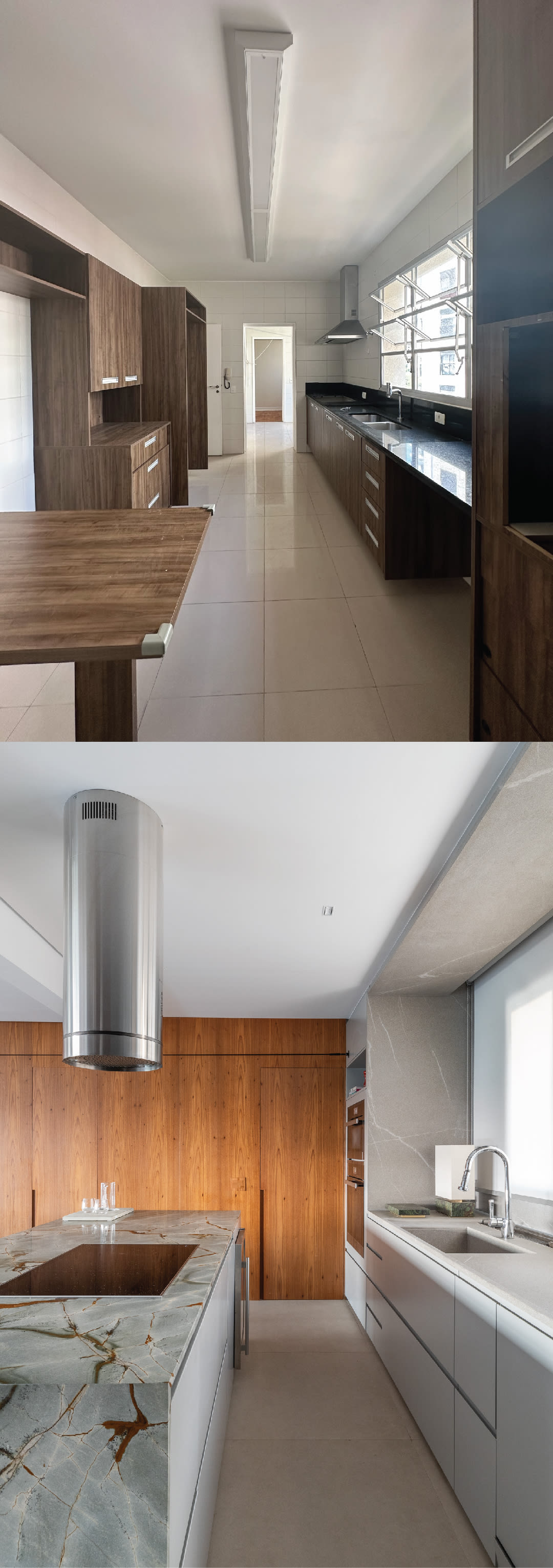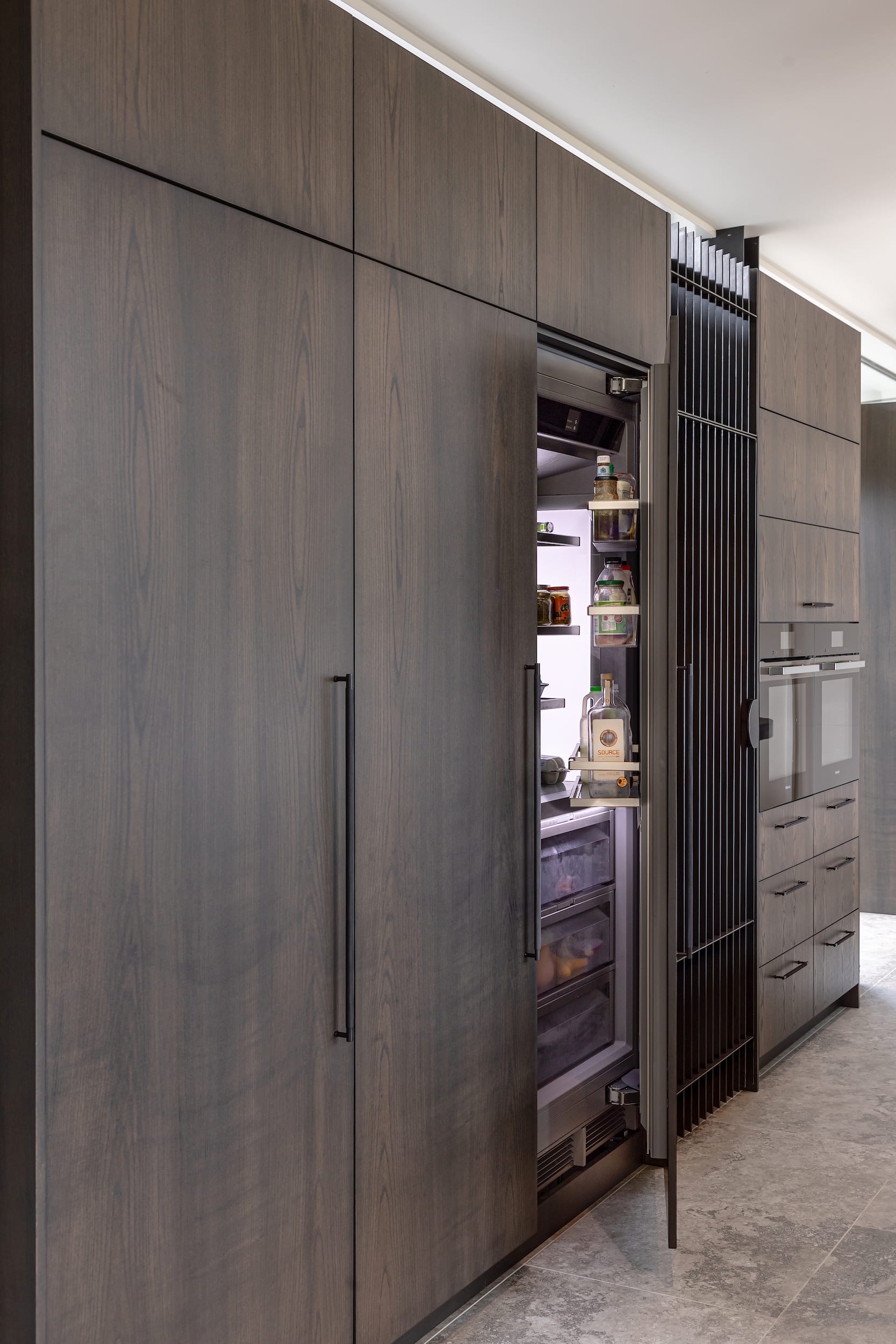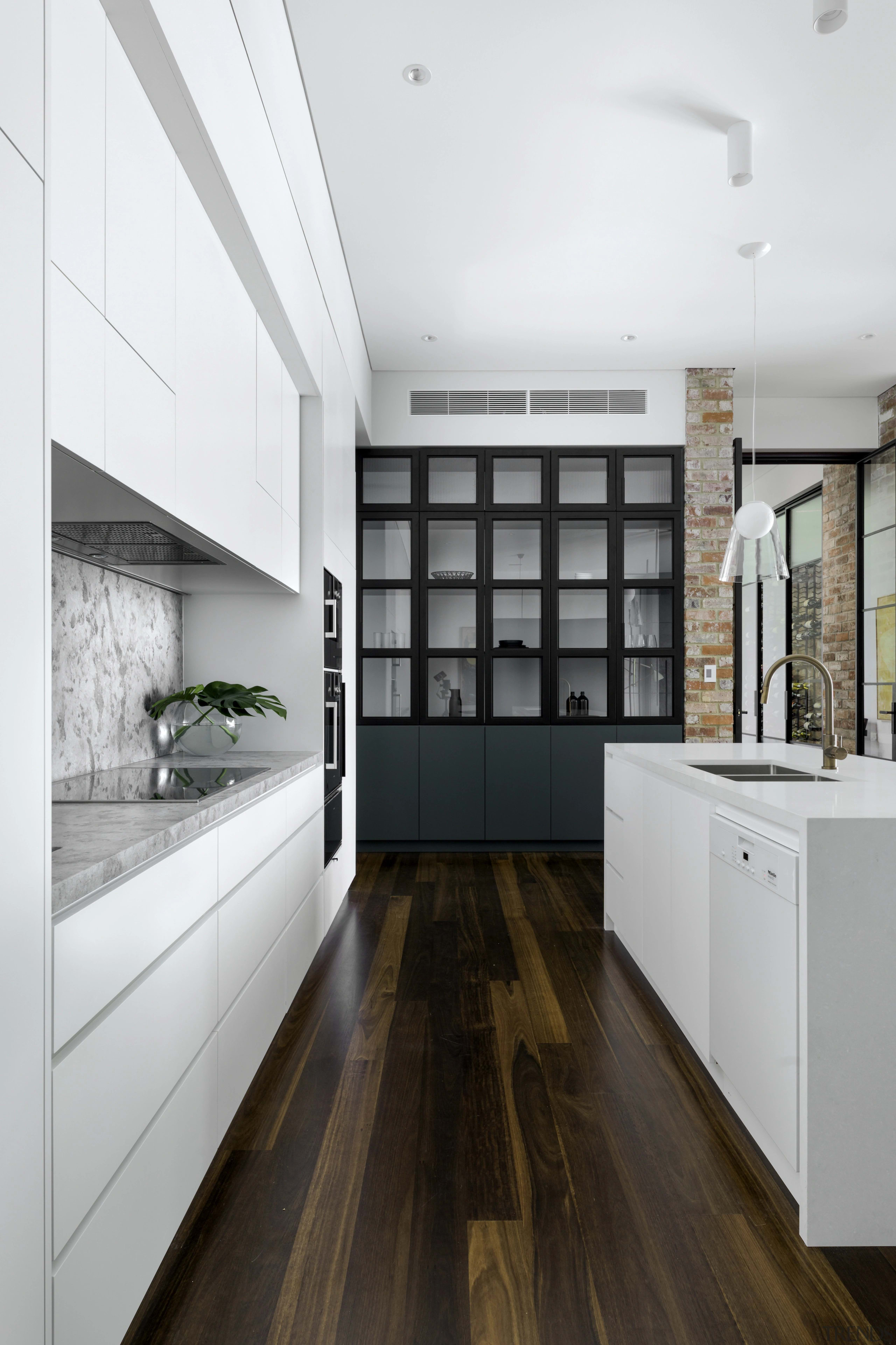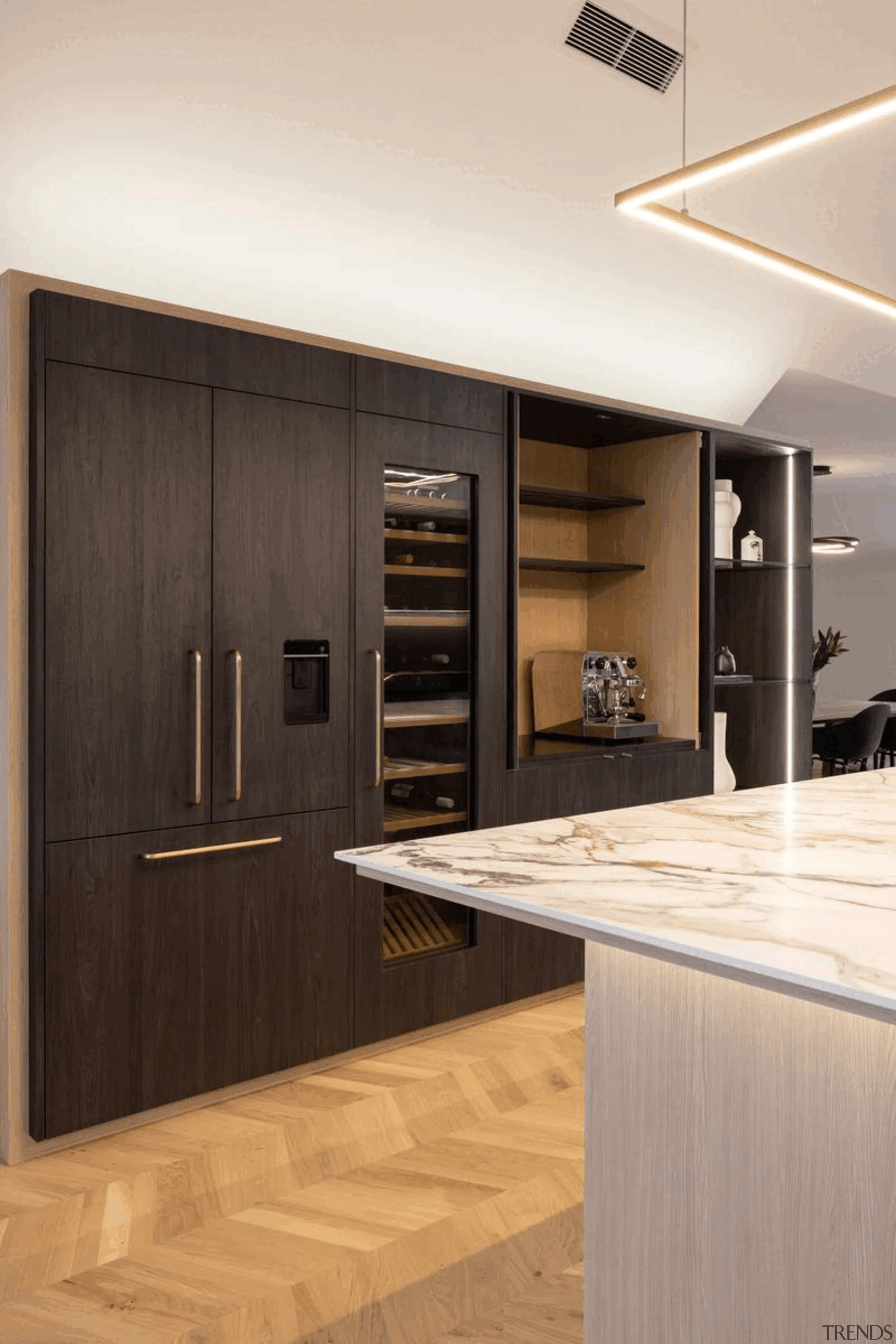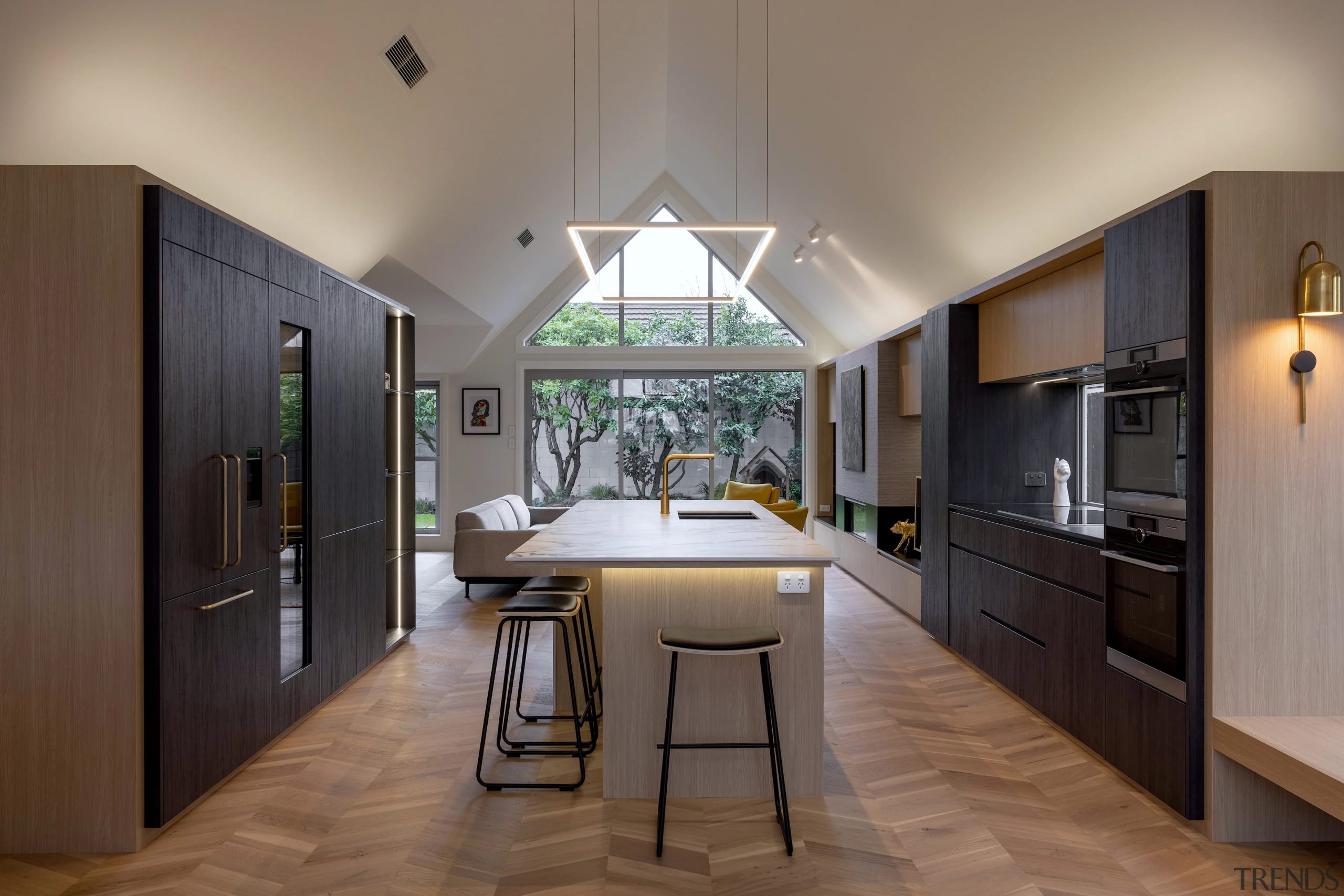 An innovative positioning of wood-crafted cabinetry and islands optimises flow, preserves existing elements and creates kitchen privacy