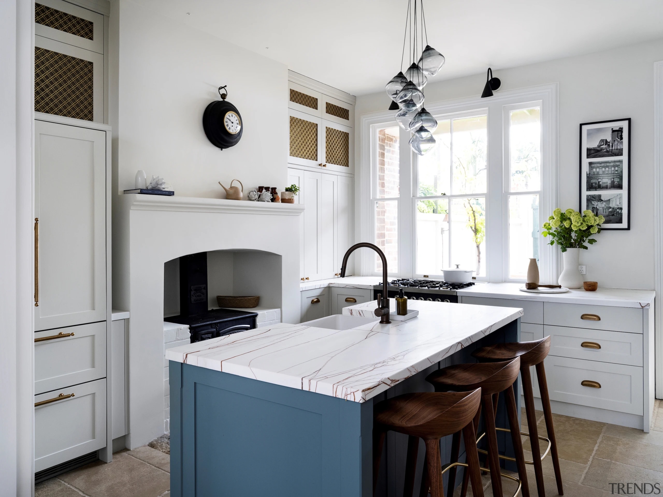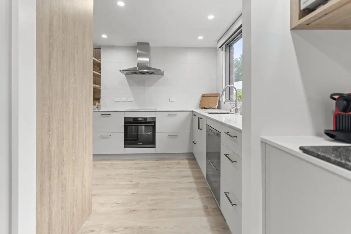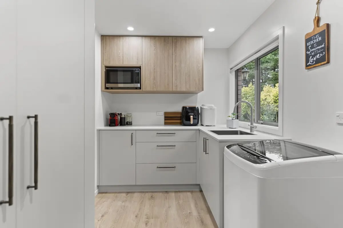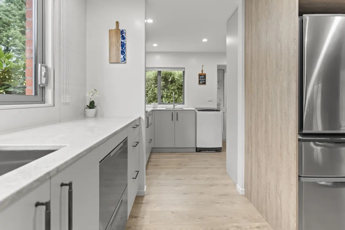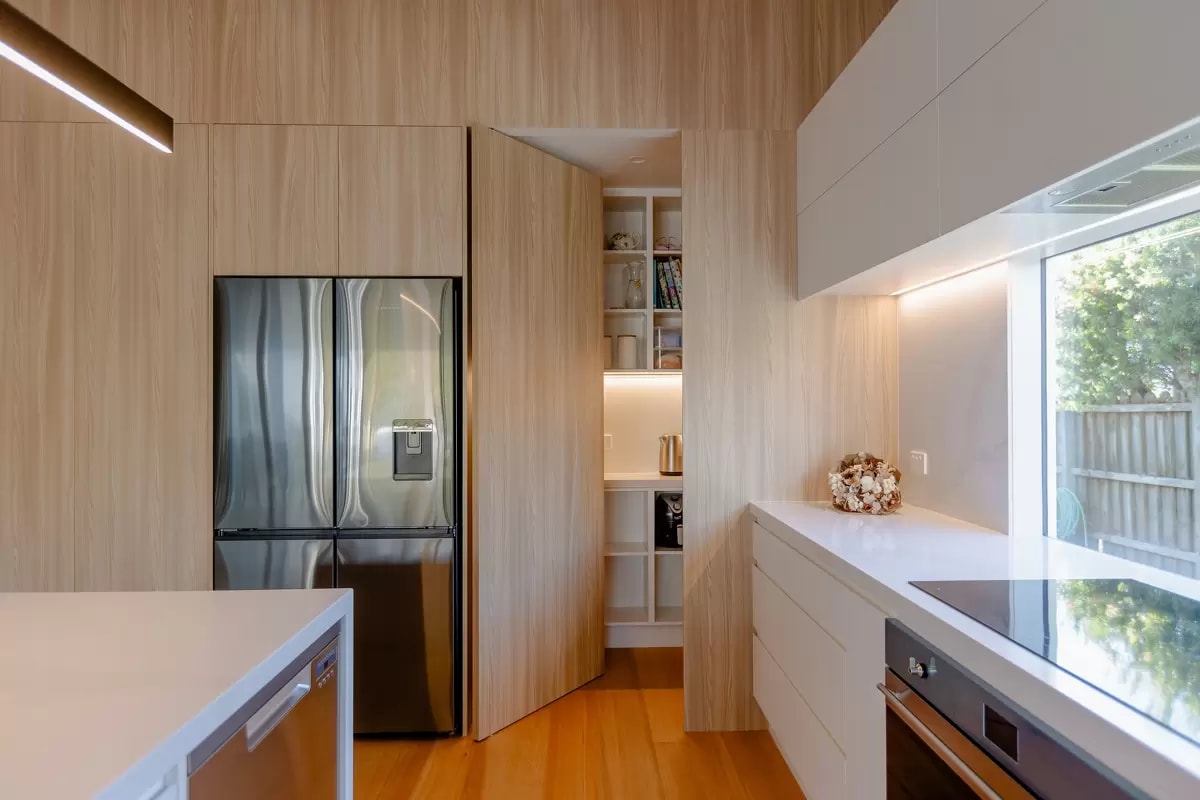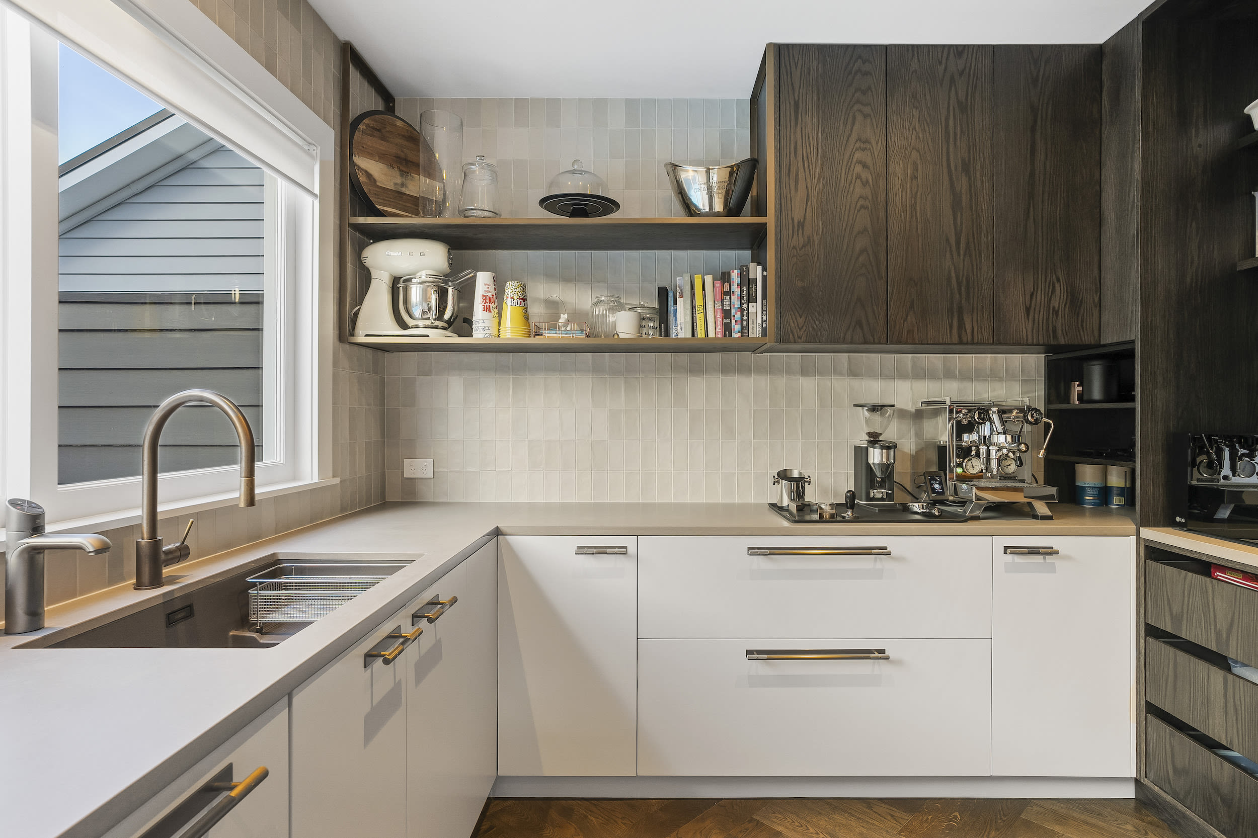 A new rear extension and repurposed bedroom allows this new kitchen to stretch out – calm tones, generous storage and ideally located appliances mean the kitchen, laundry and scullery are all set up for good looks and family logistics