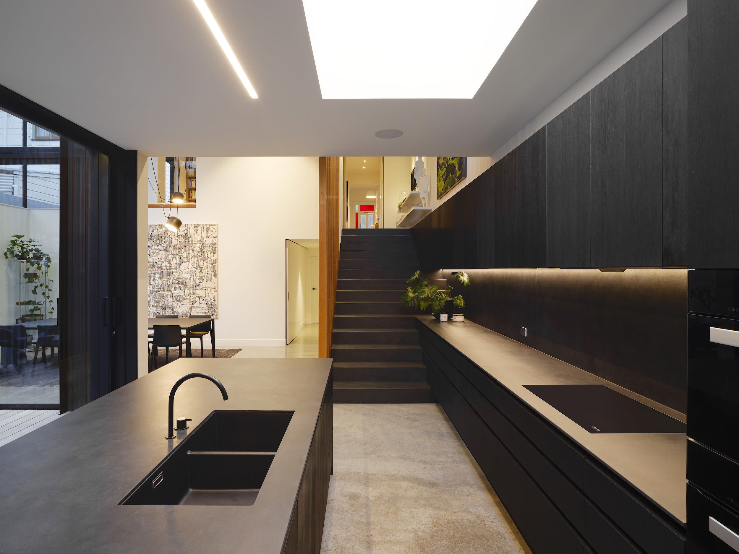 An existing pre-1900s two-storey villa is brought up to modern living functionality with the introduction of a contemporary living pavilion that maximises connection with the outdoor space and leafy garden beyond – the existing and new are colour coded on the exterior, with black signalling the new