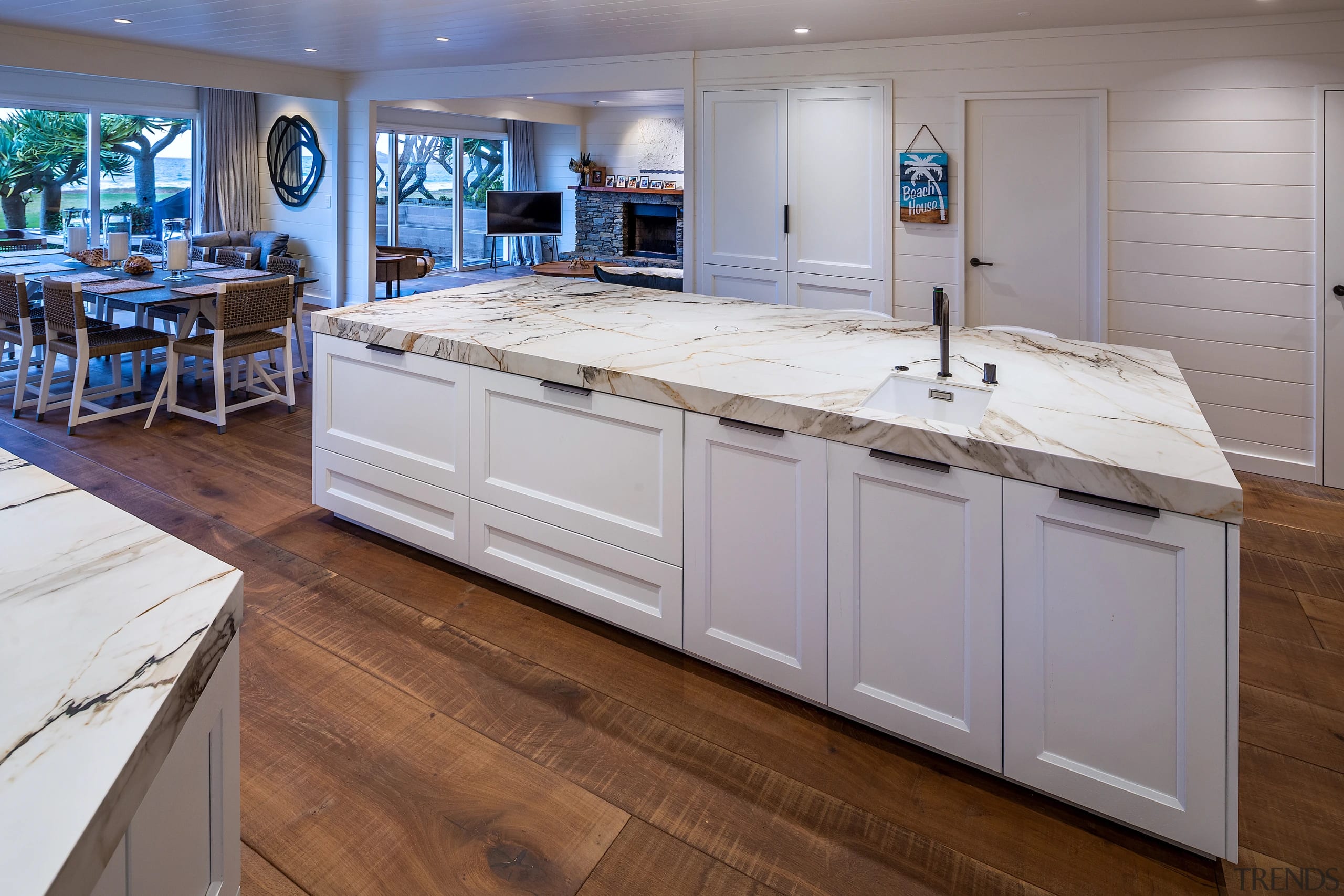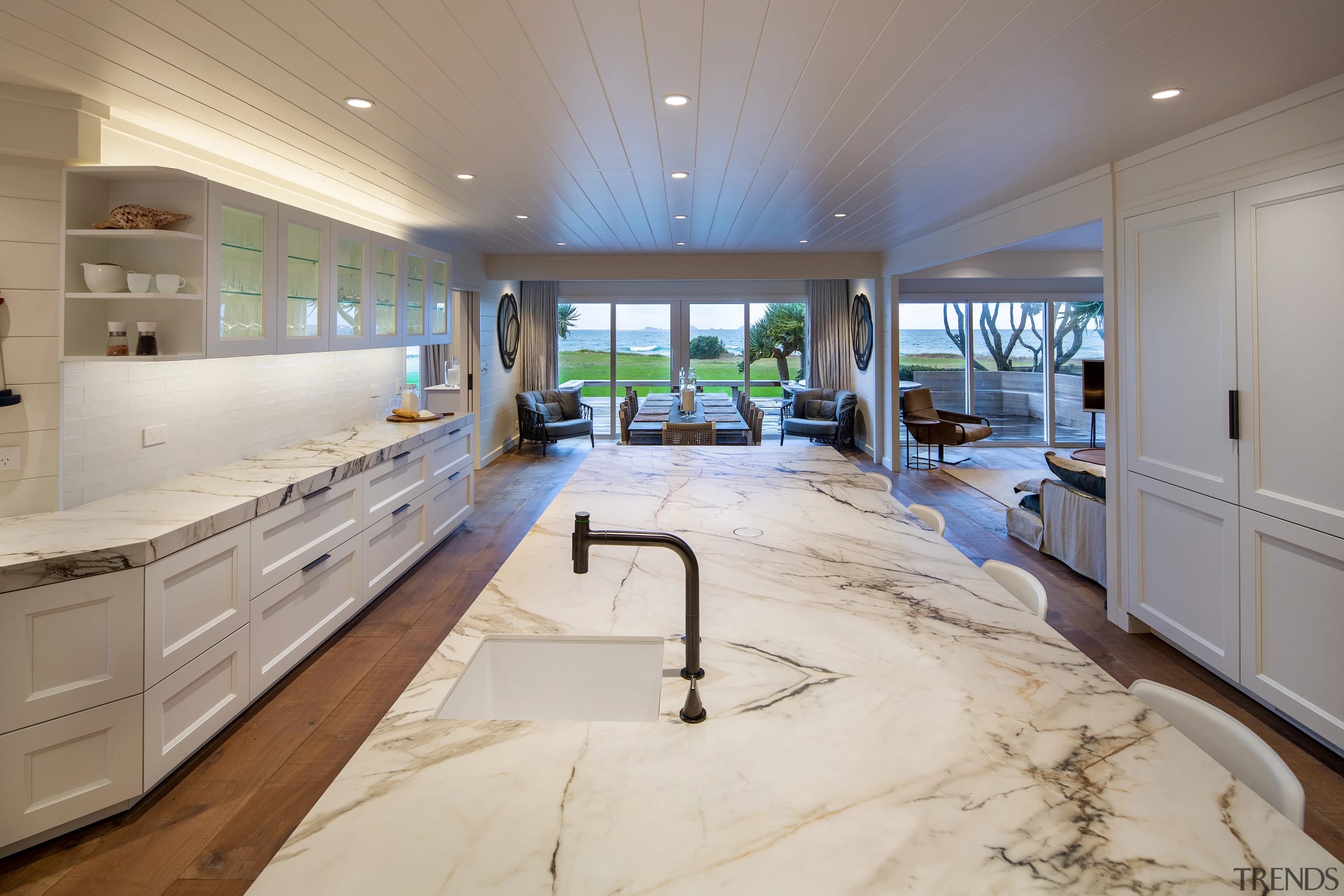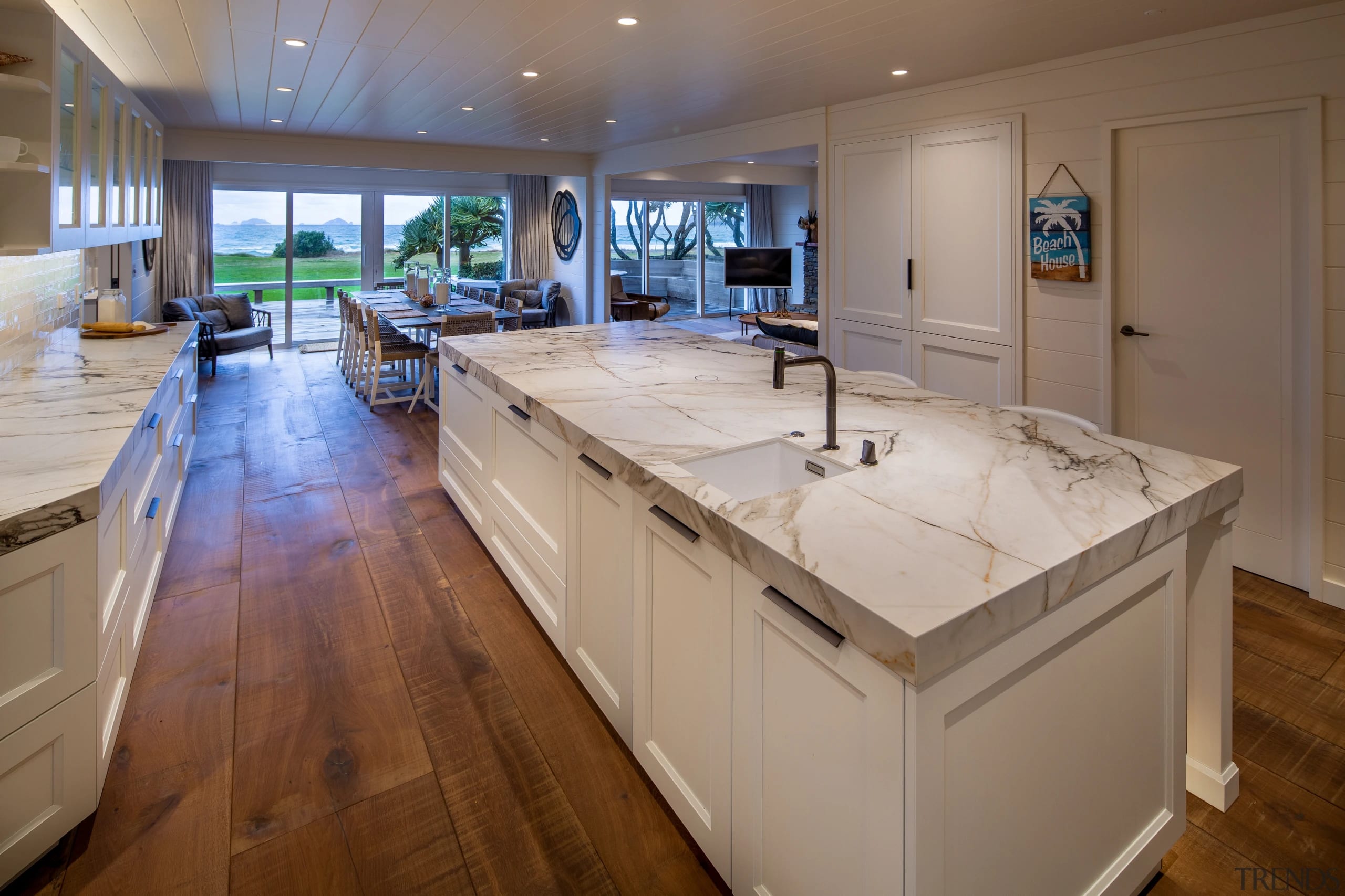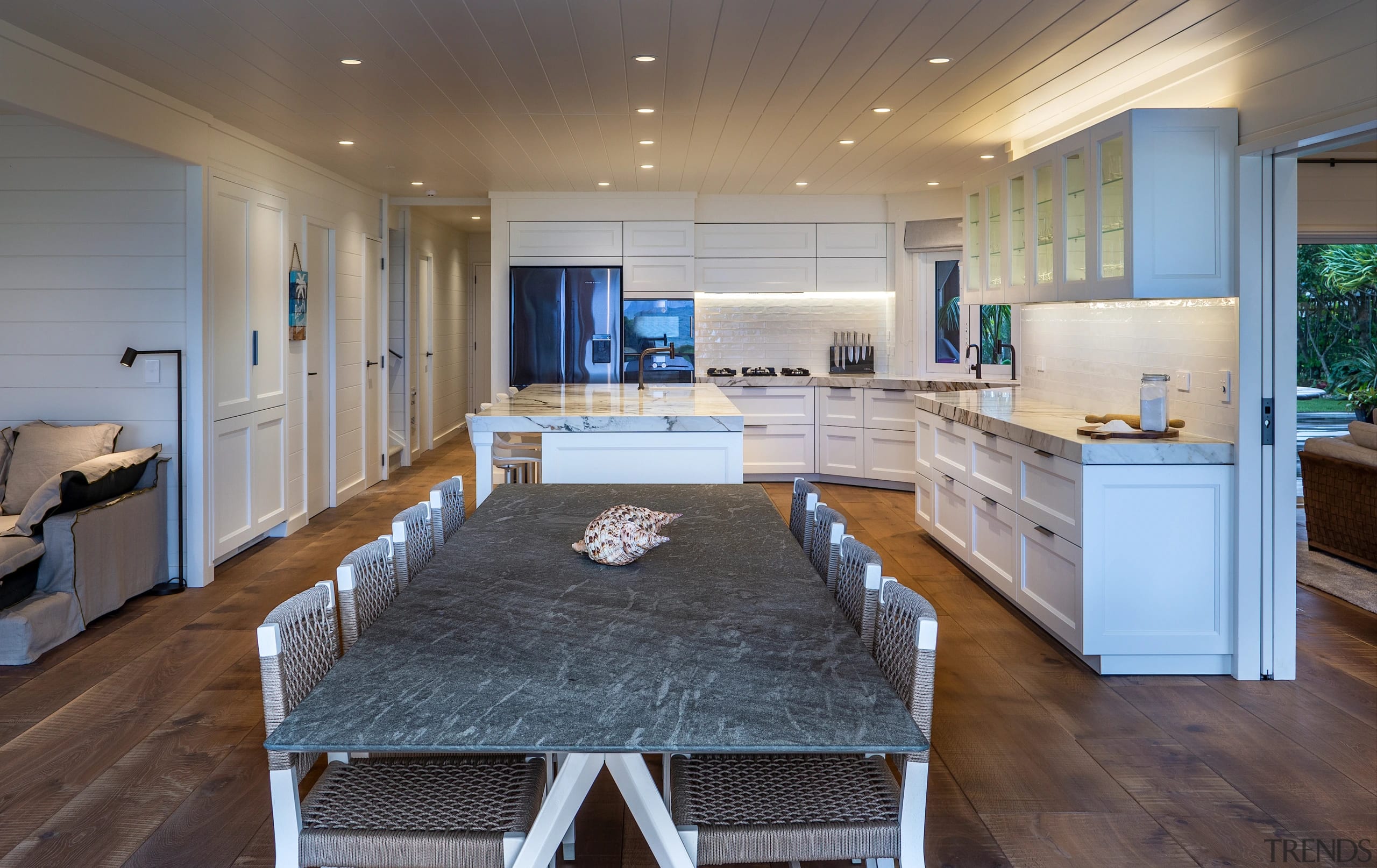 My idea was to design an island the length of the room and work this in with the dining table to create a continuous springboard that led outdoors to the large deck and beach access.