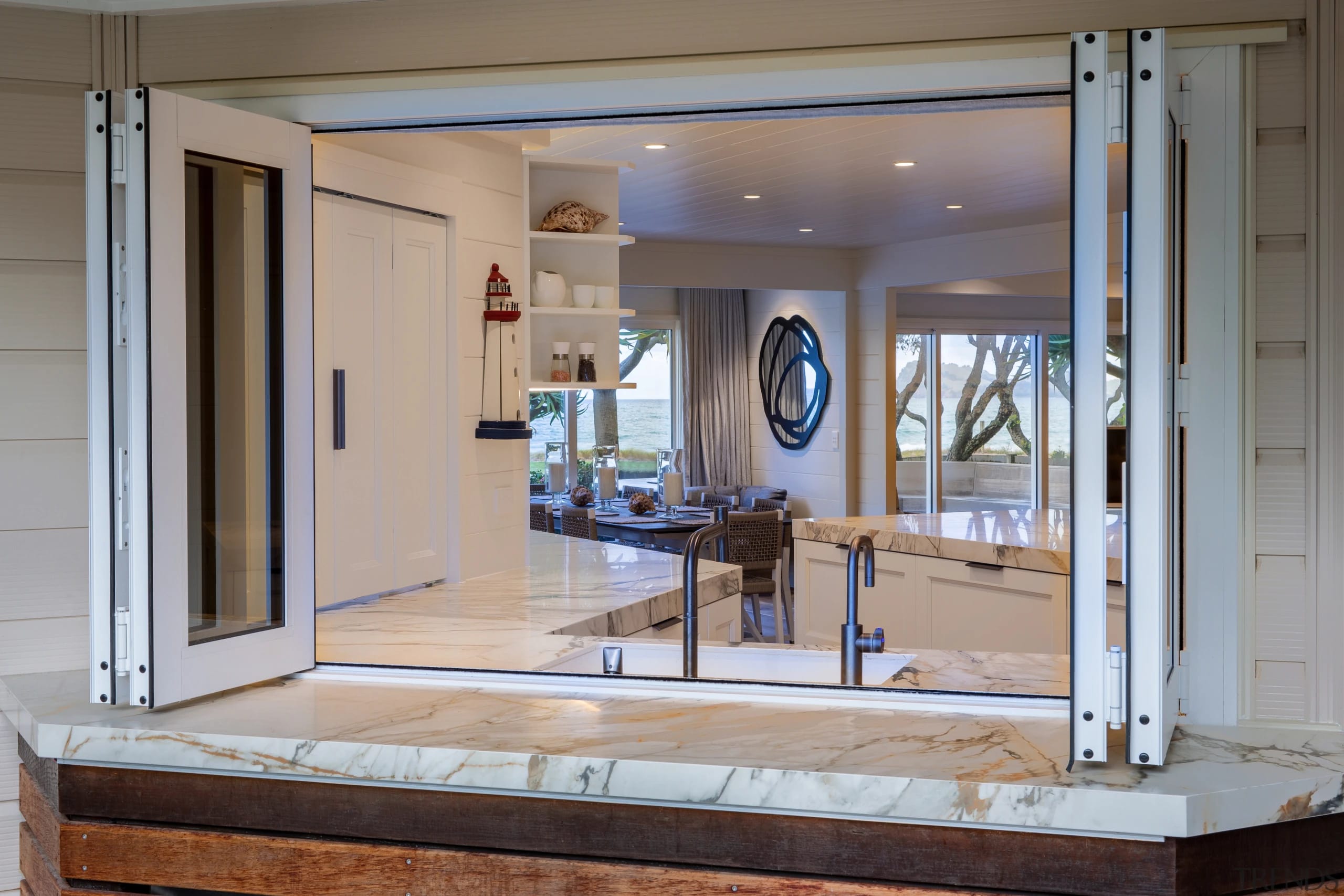 For maximum socializing and entertaining, I added a pass-through to the large lounge and a bi-folding window to the back deck, with an external matching benchtop connecting to the barbecue area.