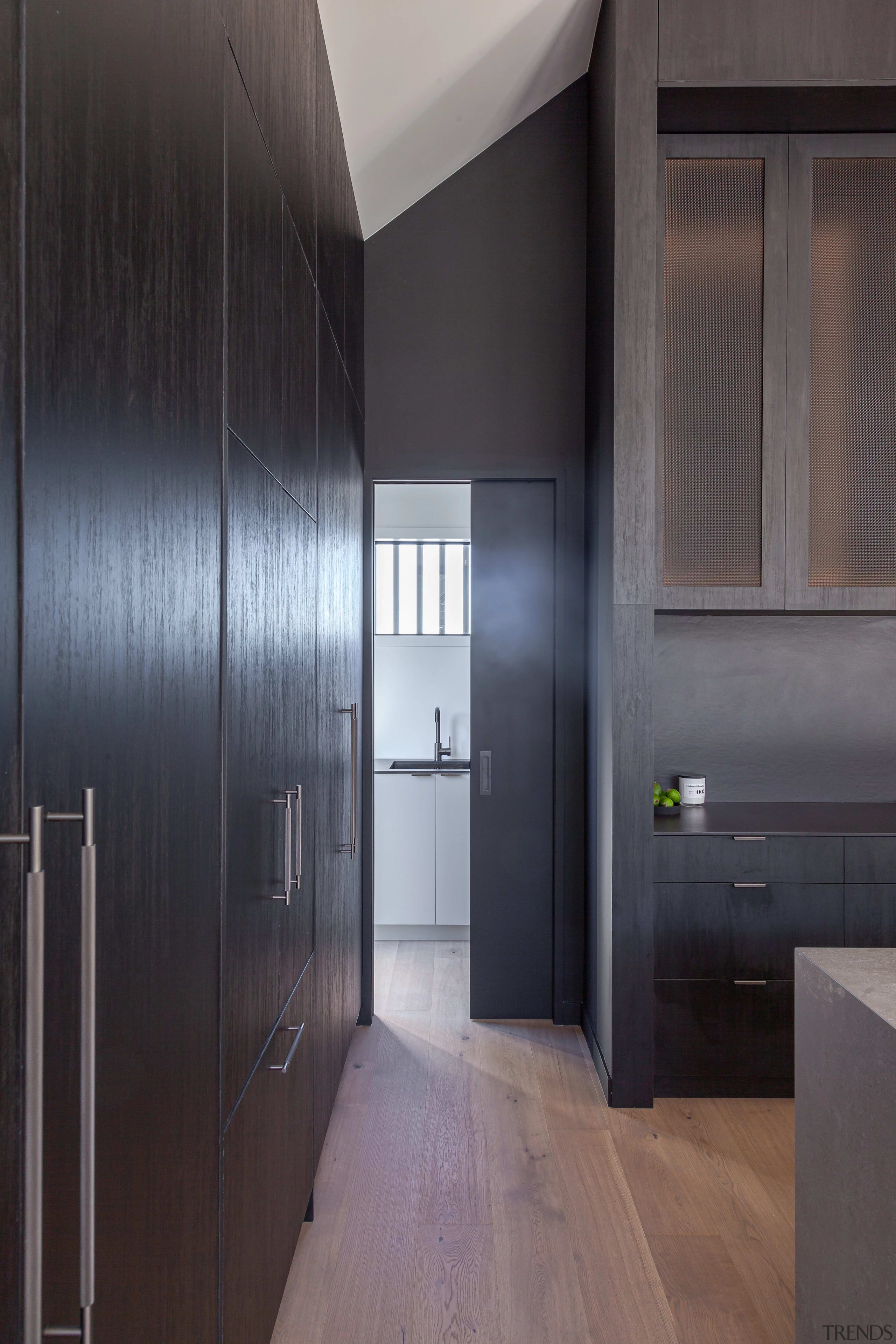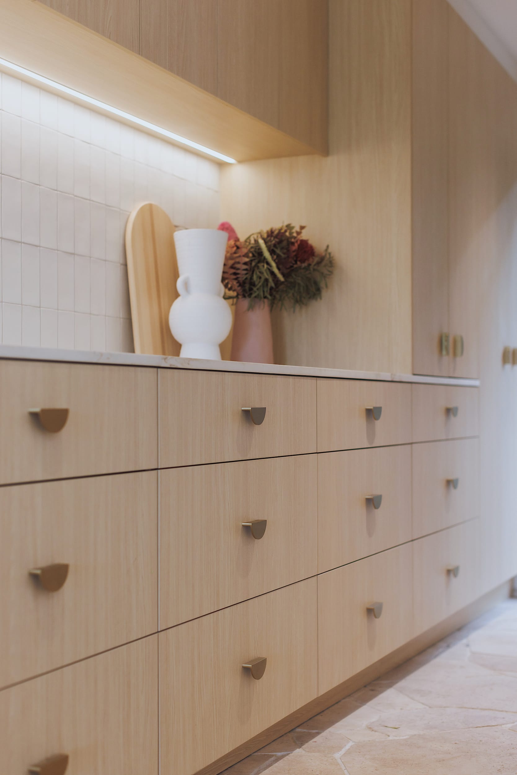 This modern, light-toned kitchen celebrates natural finishes and connects with its surrounding spaces functionally and aesthetically.