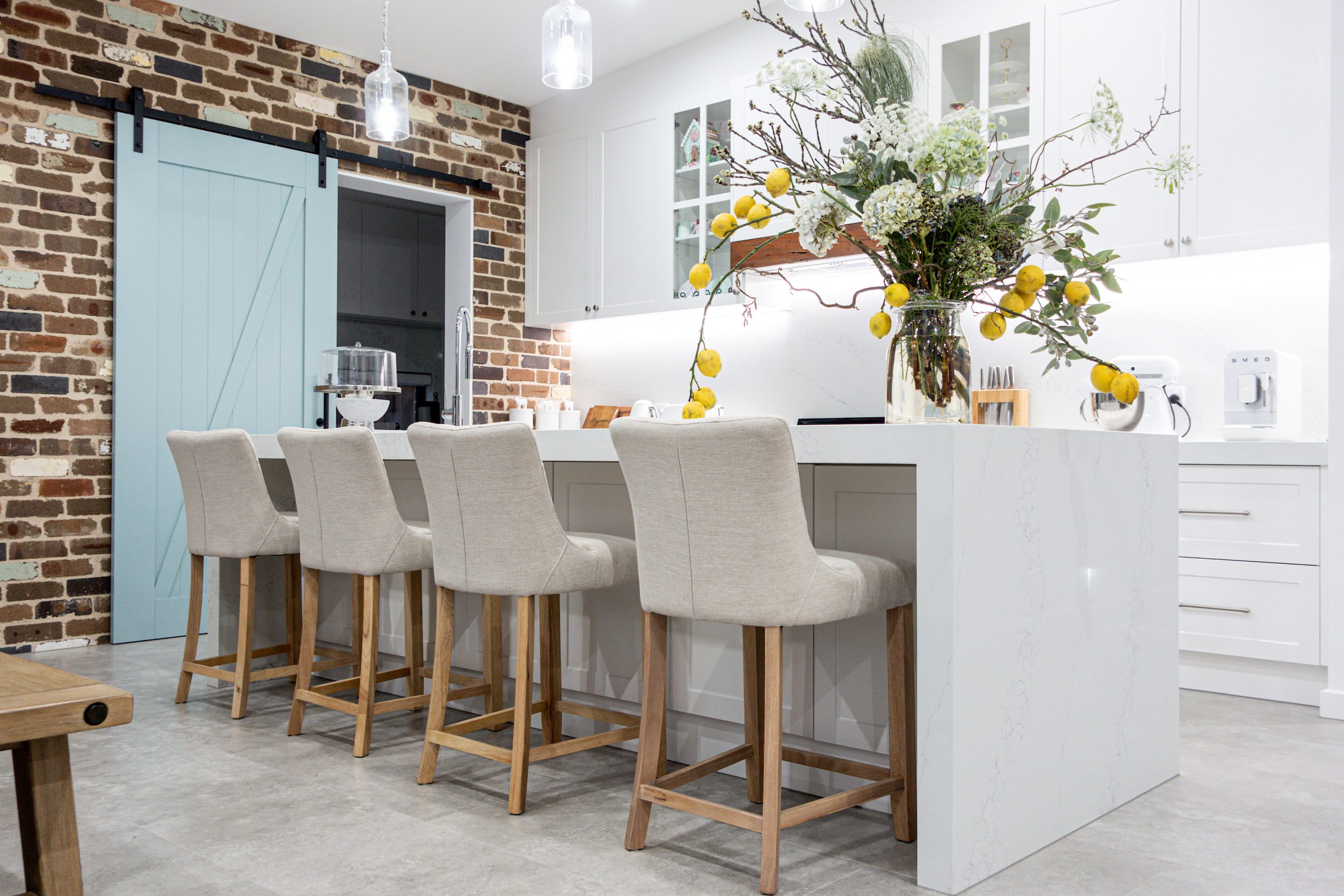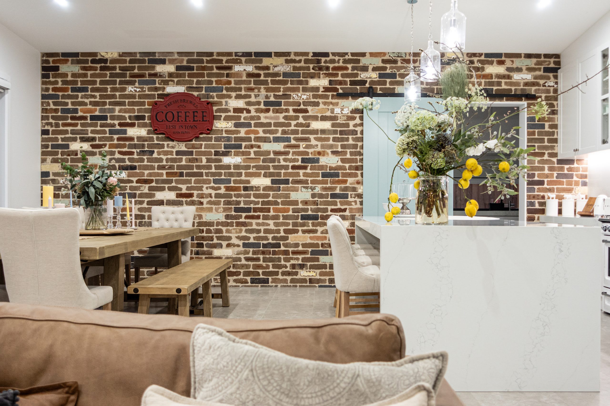 The focal point of the kitchen is the use of recycled brick, adding character and history to the space while promoting sustainability.