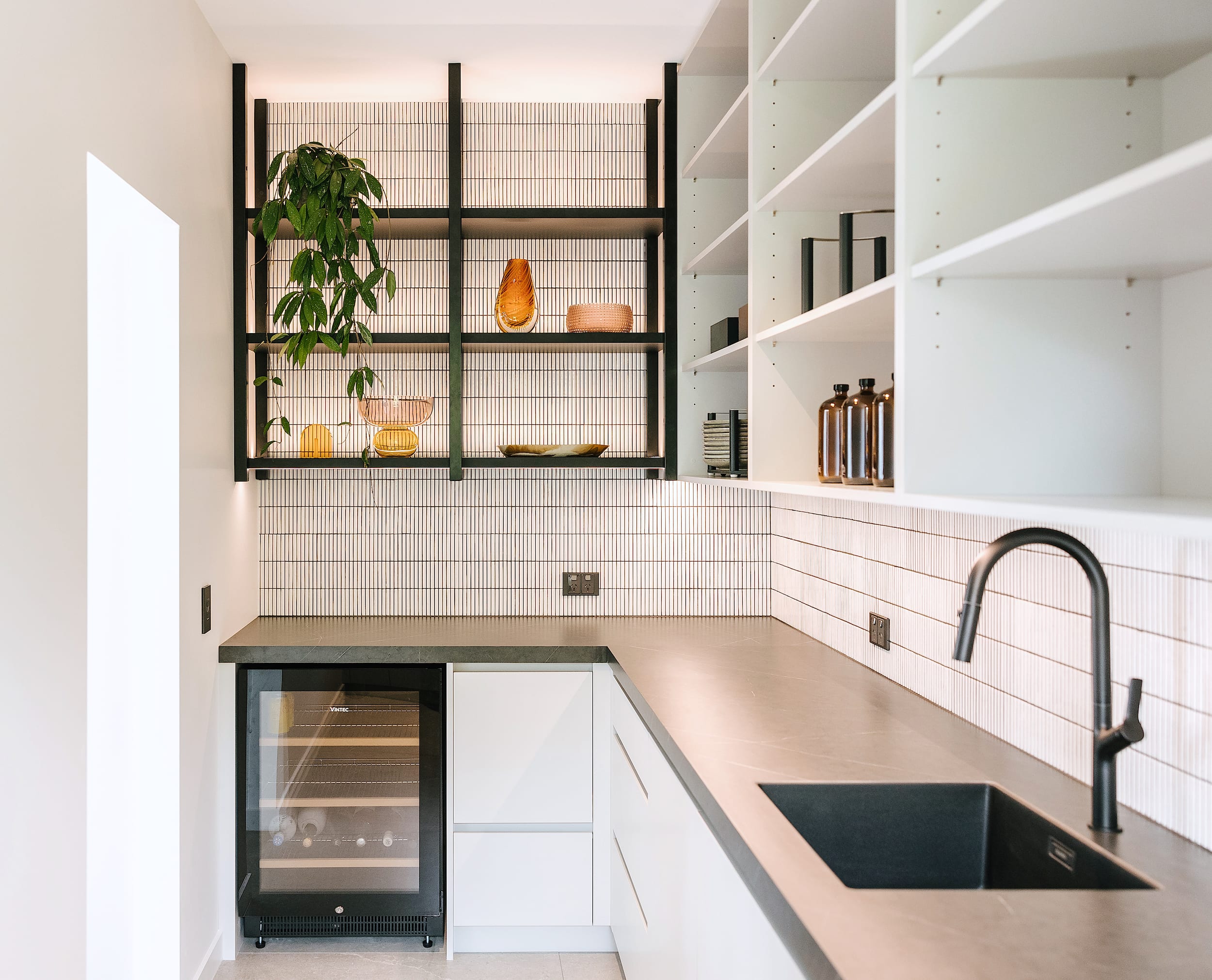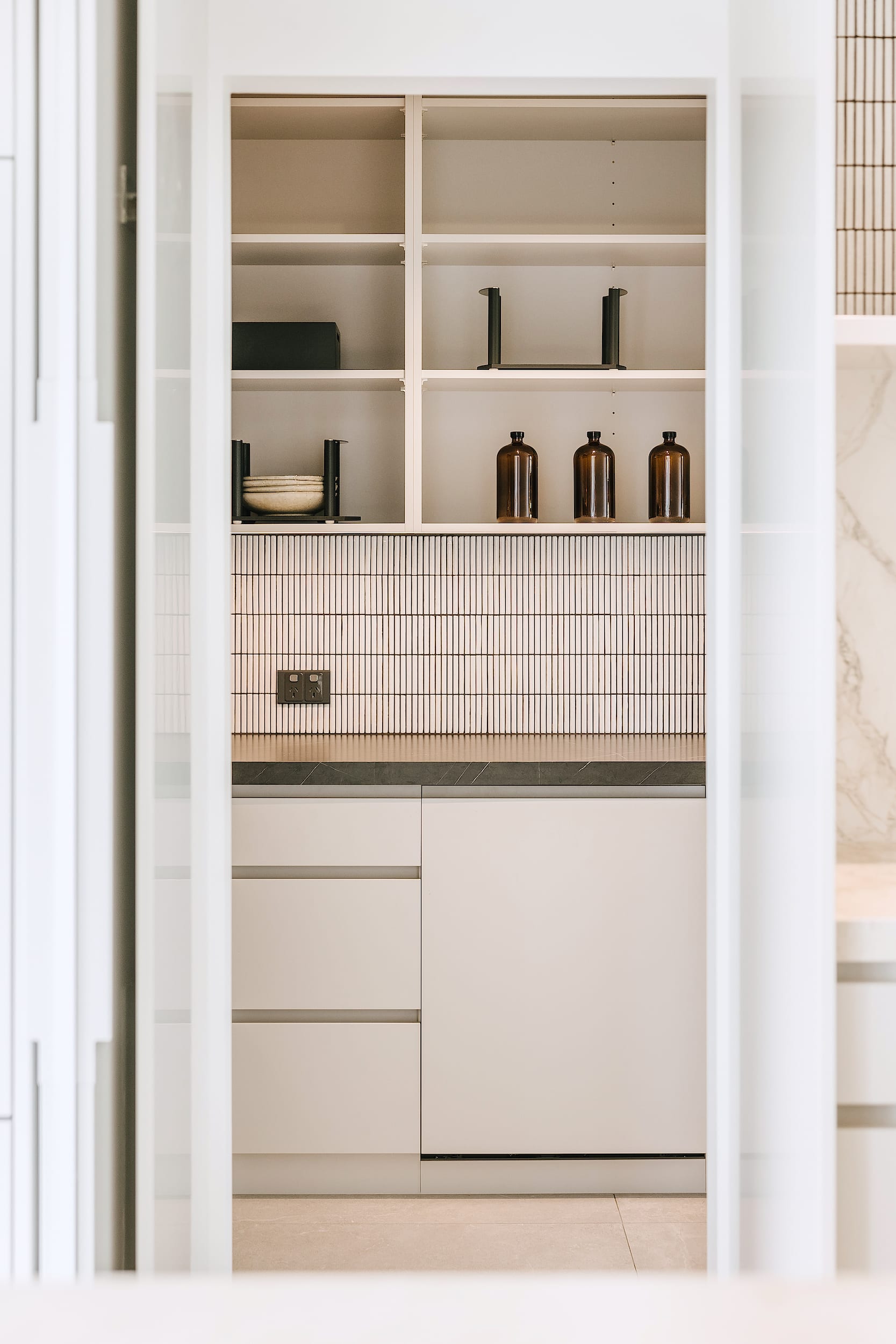 This was achieved through integrated appliances to limit their visual contribution and to rework the wall set out to allow pocket doors to give concealment to the scullery.