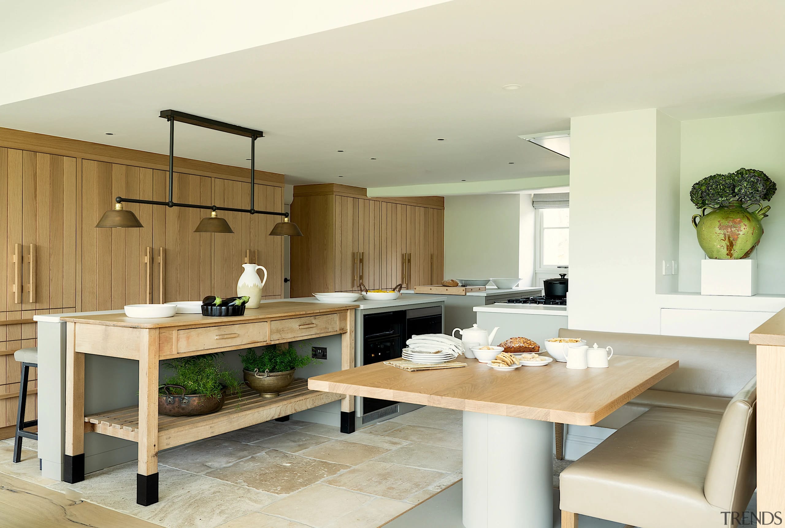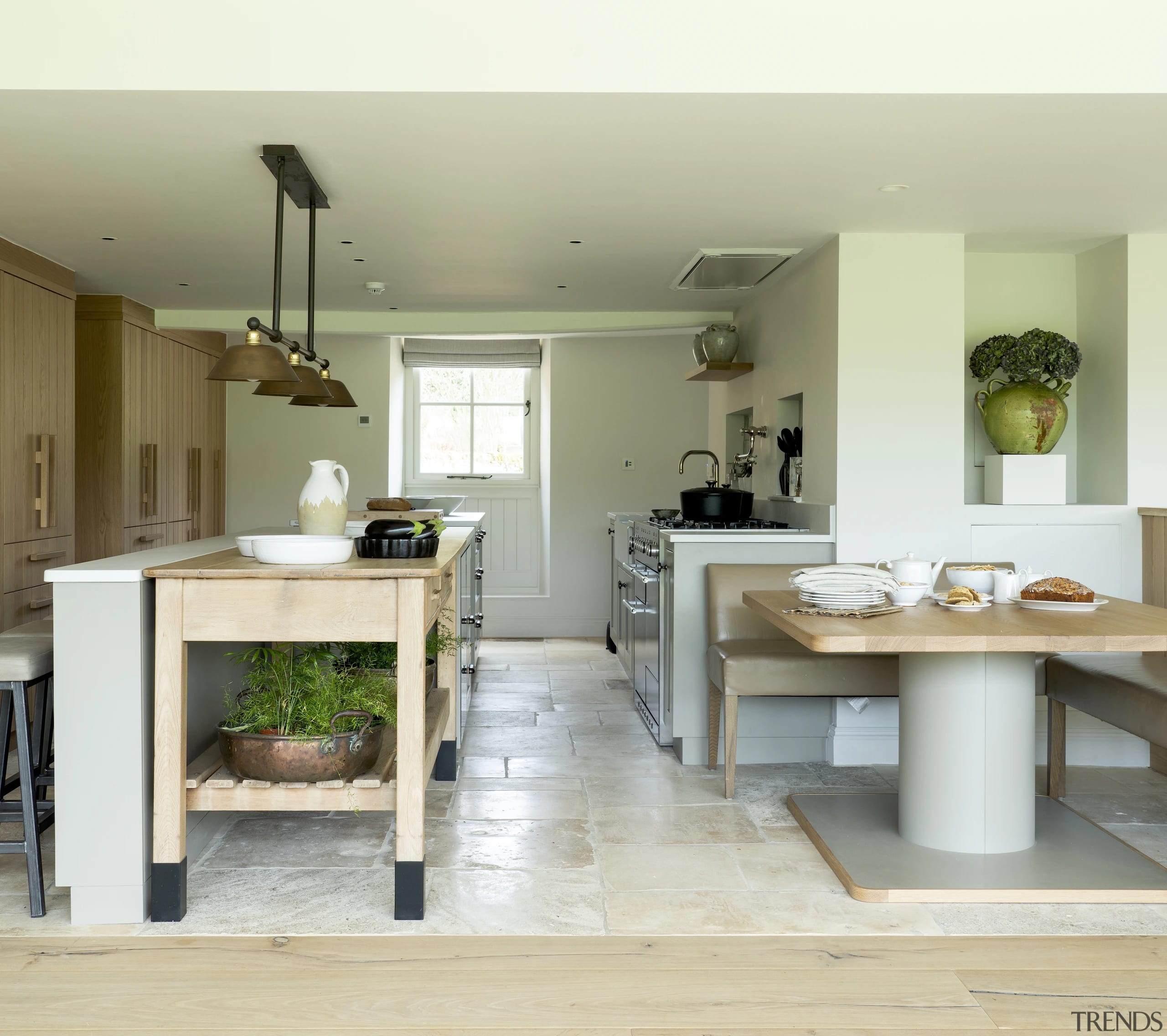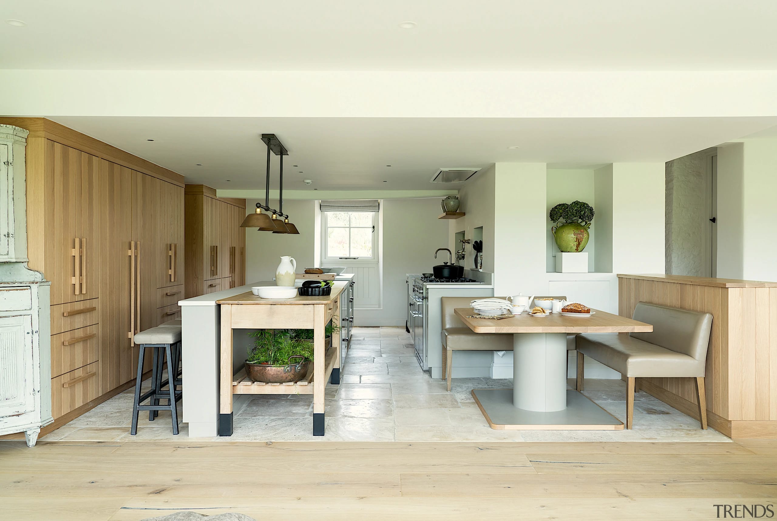 The original kitchen’s lower ceiling was continued over the extended kitchen to the end of the island and kitchen dining area and at the same point the flooring changes from original flagstones (calibrated and re-laid for UFH) to extra-wide natural-oak floorboards creating a clear delineation of the kitchen.