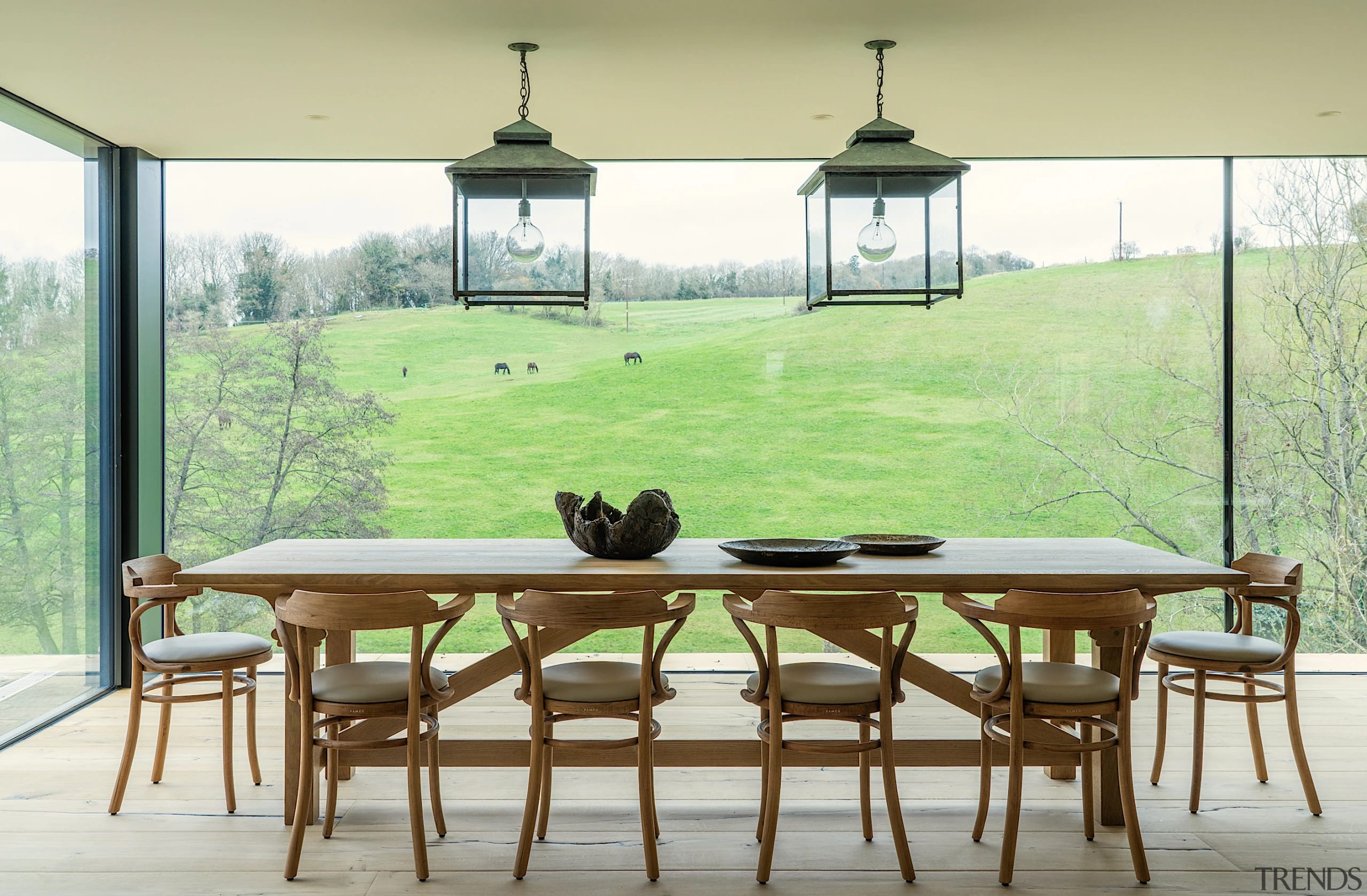 Verdigris features in the lights over the oak dining table and decorative ceramics.