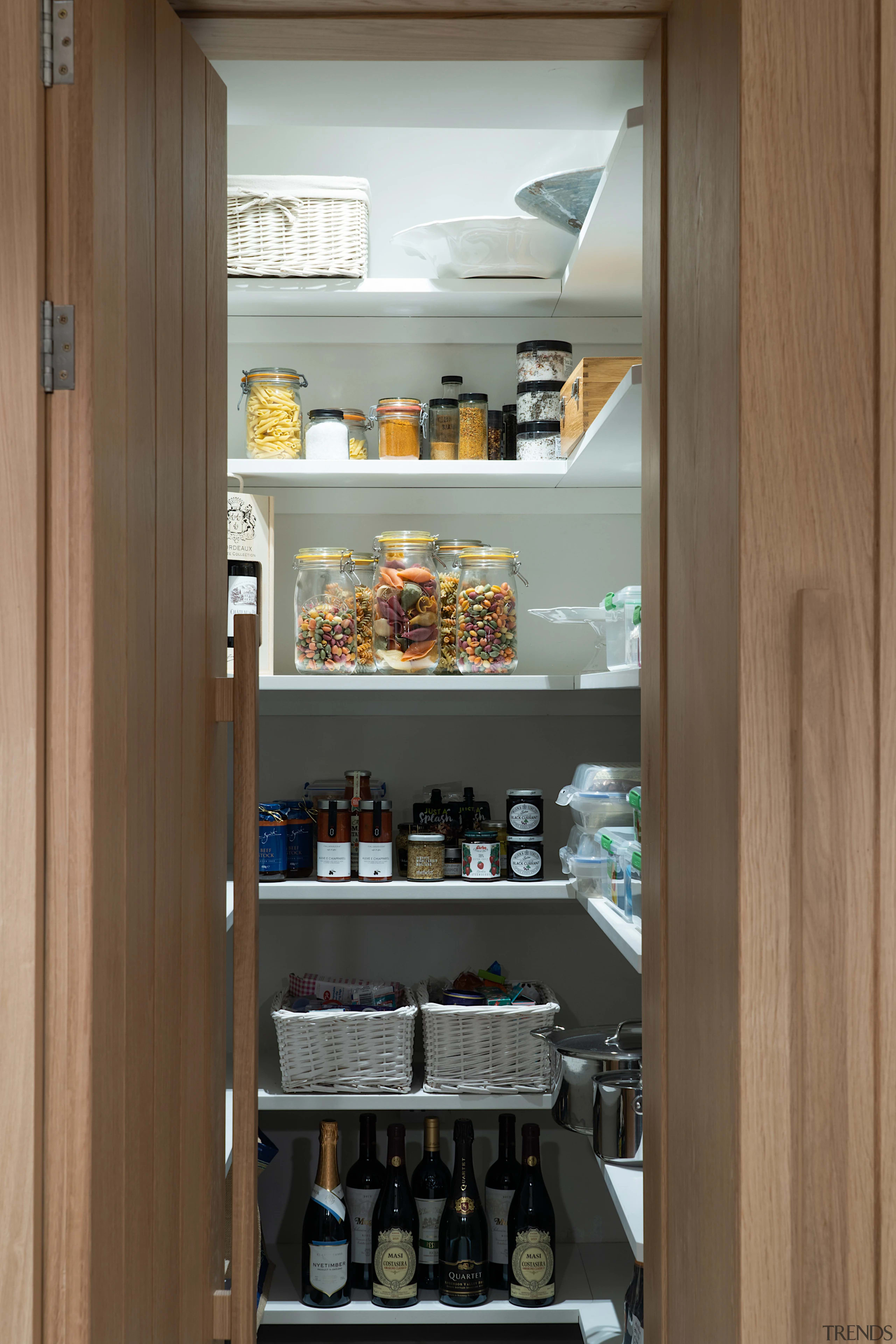 A run of floor-to-ceiling units, panelled in sawn-edge oak with matching long handles, incorporates appliance cupboards with foldaway doors, a walk-in pantry accessed through a secret door, glassware storage, pull-out drawers and a fridge/freezer.