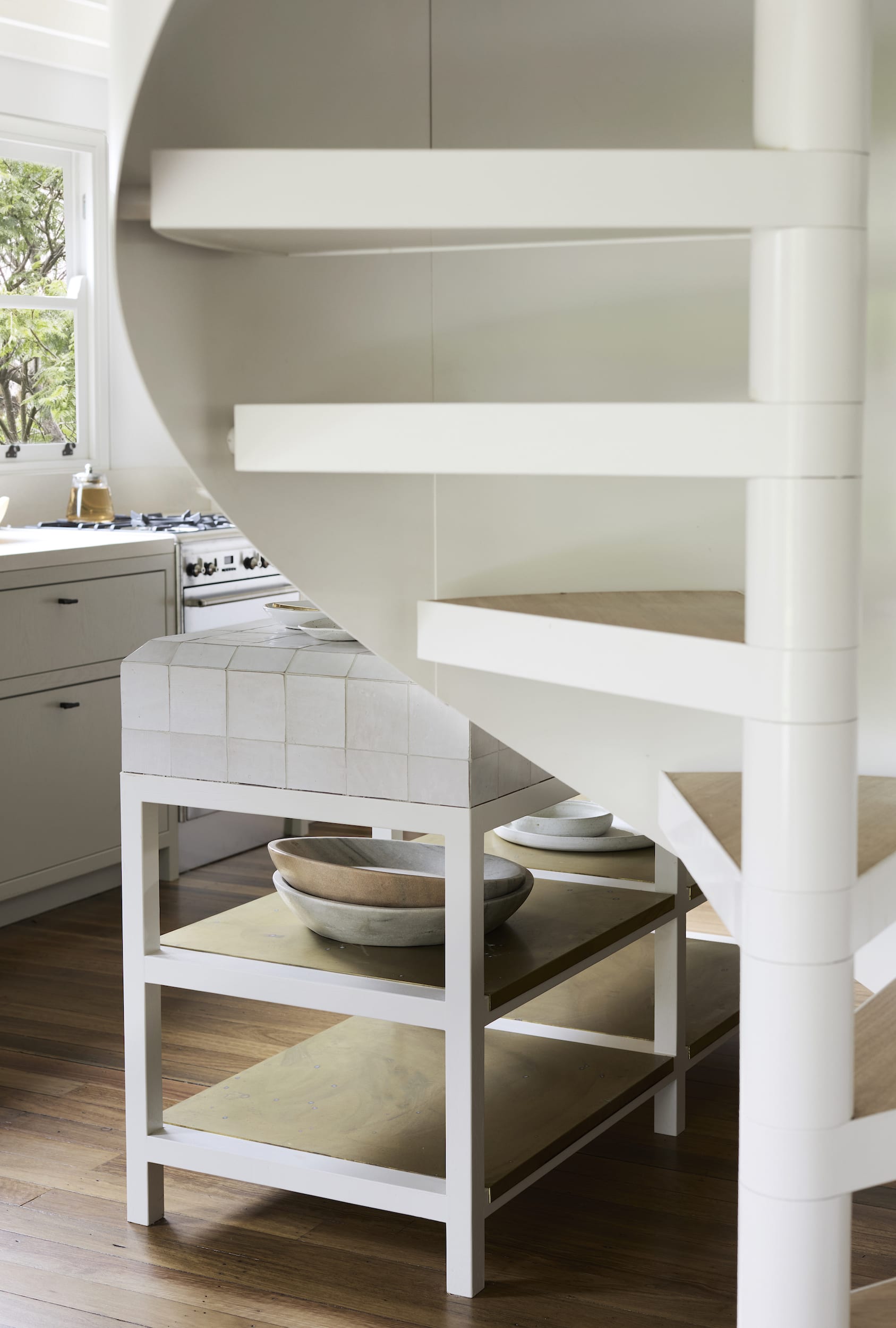 The freestanding island bench, with its hand-made ceramic glazed tiles, painted timber, and raw brass-capped shelving, acts as both a functional workspace and an architectural focal point.