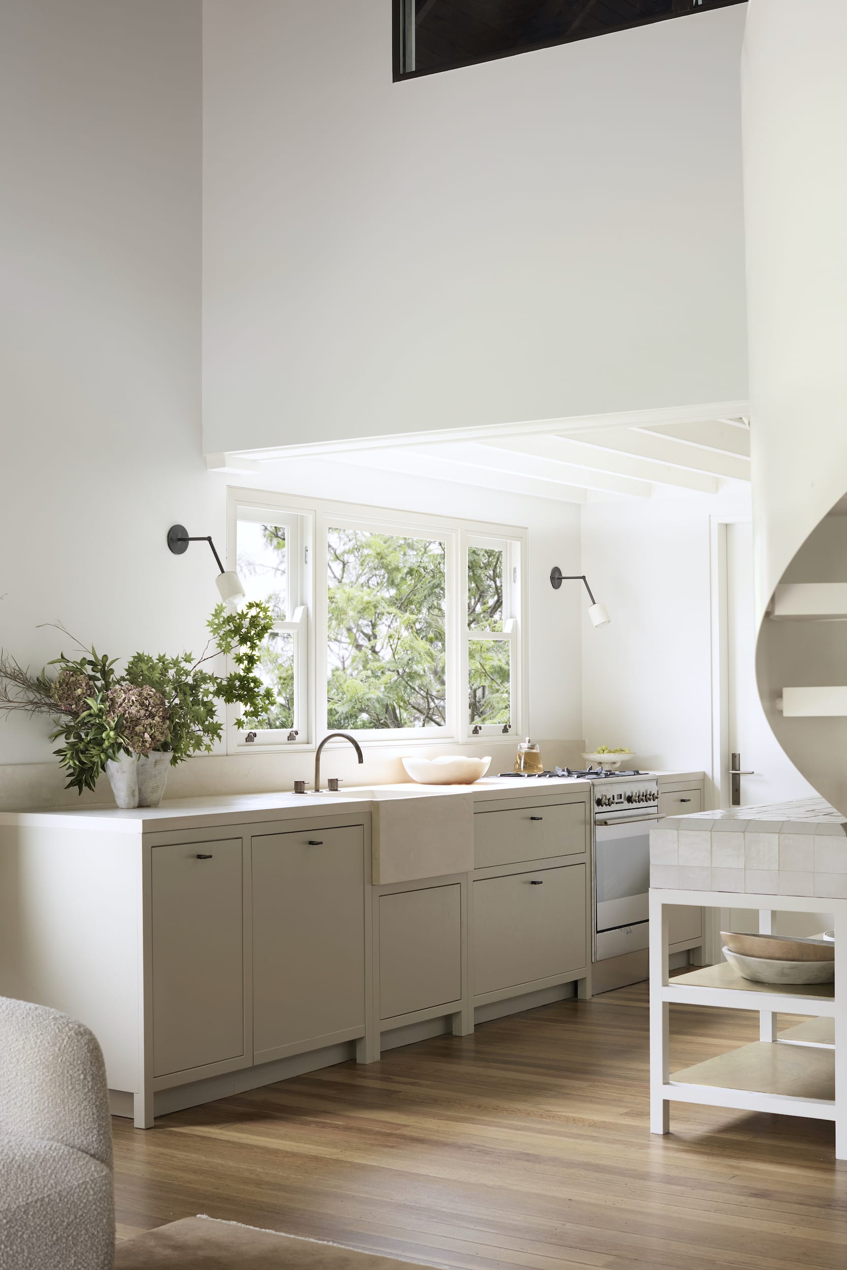 The flooring is juxtaposed with contemporary elements, such as the painted veneer cabinetry, custom neutral-toned concrete benchtop, and moulded butler’s sink.
