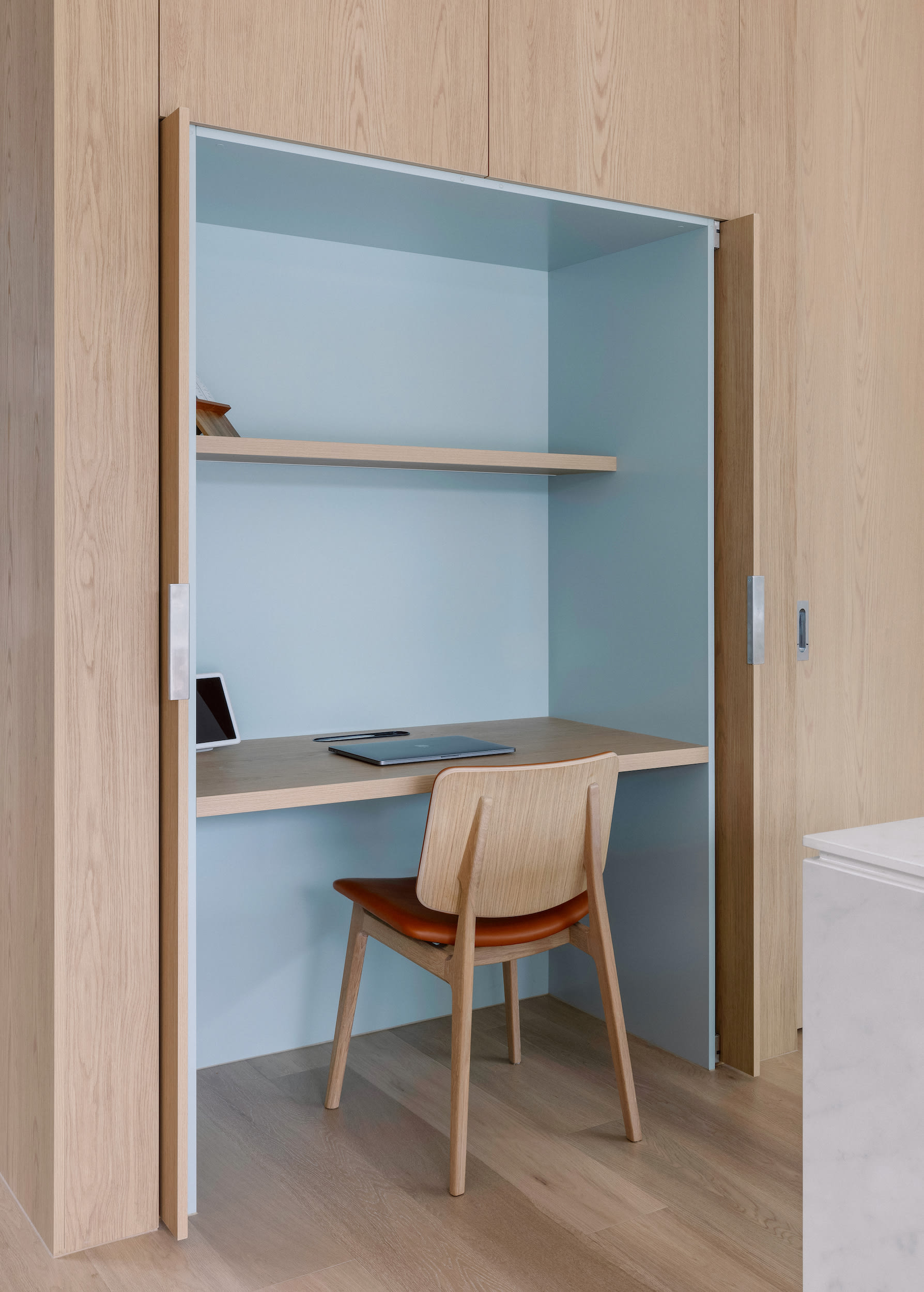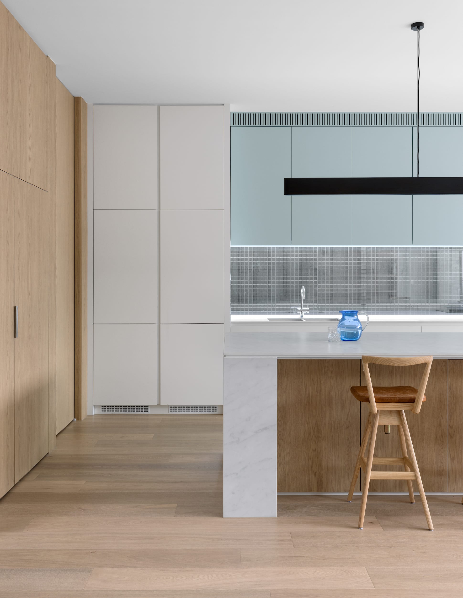 A palette of pale oak timbers, warm greys and lightly textured stone and concrete add texture and warmth to the spaces, with subtle blue accent joinery and wall finishes adding touches of colour throughout.