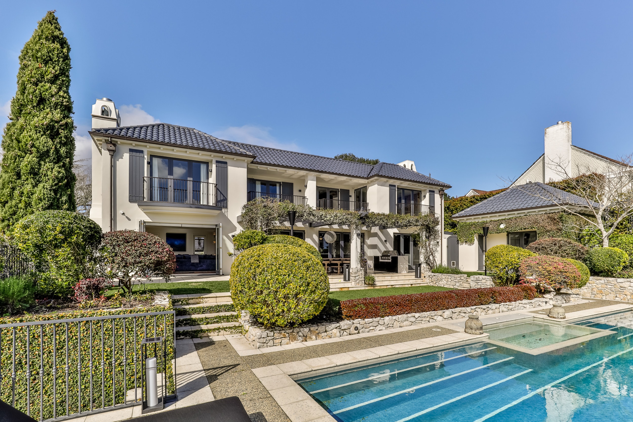 A 25-year-old mansion right on the water overlooking Auckland city skyline was designed to be reminiscent of a Mediterranean villa, with classic features and ochre exterior walls with aqua trim.