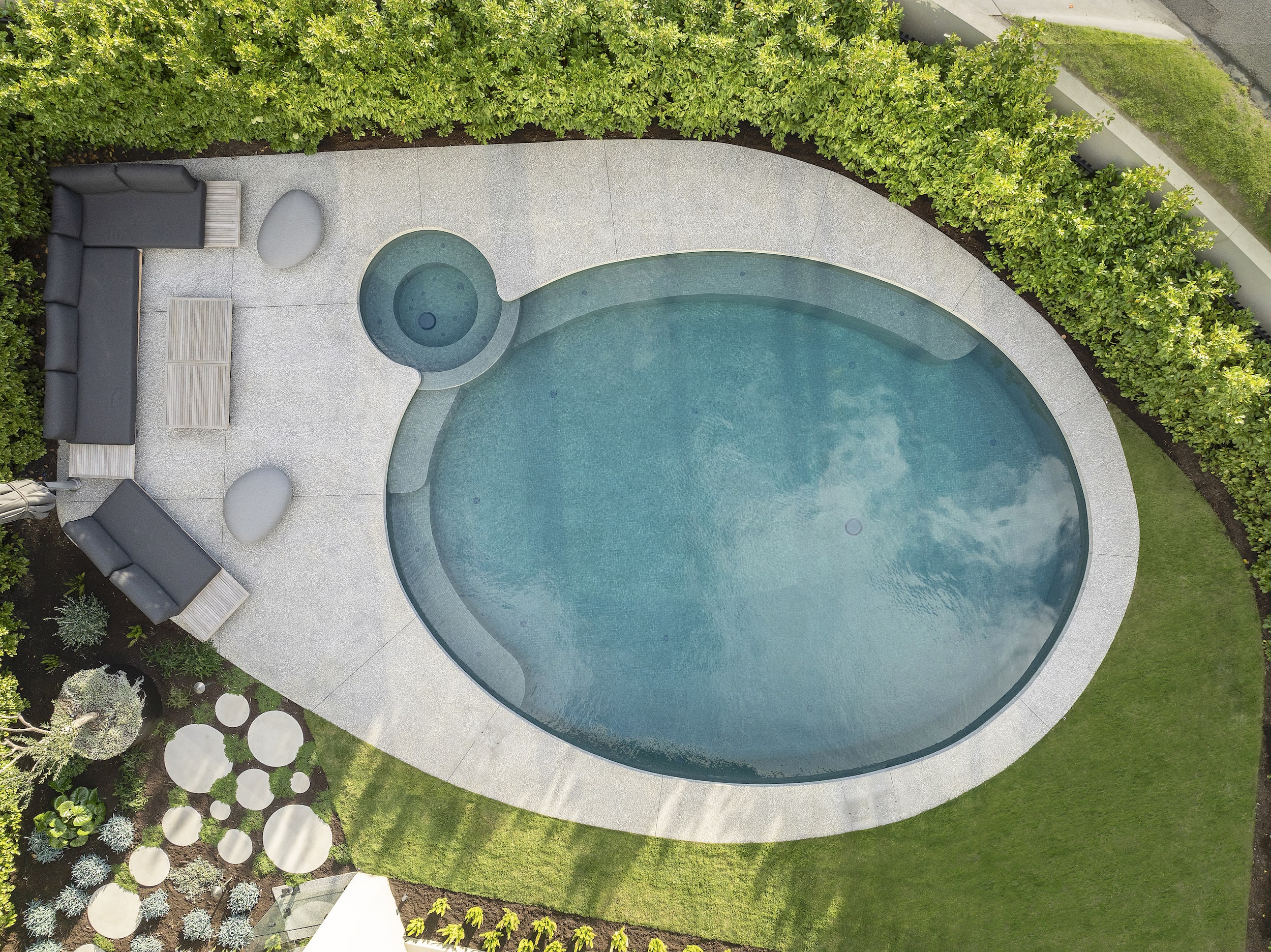 Circles within circles – despite limited grounds, this compact front garden and accompanying space-saving pool with inset spa, by Waterview Pools, achieve an airy, spacious feel.