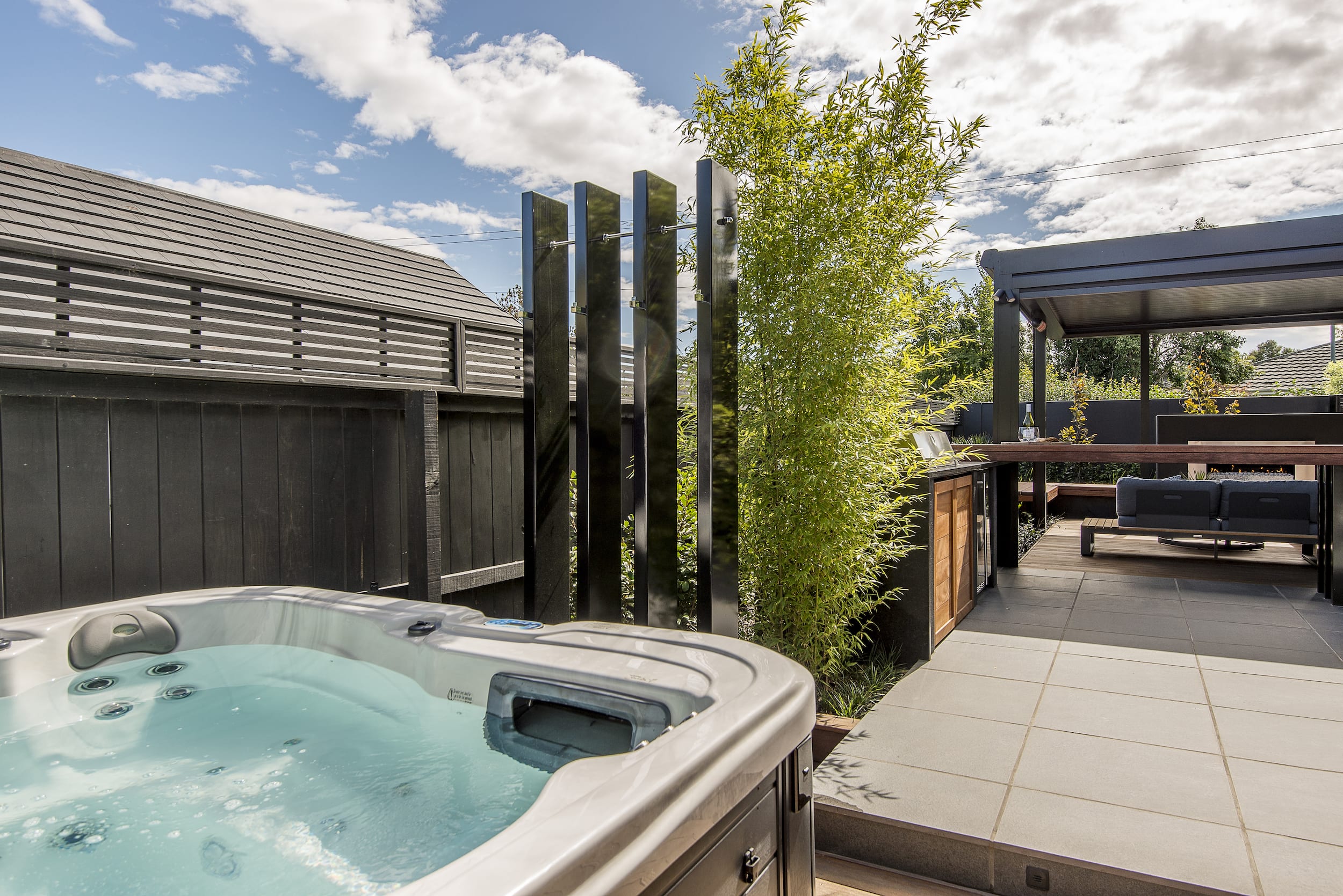Spas are often connected to swimming pools but this one goes out on its own, creating an oasis of soaking within a desert of decking – the spa can be covered by a retractable kwila cover.