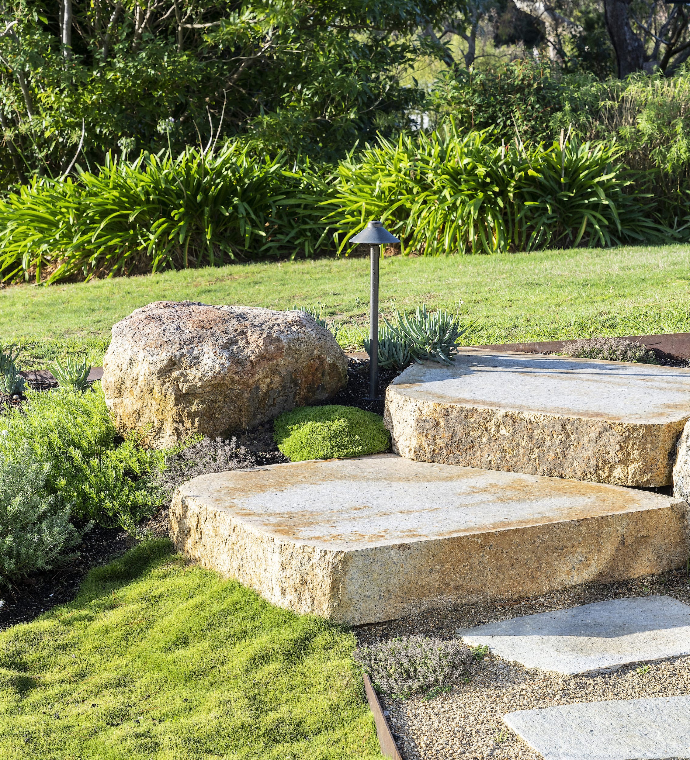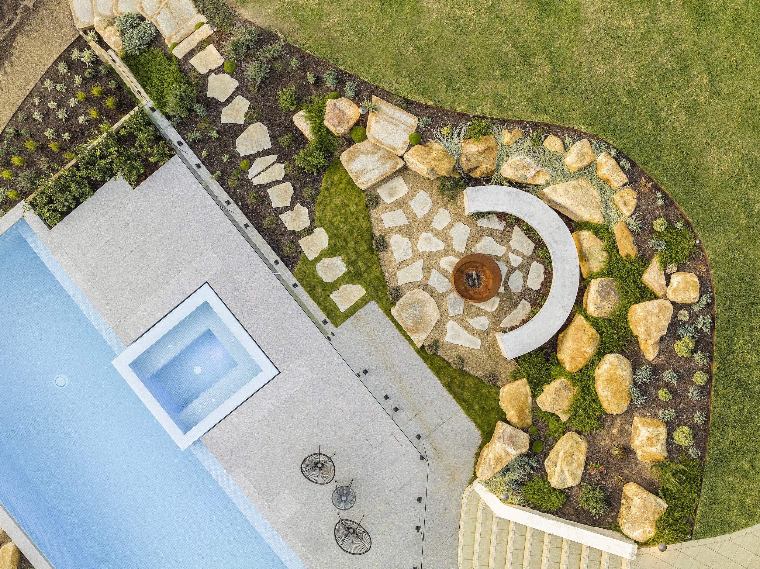 In response, we incorporated an informal firepit area that consists of honey granite rocks that were required, given the sloping nature of the ground, to retain the garden behind with rock steps and stepping stones with ground cover throughout.