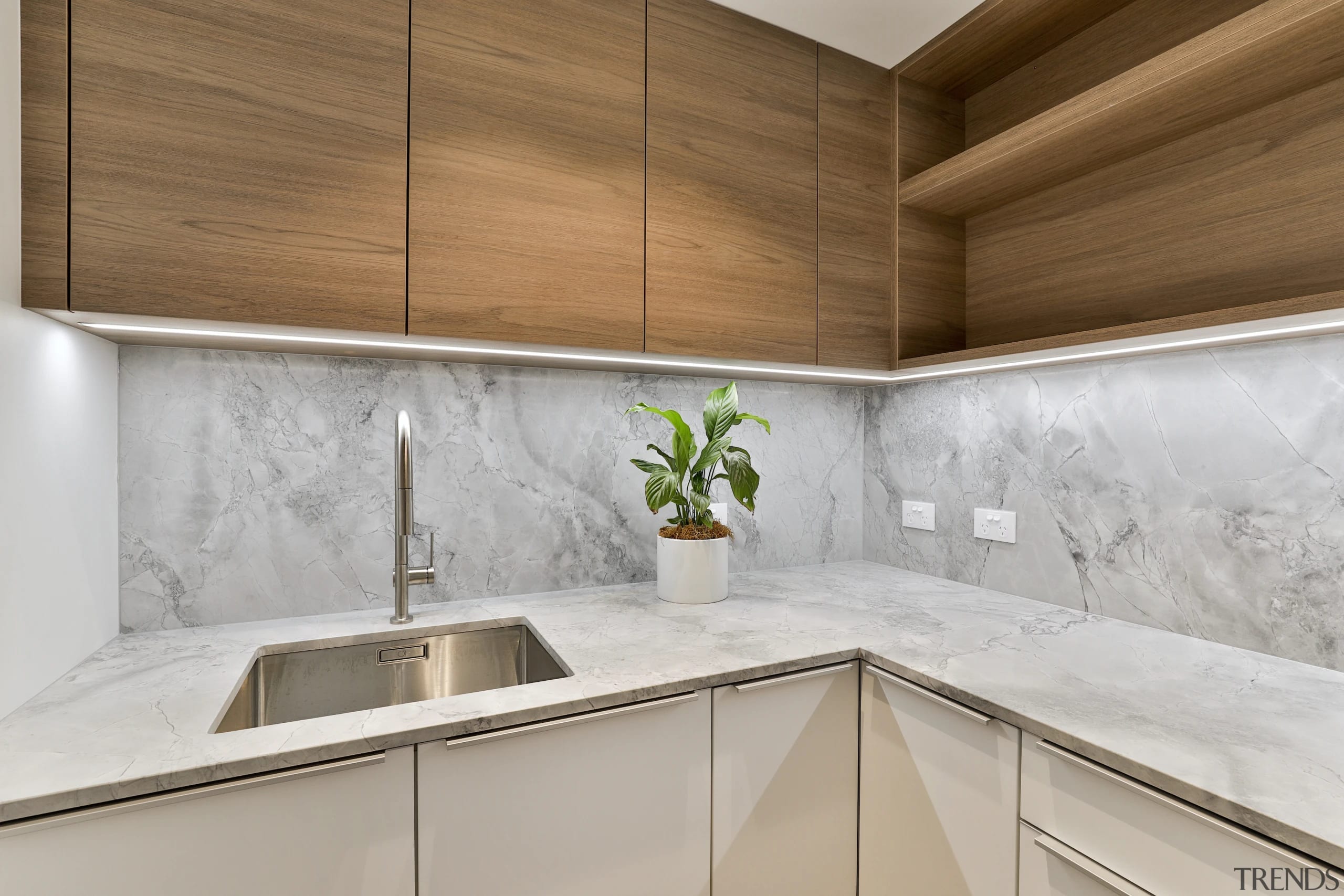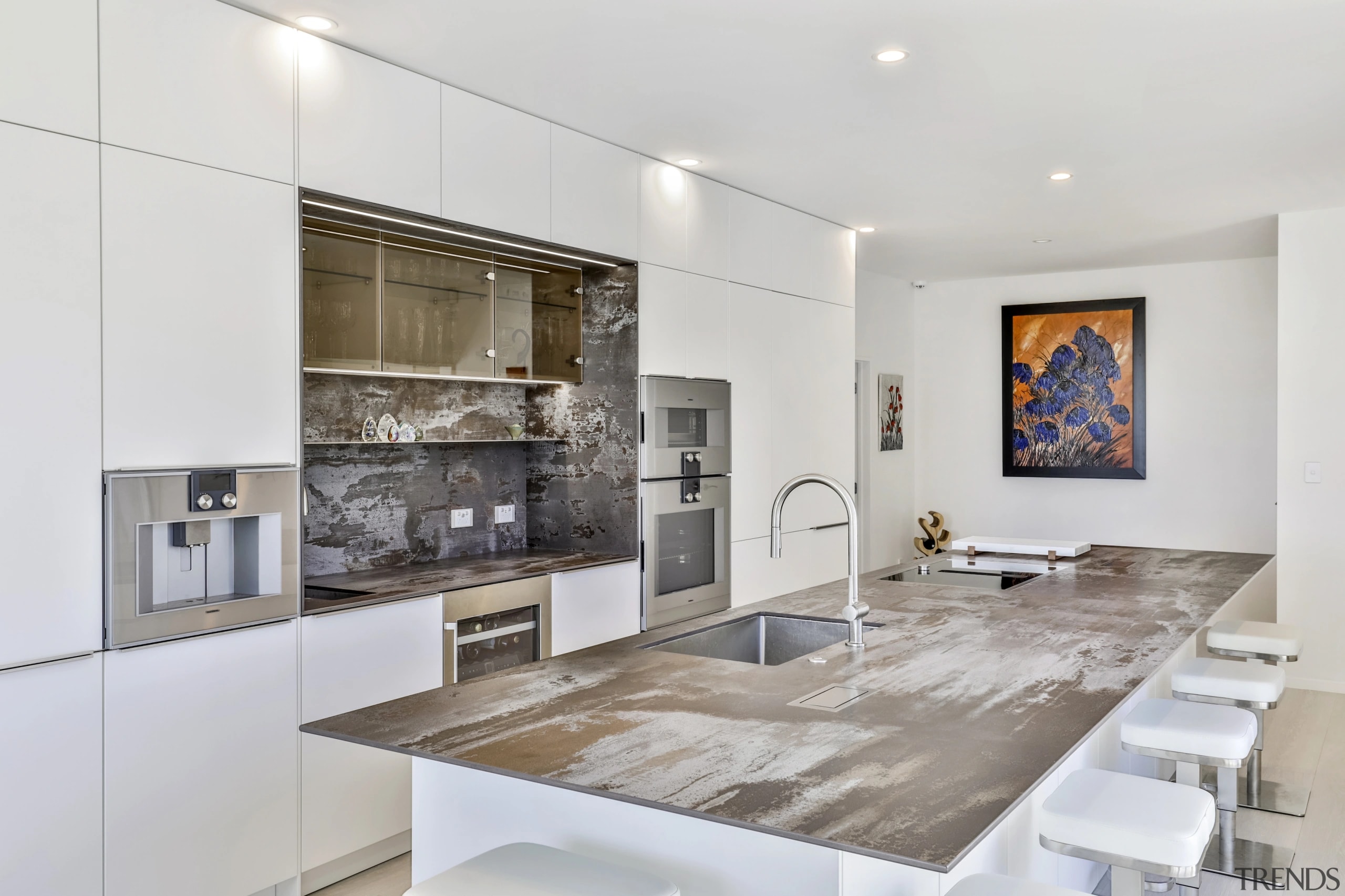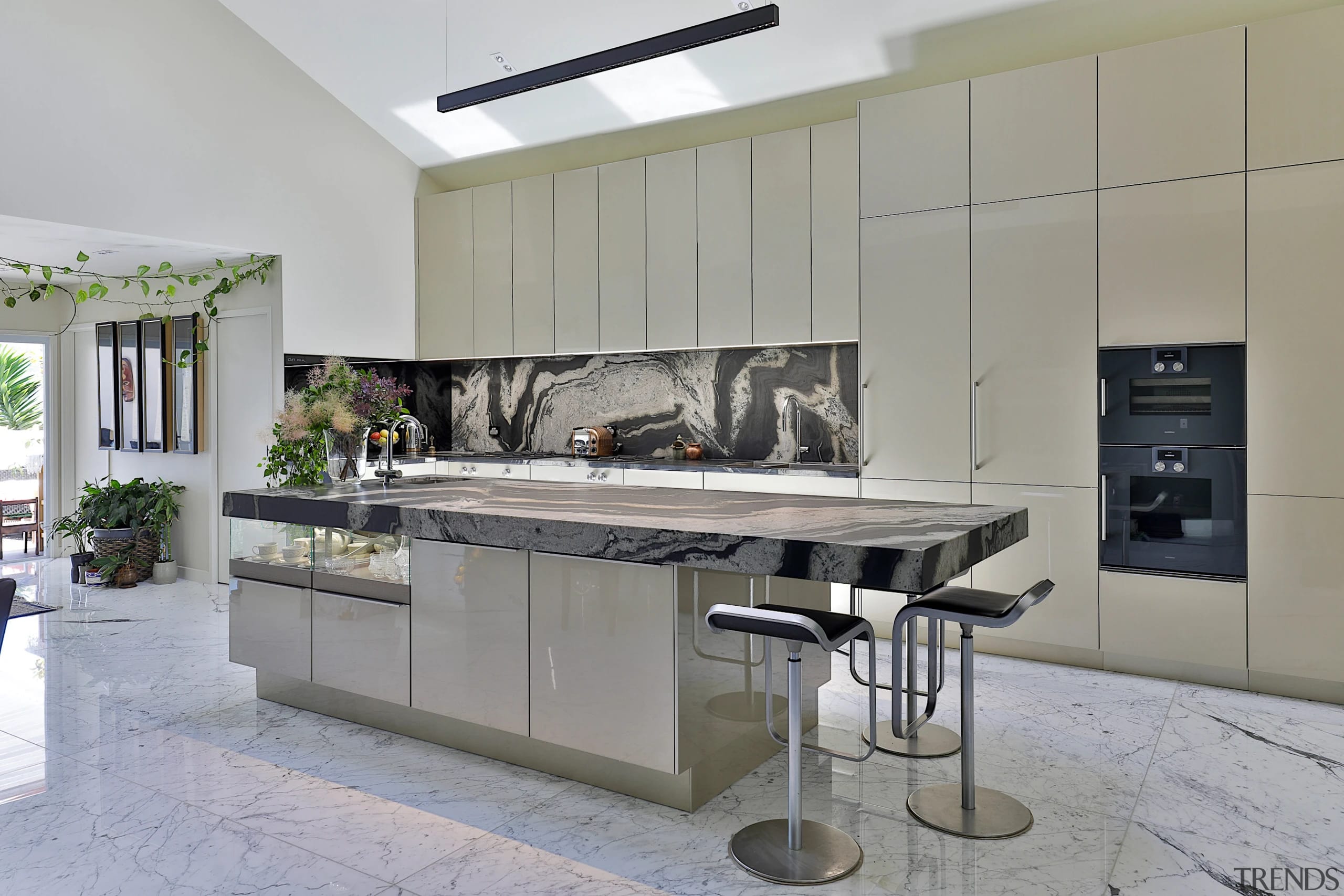 The practical is downplayed in this kitchen while marble look surfaces, modern stools and chic lighting hold sway