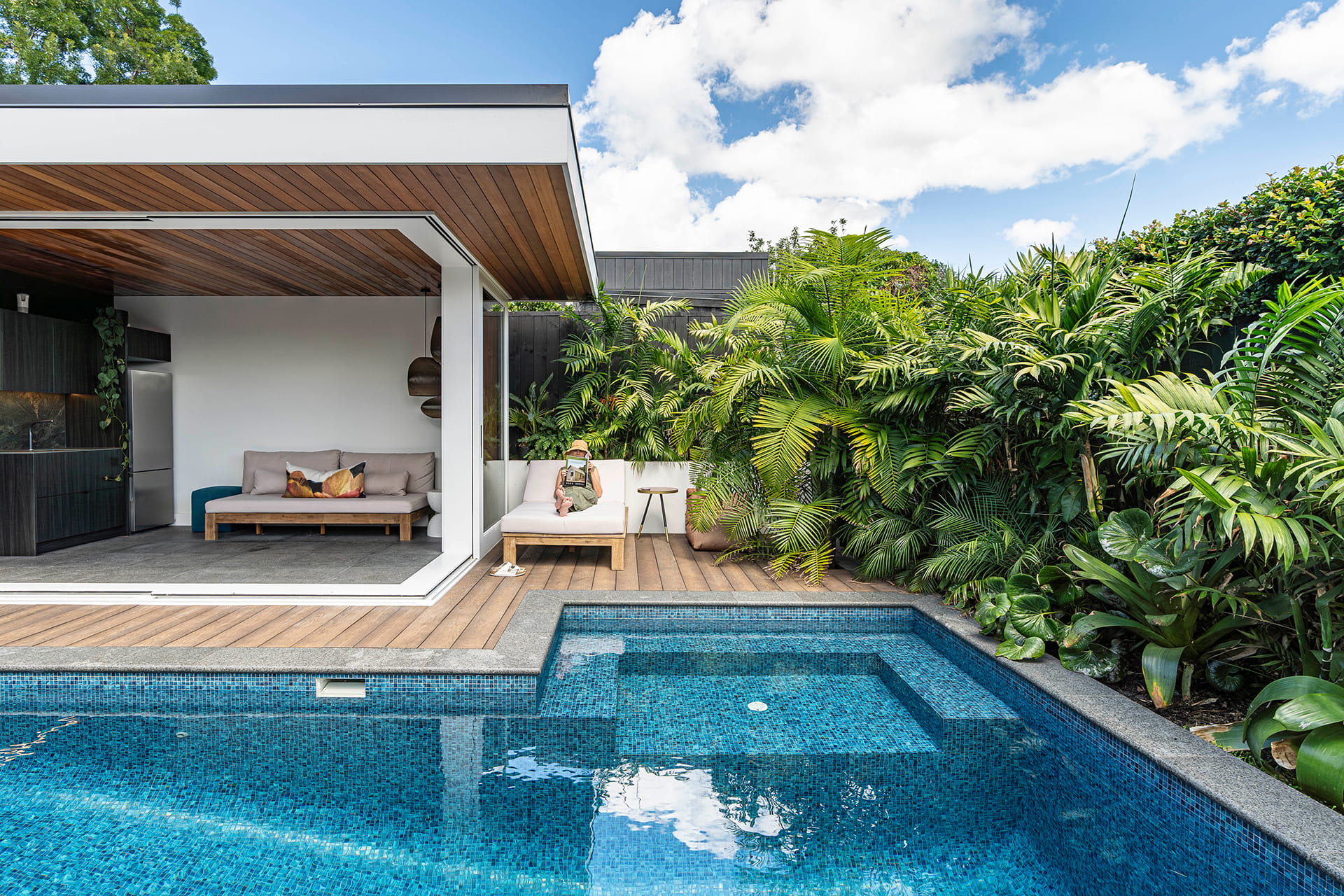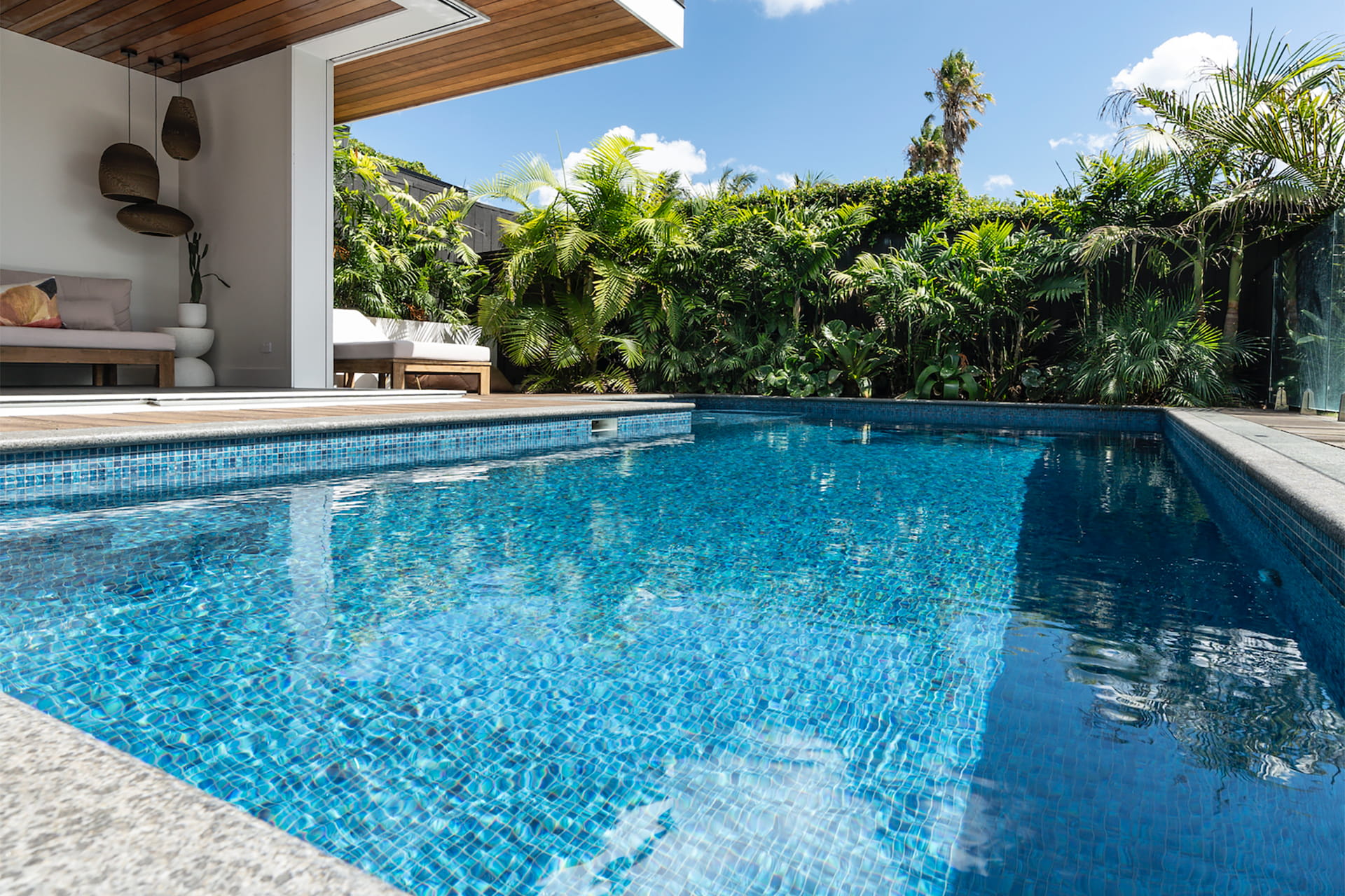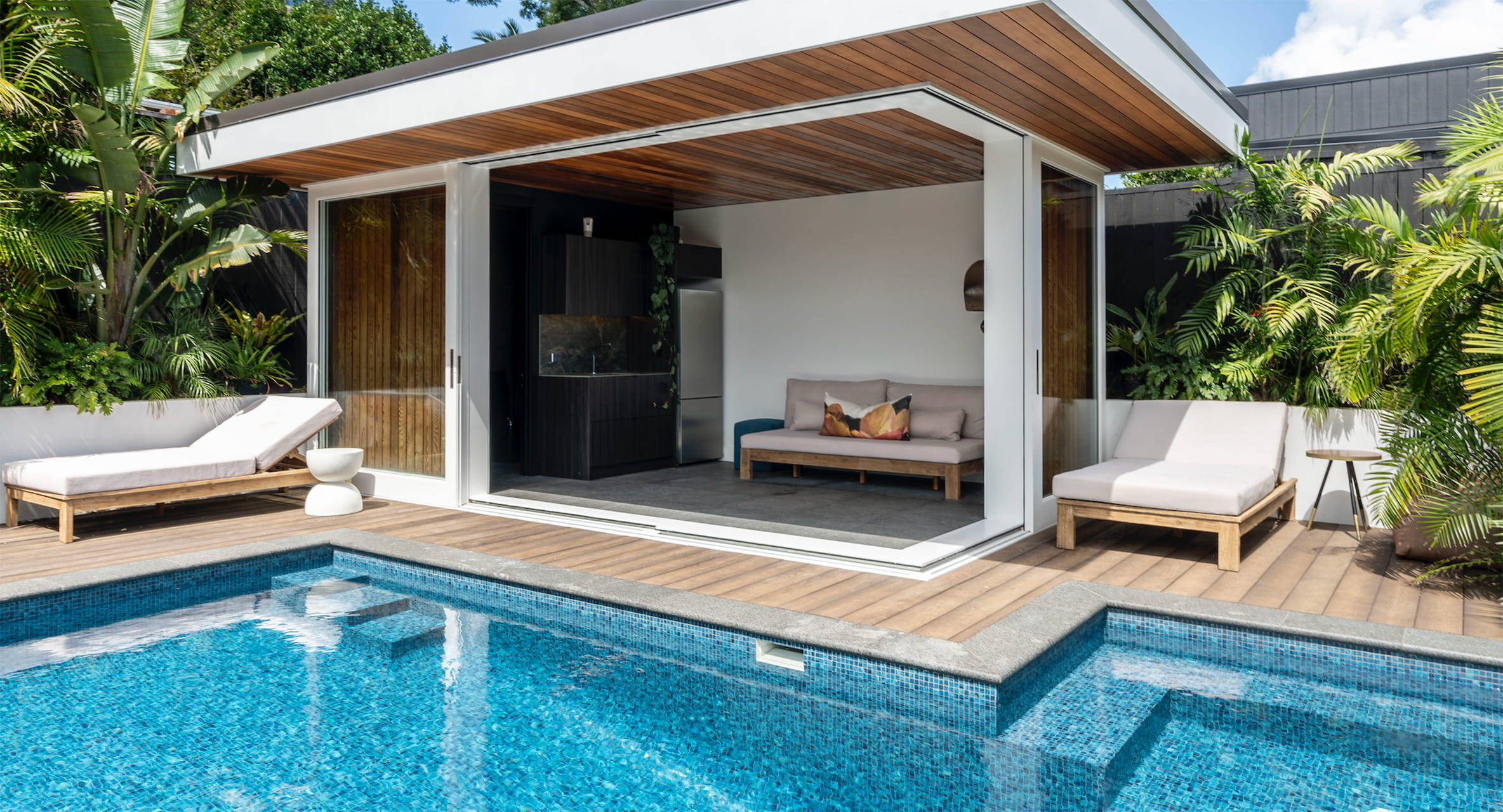 The owners of this fully renovated villa envisioned a pool area that exudes a resort-like ambiance. Their brief specified a deep pool with a built-in seating area for relaxation, seamlessly integrated with the entertainment hub of the pool house. To achieve this, they opted for a fully tiled pool, wooden decking, and lush tropical greenery.