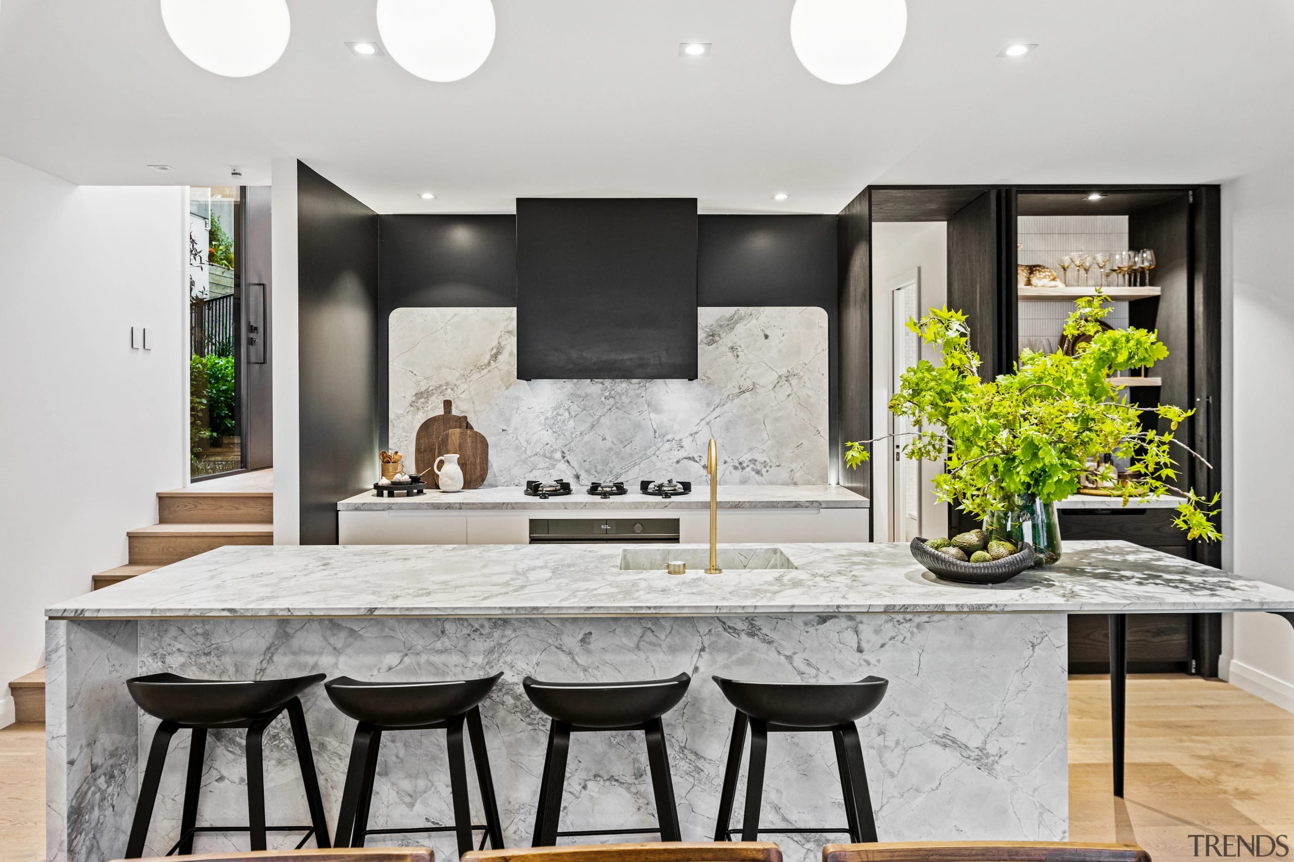 Within the main kitchen, the generous island was designed facing the sea and city views so we can sit with our friends and family around all three sides, allowing conversations to flow freely.
