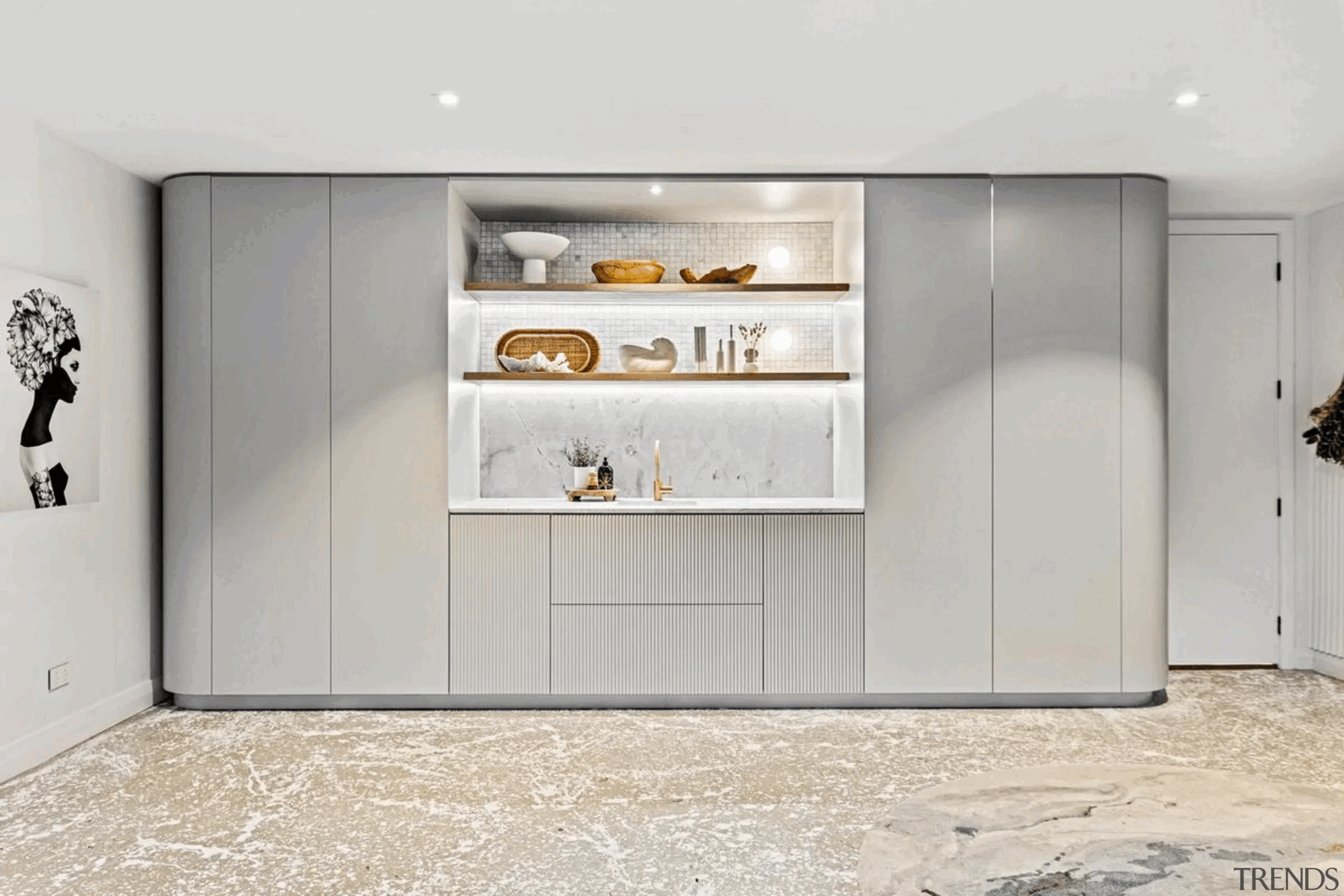 The subtle curves in the wall panelling, cabinetry and benchtop, kitchen splashback and furniture introduce a lovely flow-on effect and cohesion throughout the home.