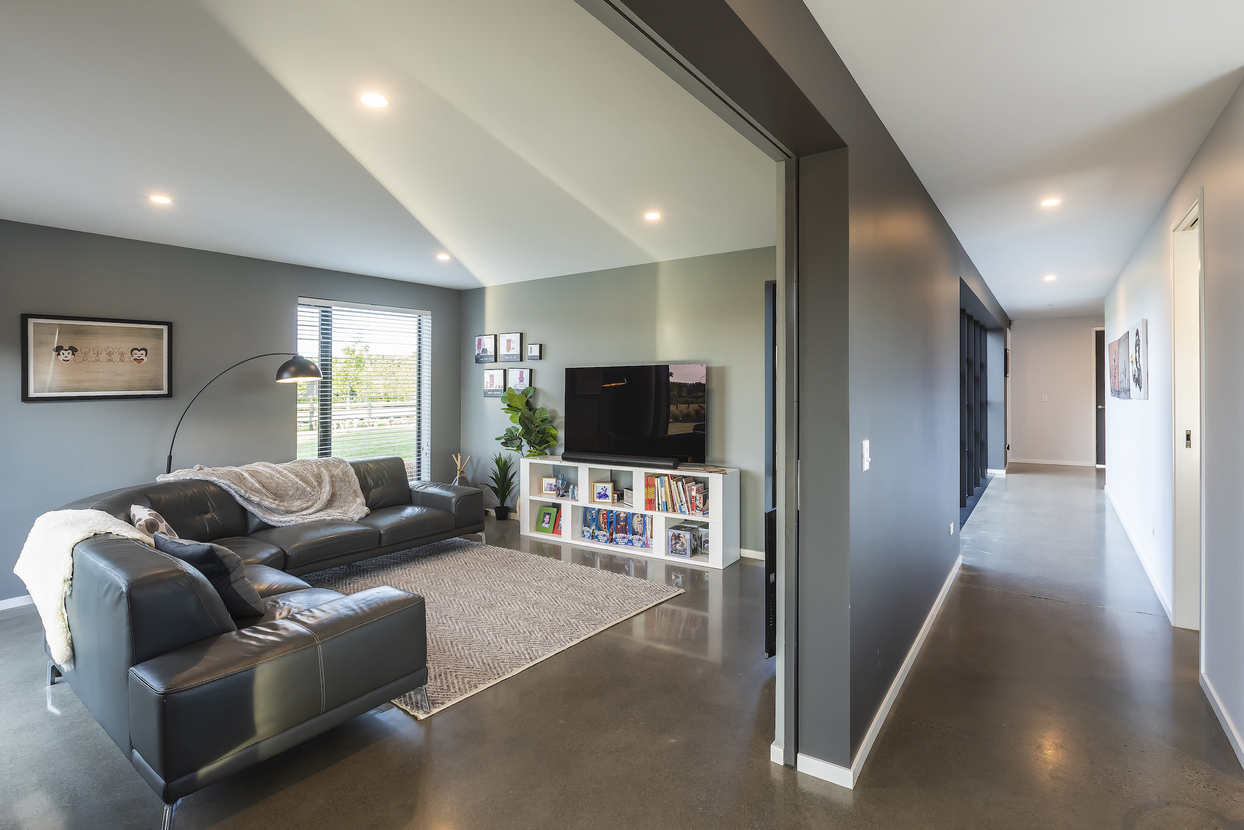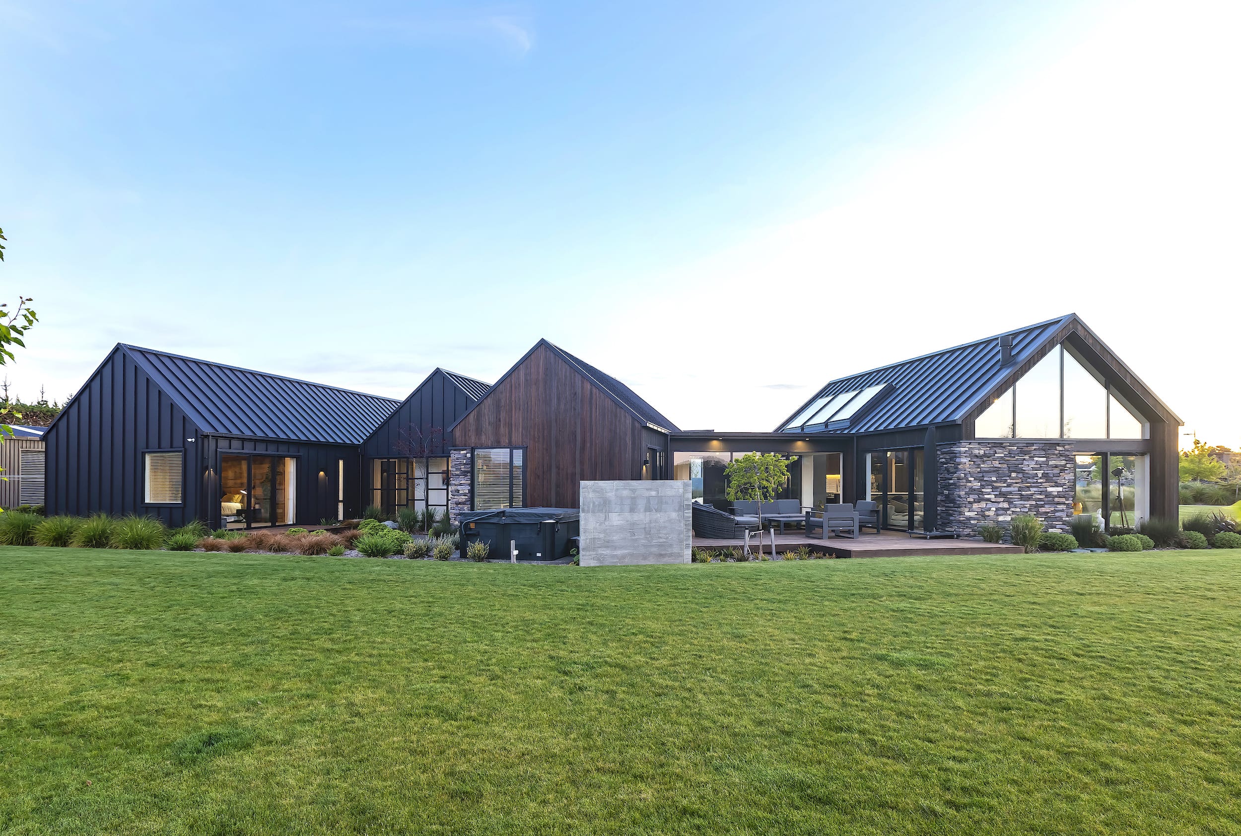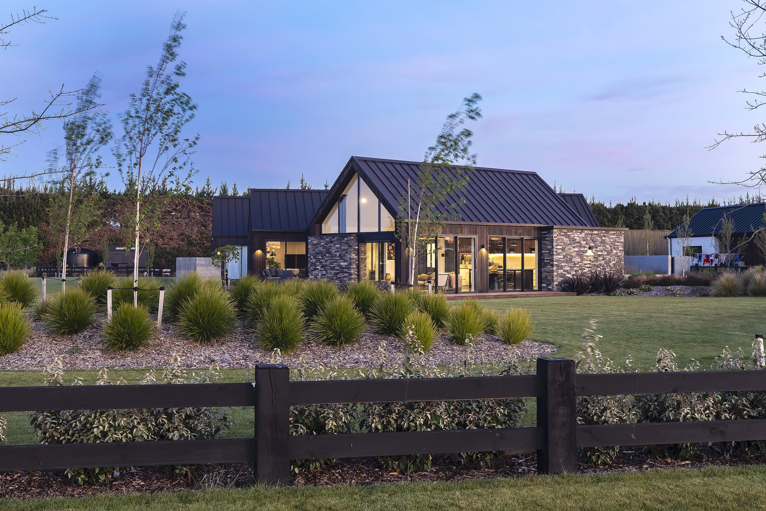 Set in the semi-rural landscape of Pemberley, Canterbury, New Zealand, this family home blends seamlessly into its surroundings with a mix of stone, metal, and timber cladding, embracing the area’s rural aesthetic.