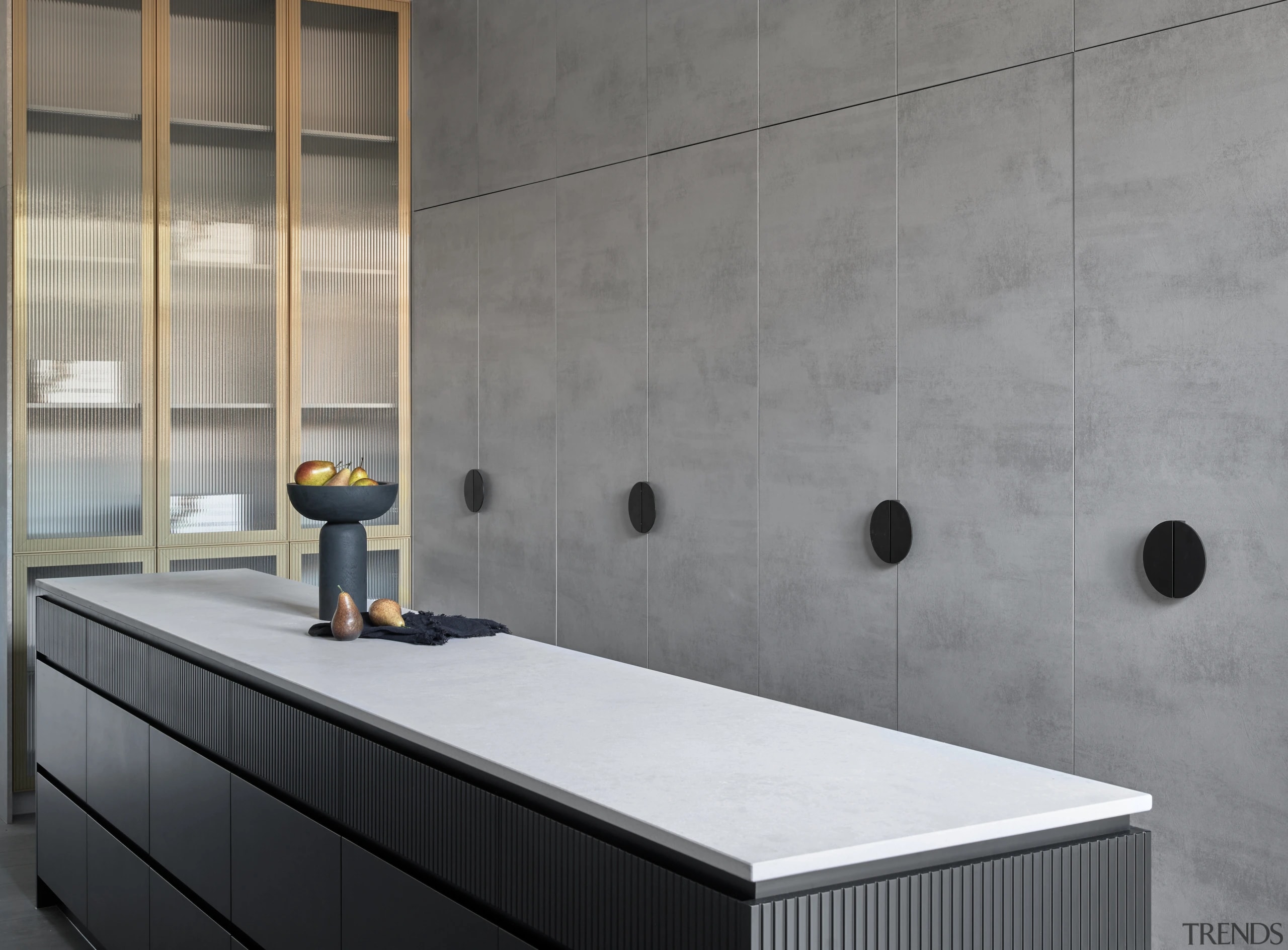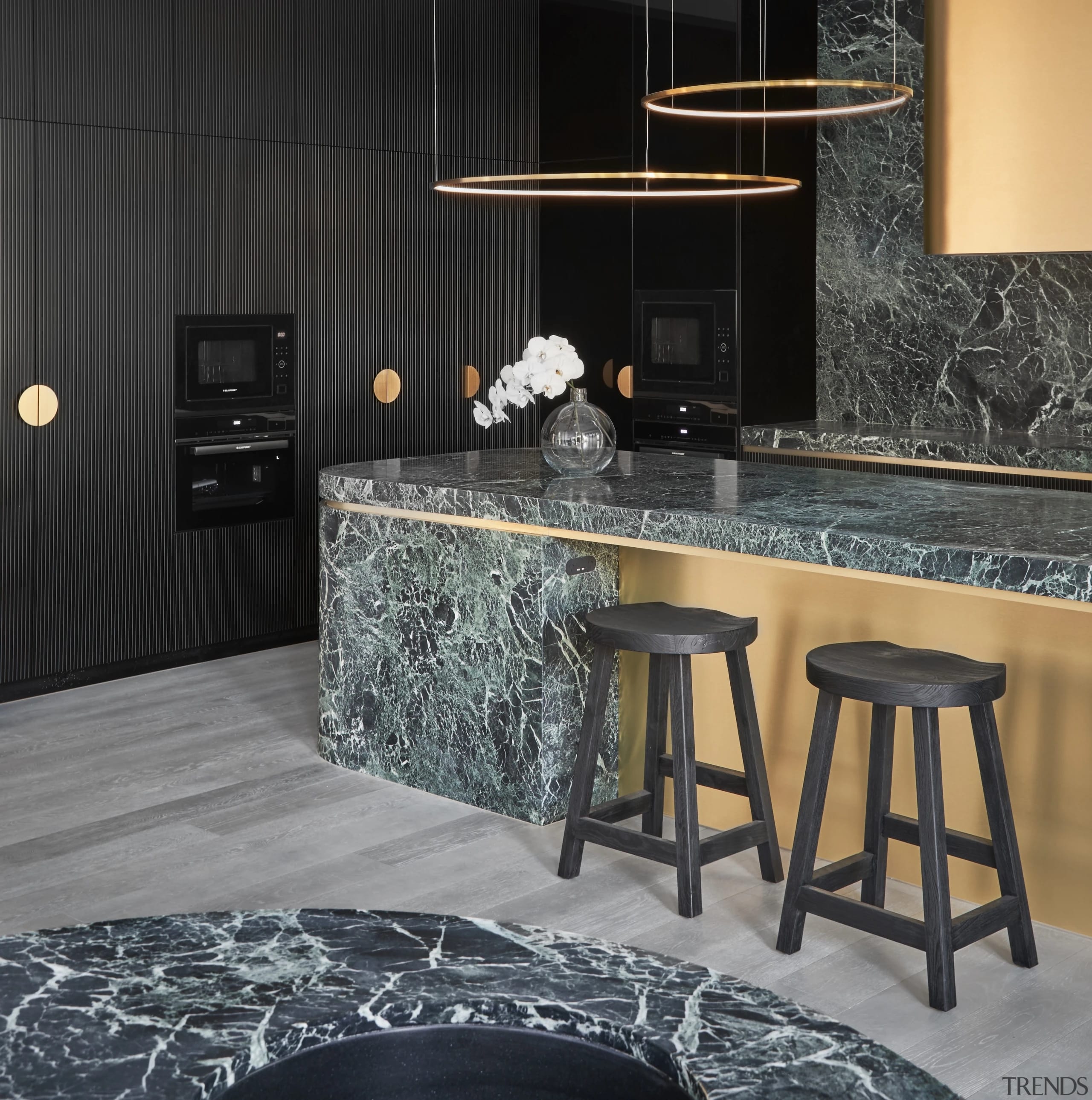 Cabinetry5mm Linear Compact-Matt Black, from Nikpol; Perfect Sense – PM Black Matt, from Nikpol; Perfect Sense – Gloss Black, from Nikpol; KronoSpan- Brushed Gold-Avant garde metal, from Nikpol; Chromix Silver; Narrow Reeded Glass, from Varidian; Caesarstone Airy Concrete | Benchtops/splashbackVerde Alpi honed marble |