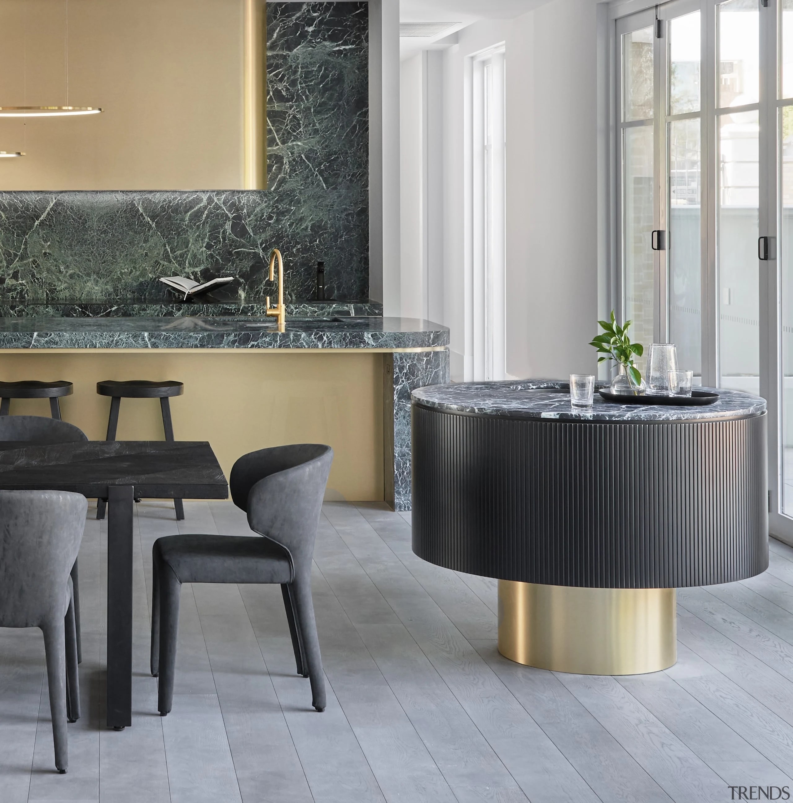 Sculptural in form, the kitchen’s refined detailing and rich material palette of Verde Alpi marble, brass and ribbed panelling amplify the culinary and dining experience.