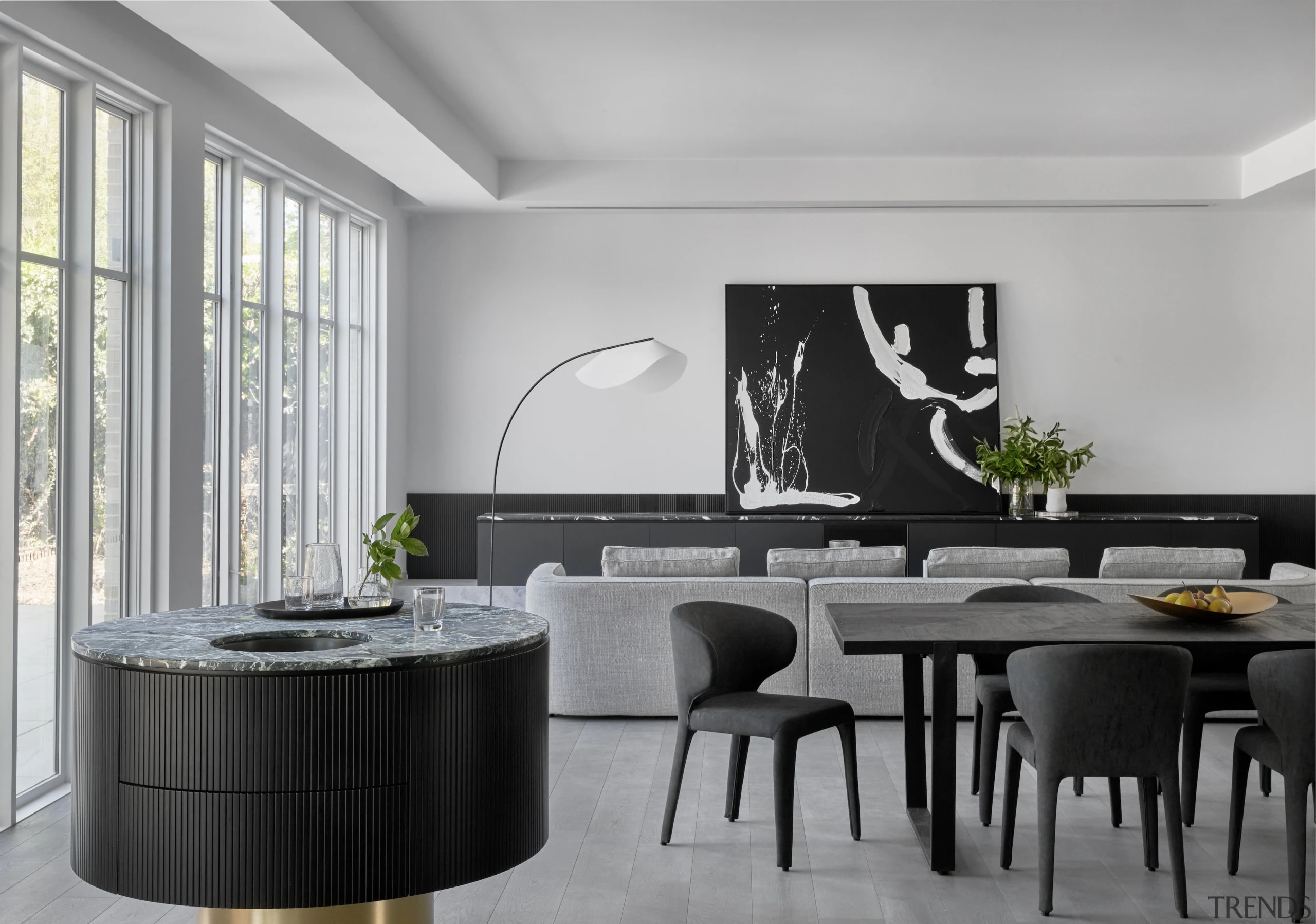 The circular servery bar-station also serves the dining and living areas while the island incorporates concealed ice storage niche within the benchtop.