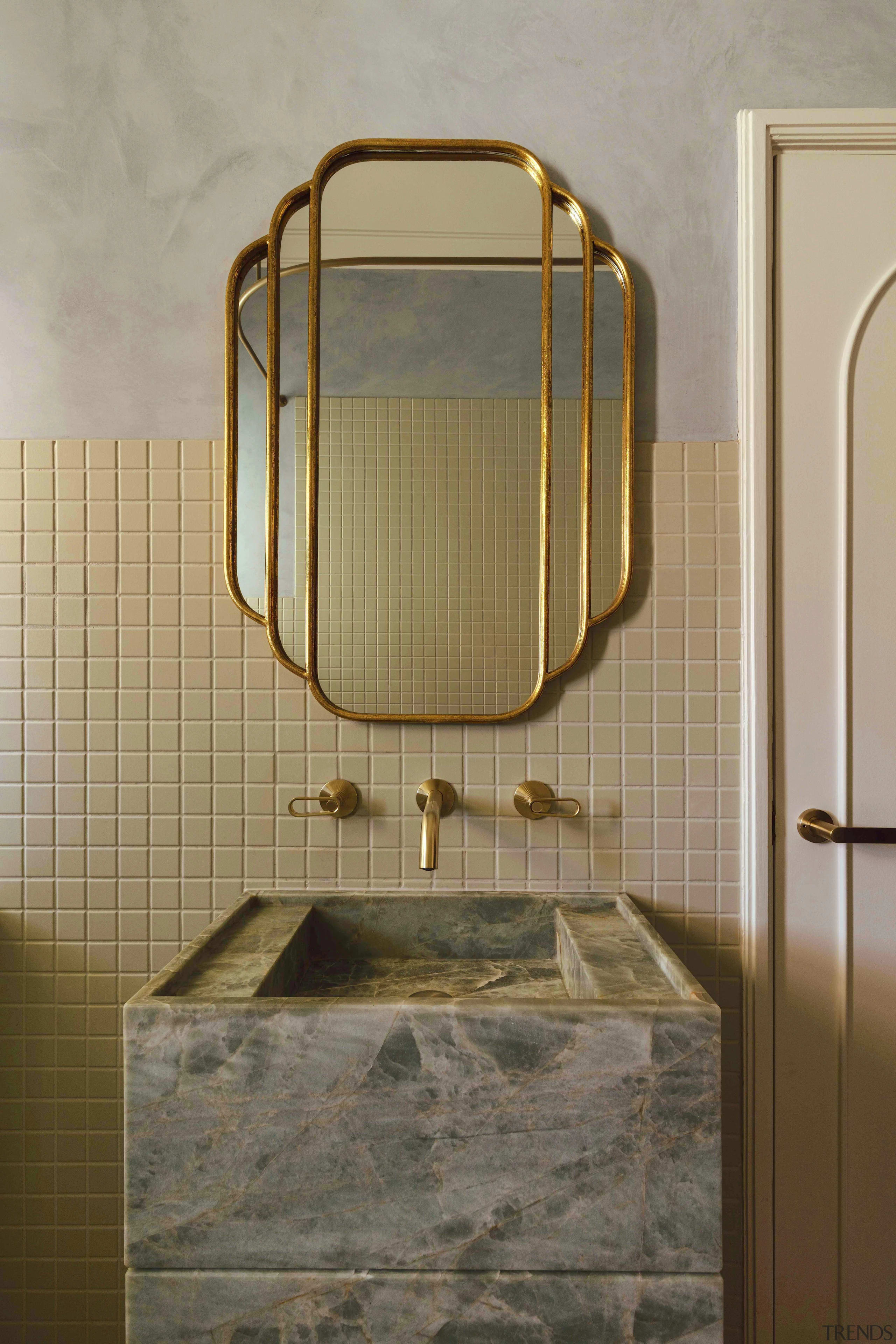 Shower railCustom designed by Atelier Bond, from Dynamic Engineering | AccessoriesFrame robe hooks, in Satin Gold, from Novas; Temple and Webster Aura Metal Wall mirror; Frame toilet roll holder, in Satin Gold, from Novas; Frame door handle – Privacy set 101, Lever round, in satin gold |