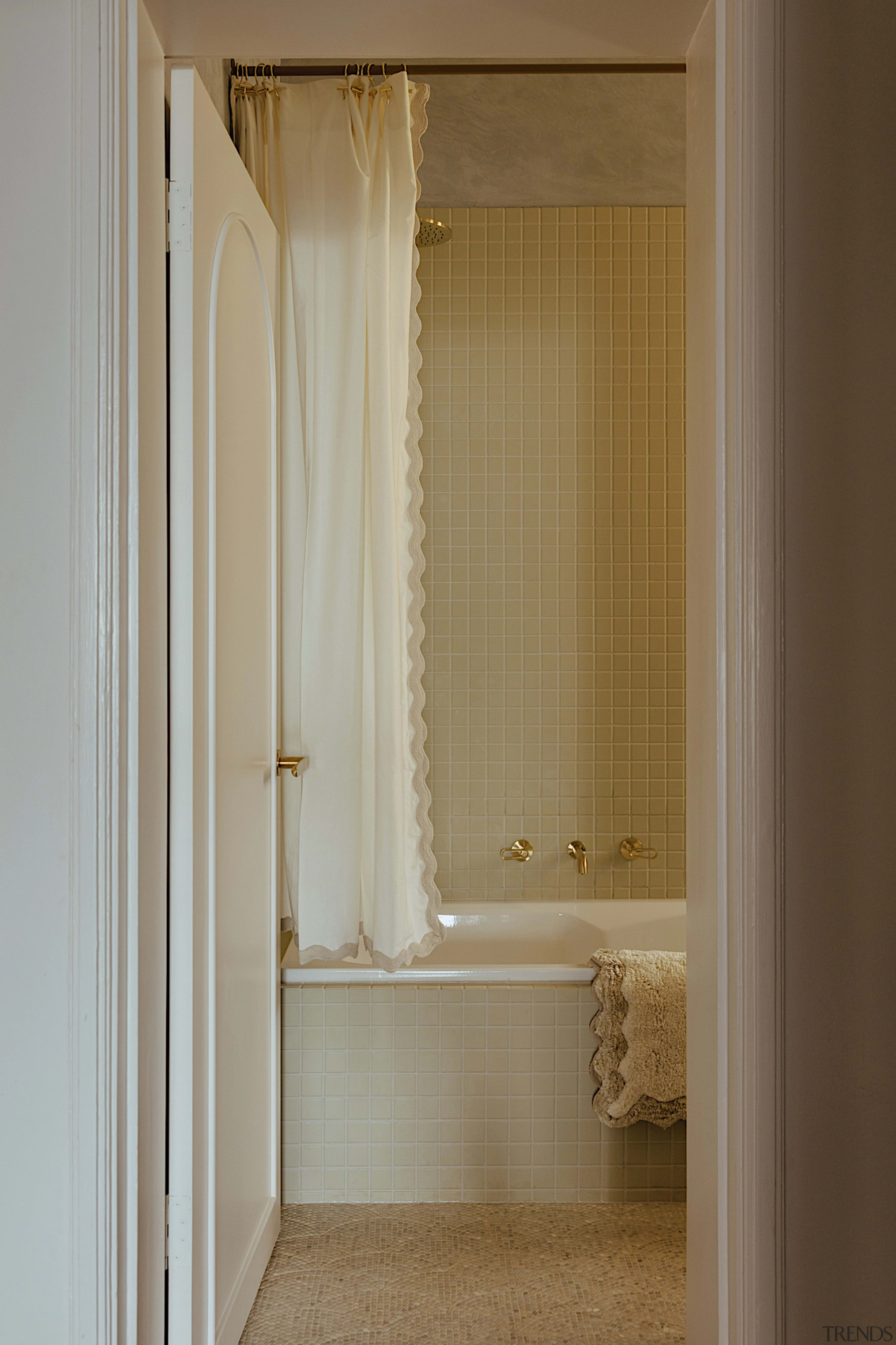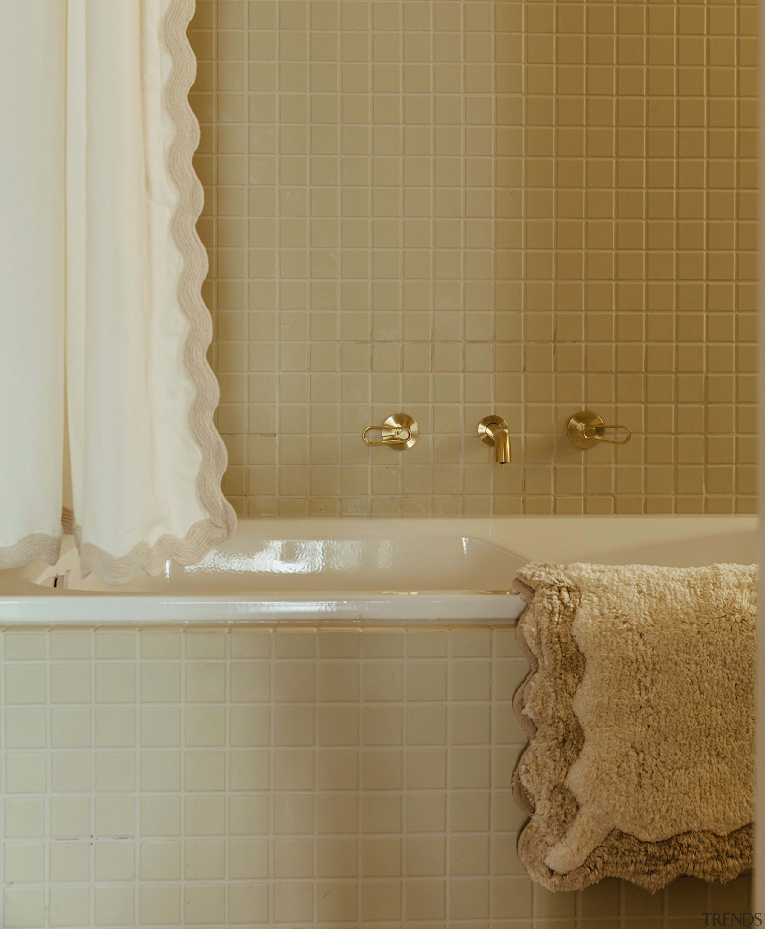 The custom shower rail echoes the soft curve of the bath hob, making the circulation space easier to navigate, and provide a nod to the Art Deco style.