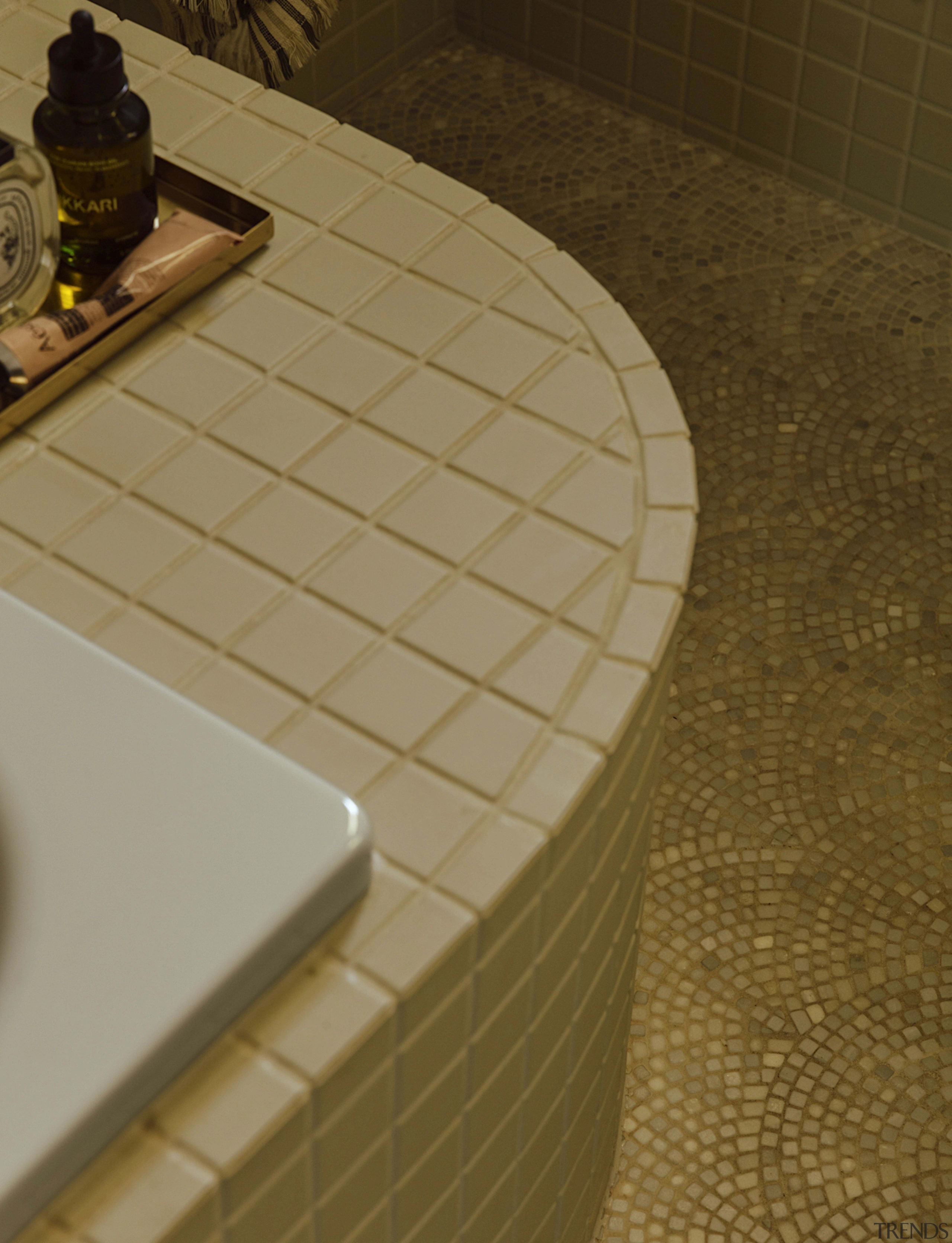 Wall tilesPlimepaplika 13802 mosaic, from Nagoya Mosaic Tile Co, Academy Tiles. | LightingParticle accent 10 w downlights, textured white finish, from Allera Lighting; French metal and glass wall sconce, sourced by Atelier Bond, supplied by Pamono, Germany. |