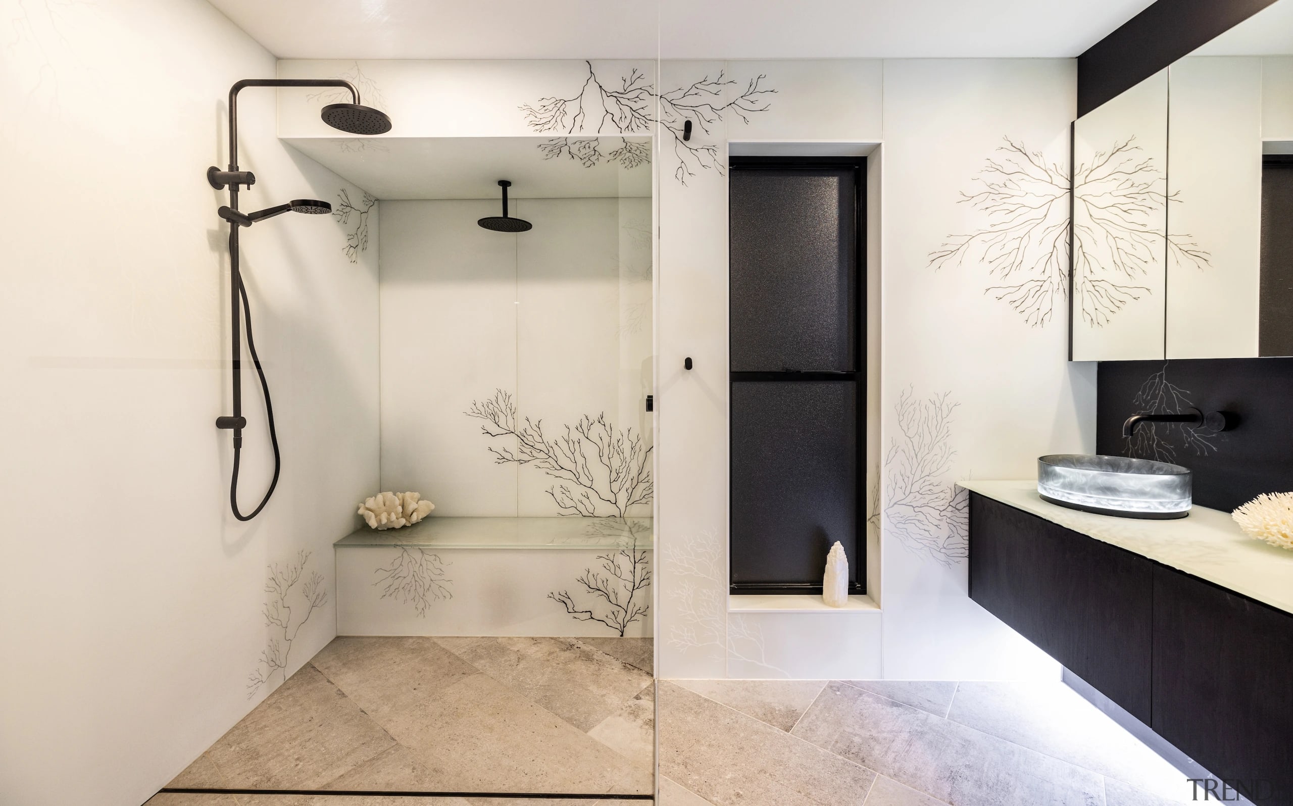 Wrapping the glass panels – with hand painted coral imagery by Lisa de Boer – around the shower ceiling and the shower bench was a challenge with the hand-painting of artwork backwards on the glass – arranged so as to achieve double reflection in vanity mirror.