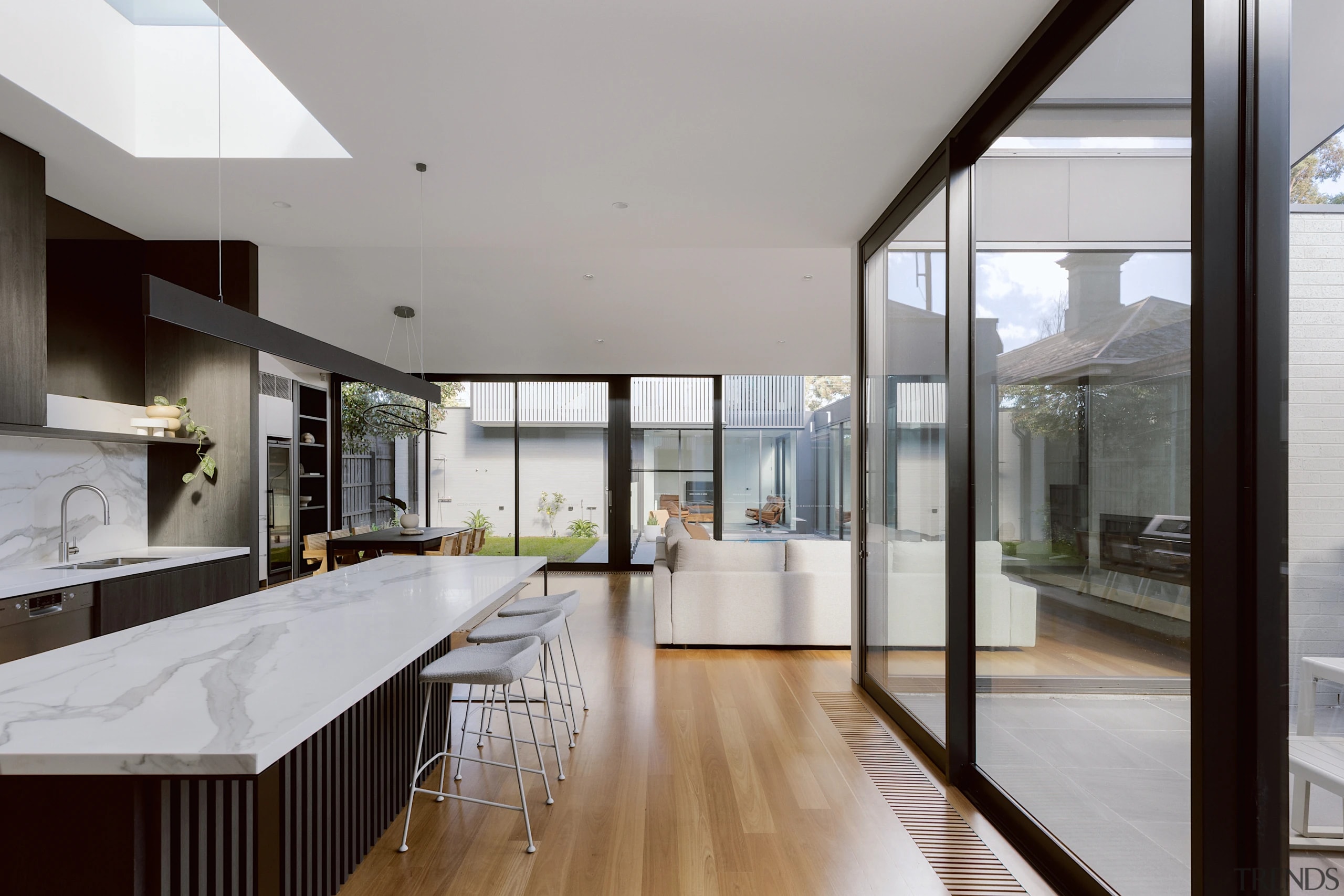 This was achieved by integrating two internal courtyards, a large kitchen skylight, and a butterfly roof form with north-facing highlight windows, ensuring a bright, inviting environment throughout the year.