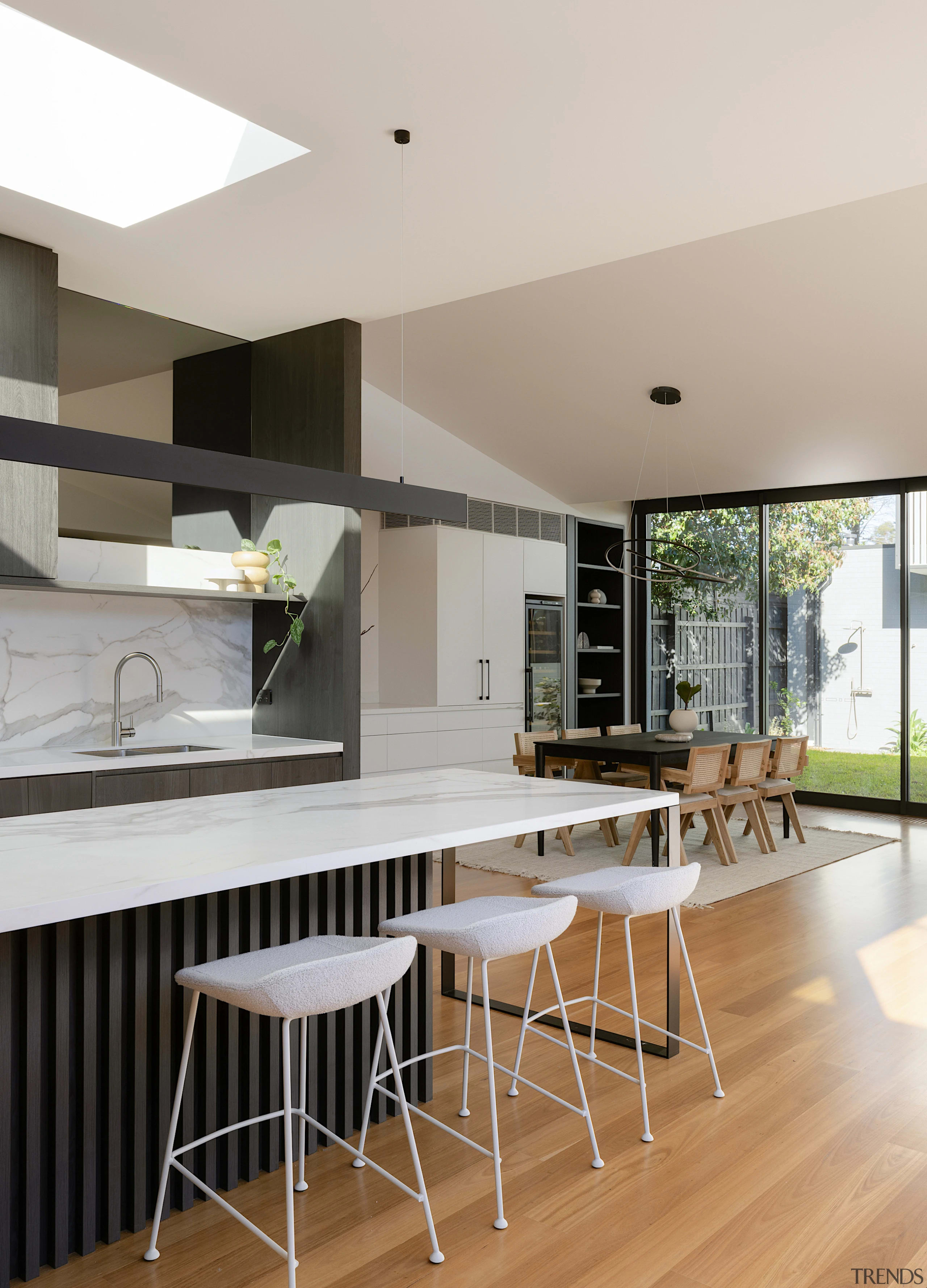 The interior design features a palette of natural blackbutt flooring, dark timber-veneered joinery, and large-format porcelain benchtops, with timber battens and mirrors adding layers of texture and visual interest.