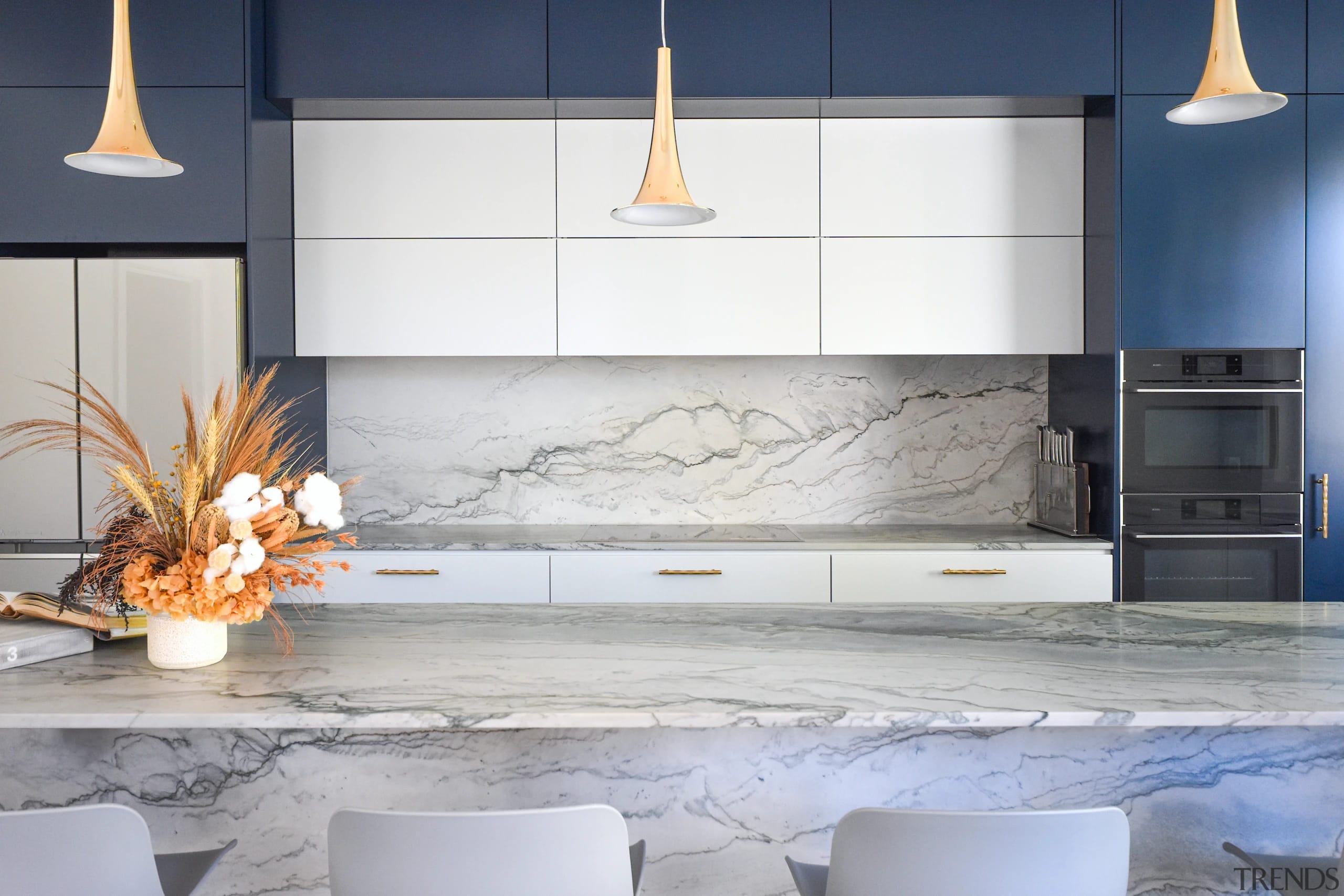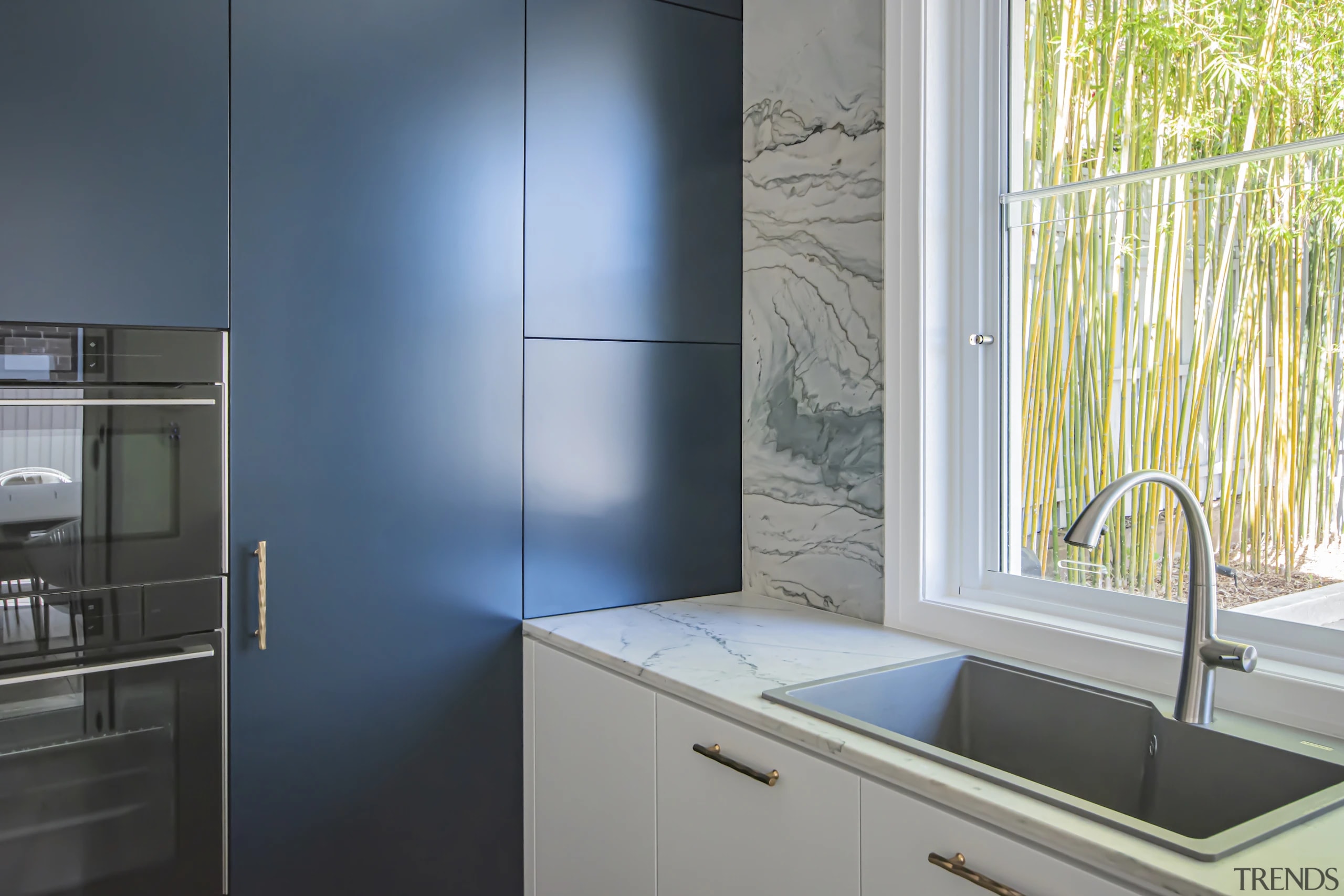 The kitchen’s aesthetic was carefully crafted to exude sophistication, with dark blue and grey cabinetry, an Olympia Quartzite Honed Block benchtop and waterproof splashback, and satin brass diamond-textured handles.