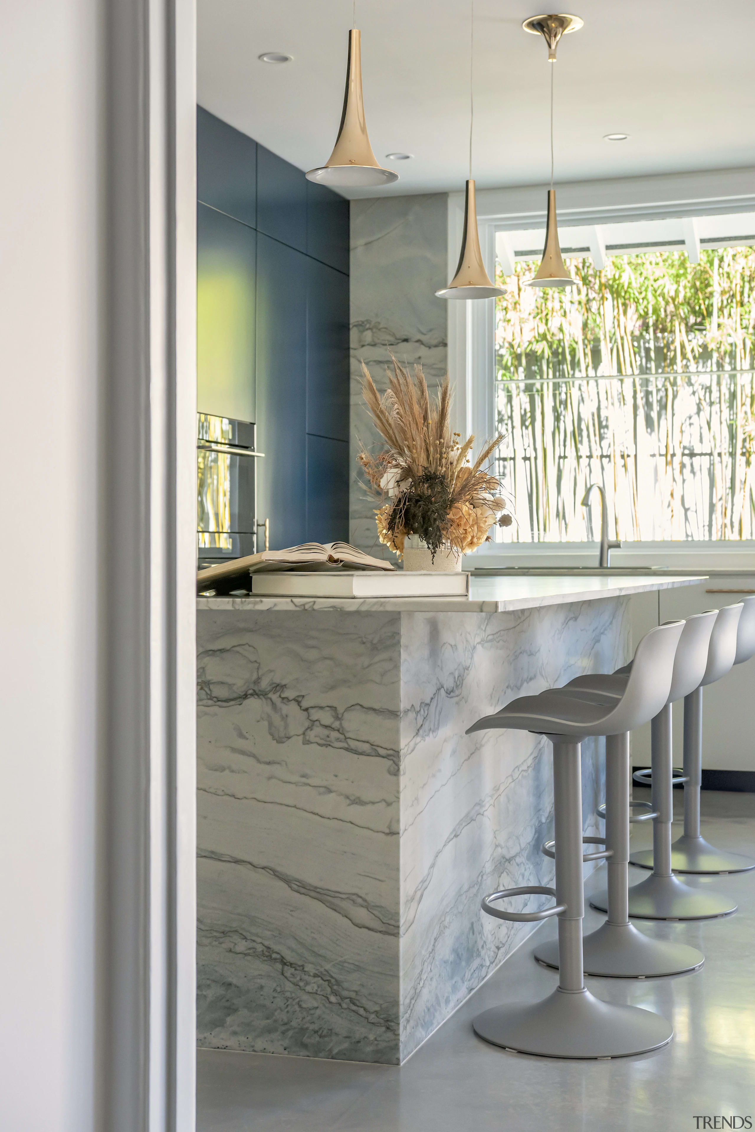 This dramatic kitchen's strong, simple lines showcase the beauty of marble while sliding doors conceal a scullery with touches of the same rich stone