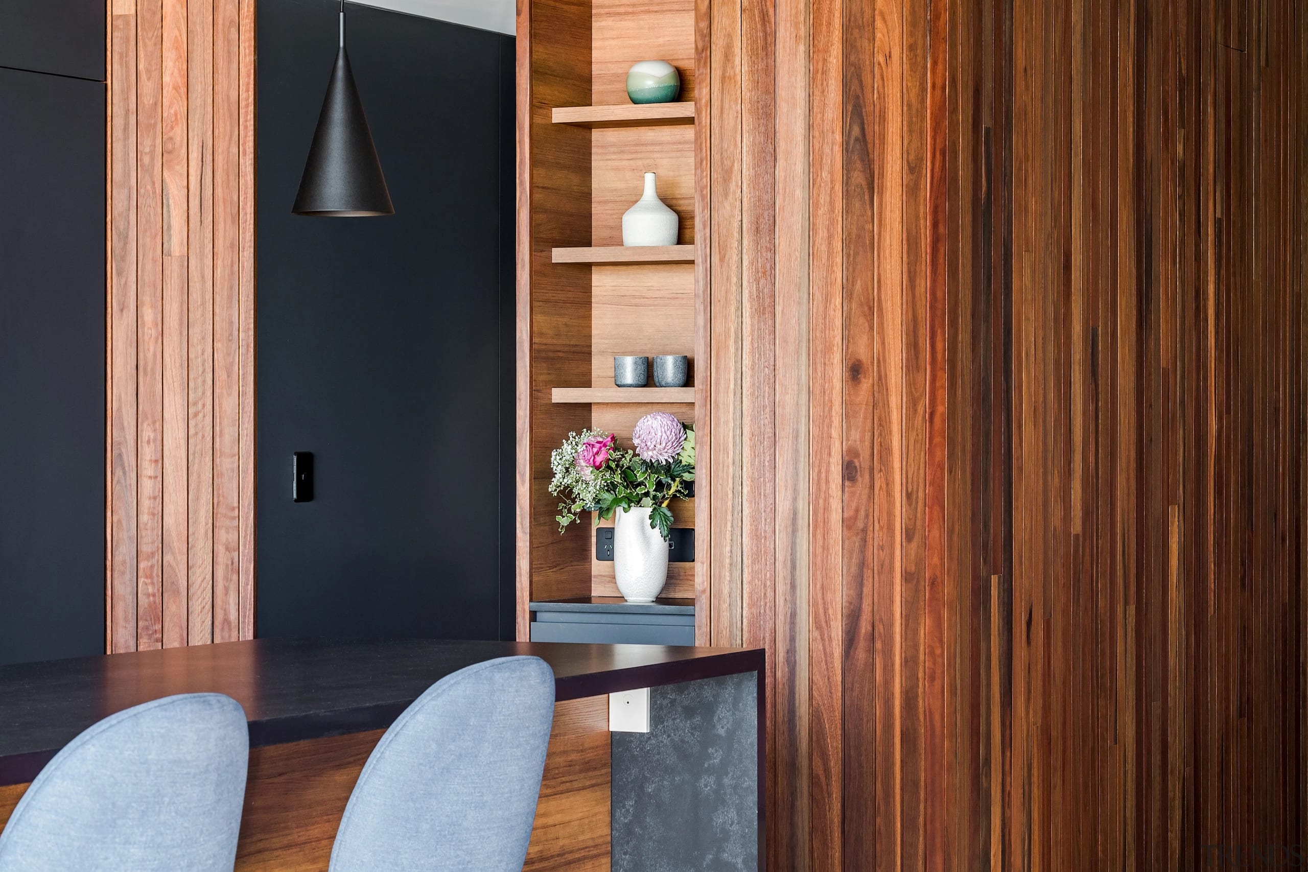 CabinetryTerril, Absolute Matte finish, by Laminex; Impressions Natural Teak, Nuance finish, by Laminex | BenchtopsCaesarstone |