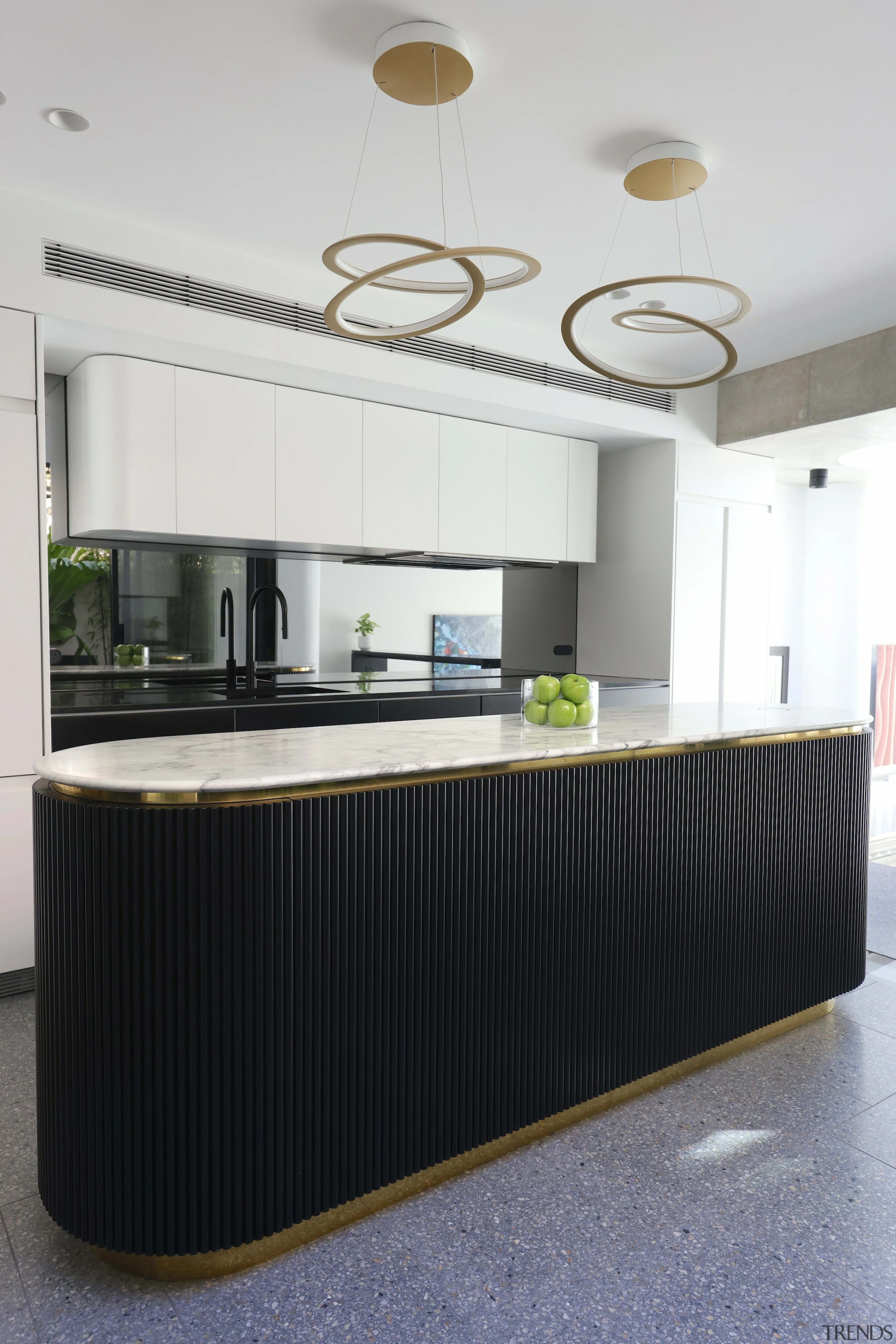 The island serves as a striking feature, resembling a custom piece of furniture that unifies the room.