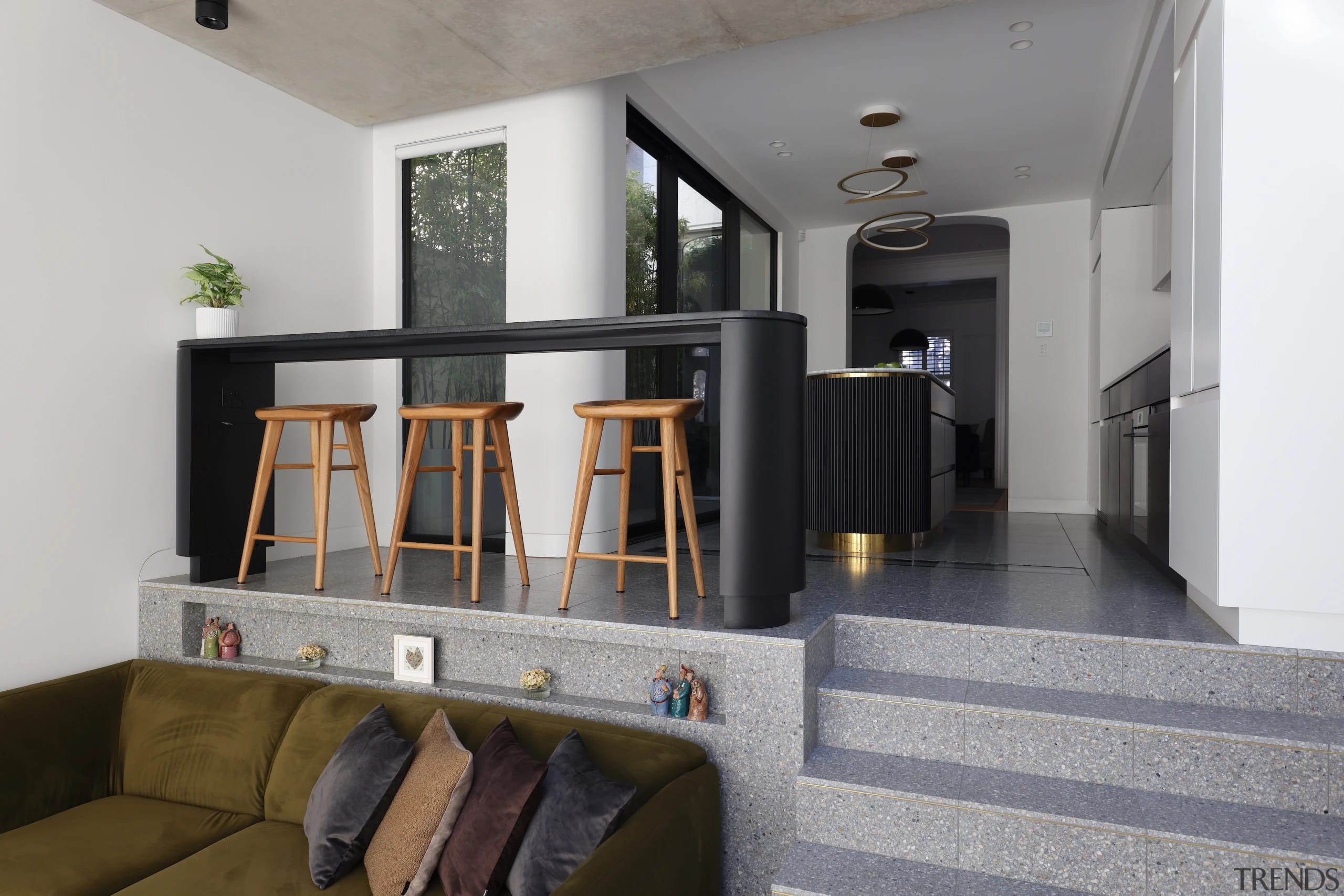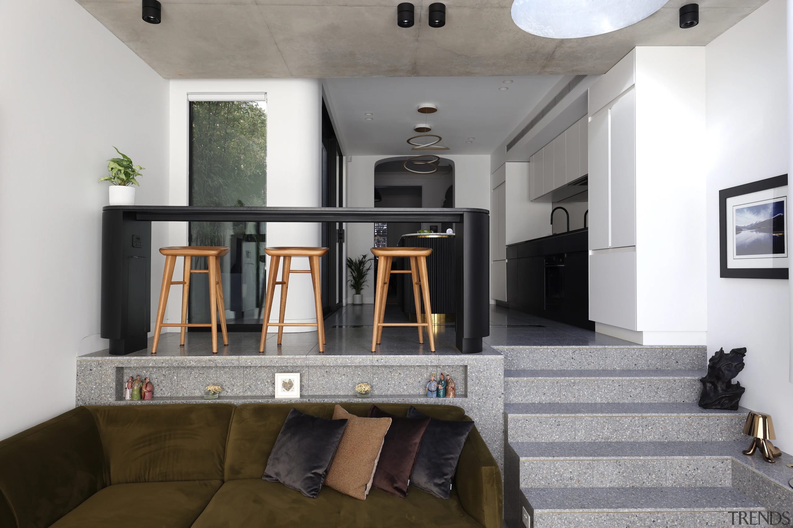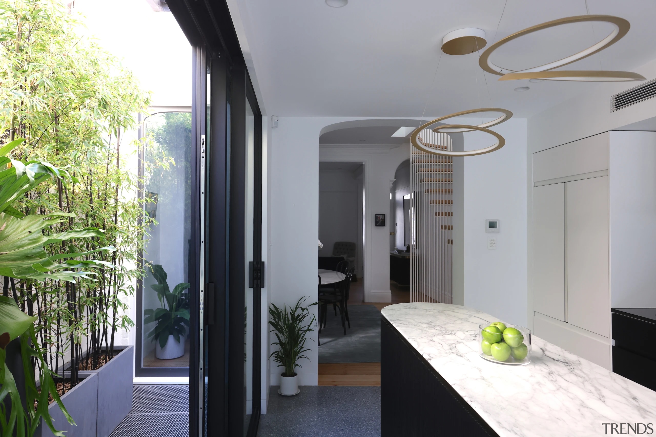 Inspired by the original Victorian arch in the hallway, a curved off-form concrete skylight floods the kitchen with natural light, creating a bright and inviting atmosphere. Large windows & sliding doors with strategically placed greenery further blur the