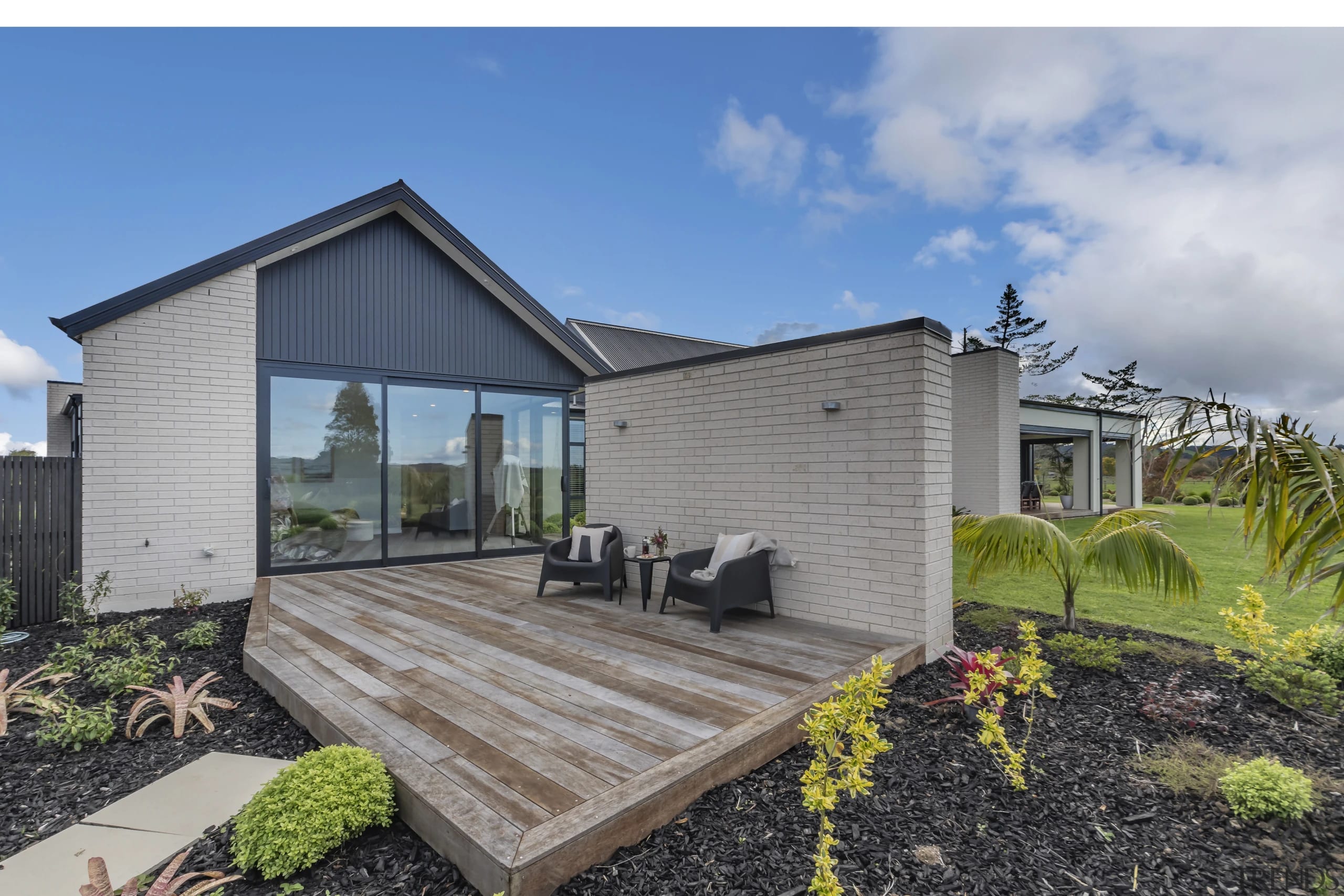Brick elements assist in anchoring the home, with complementary plaster cladding and contrasting dark vertical weatherboards.