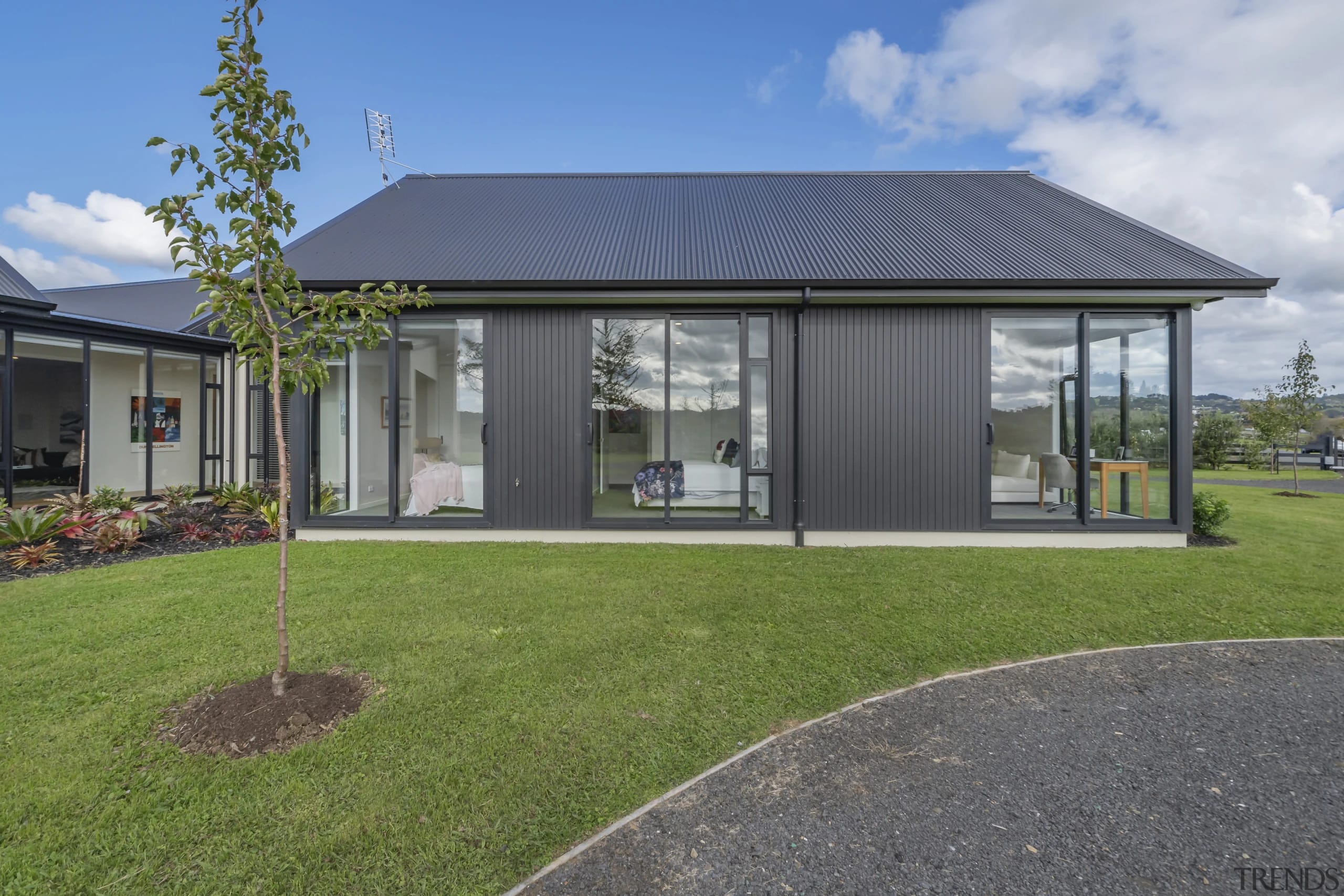 This home is characterised by its primary gable forms and secondary low-pitched roof forms.