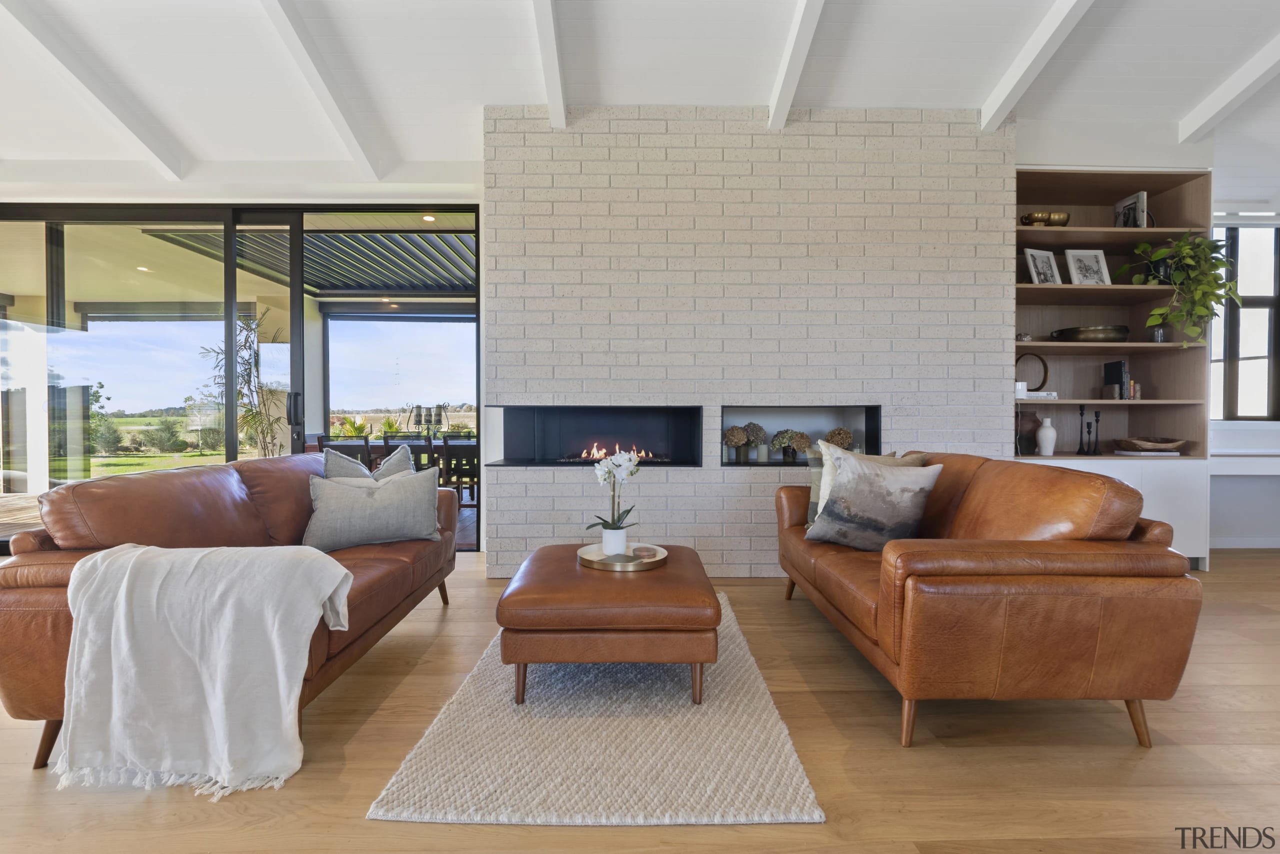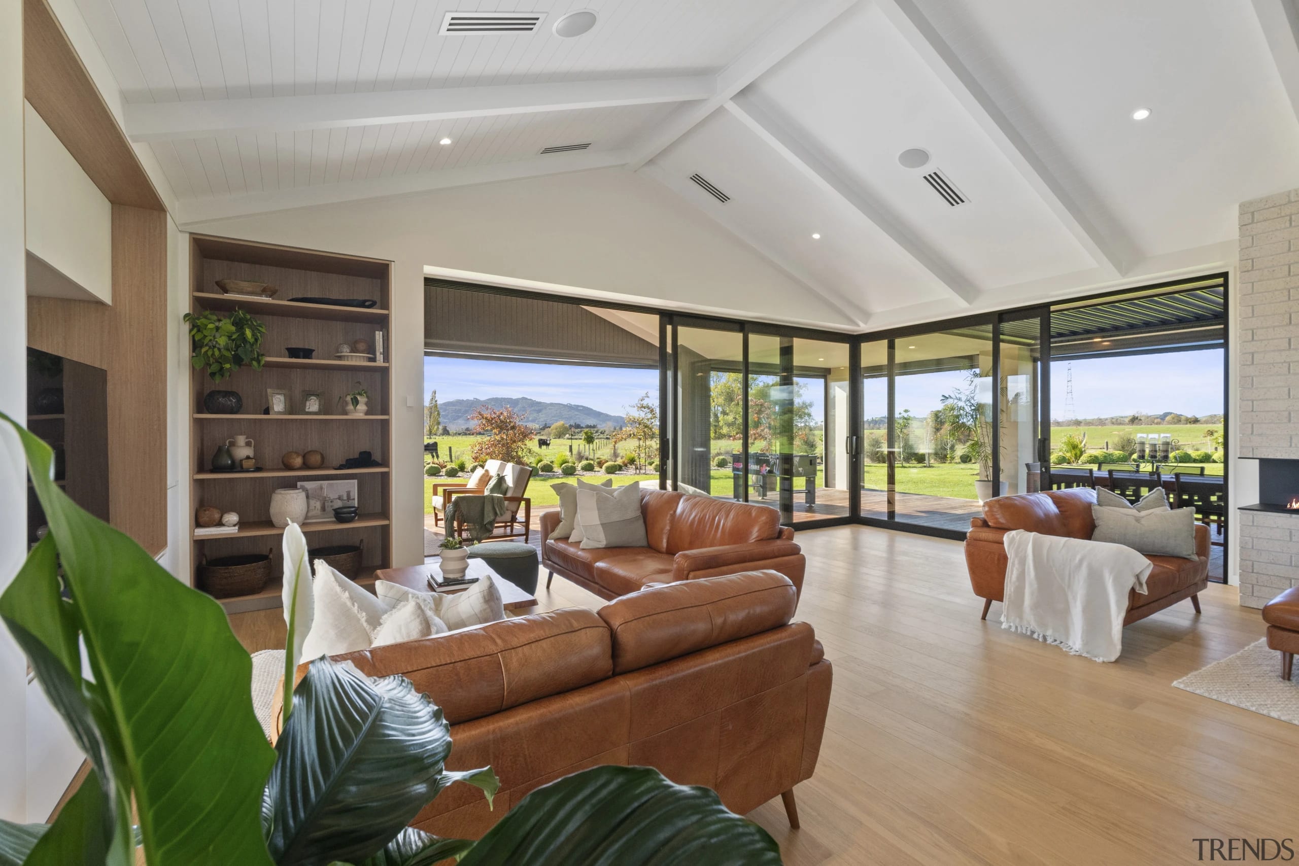 This architecturally designed 475m² home, with its three wings wrapped in brick, plaster, and vertical aluminium, blends seamlessly into its picturesque rural setting just south of Auckland.